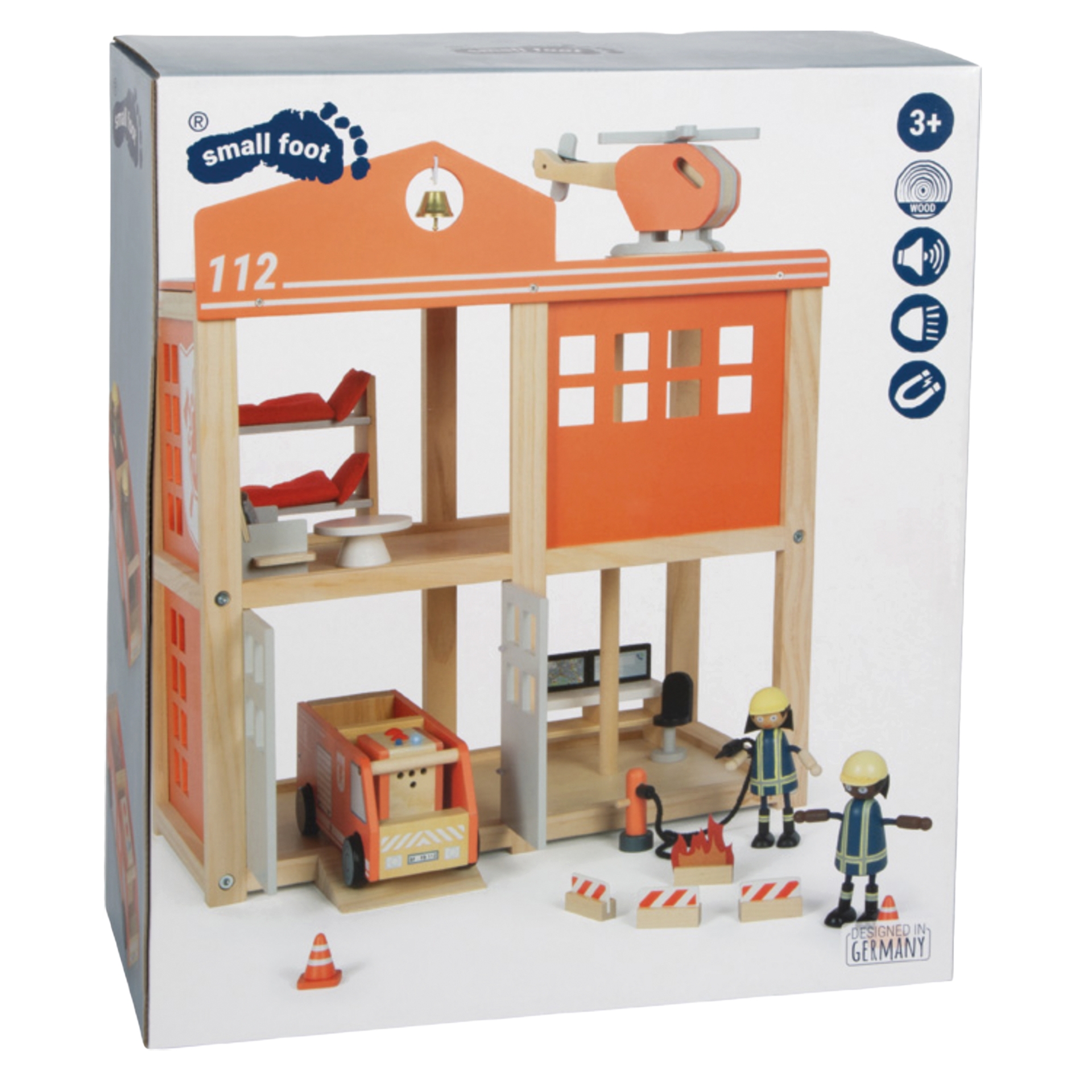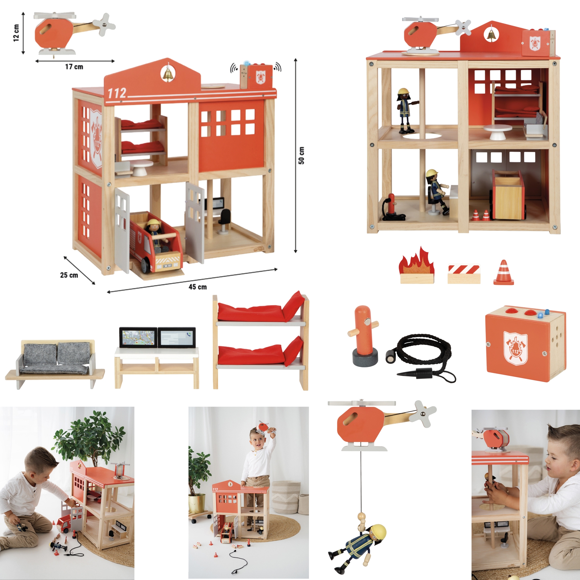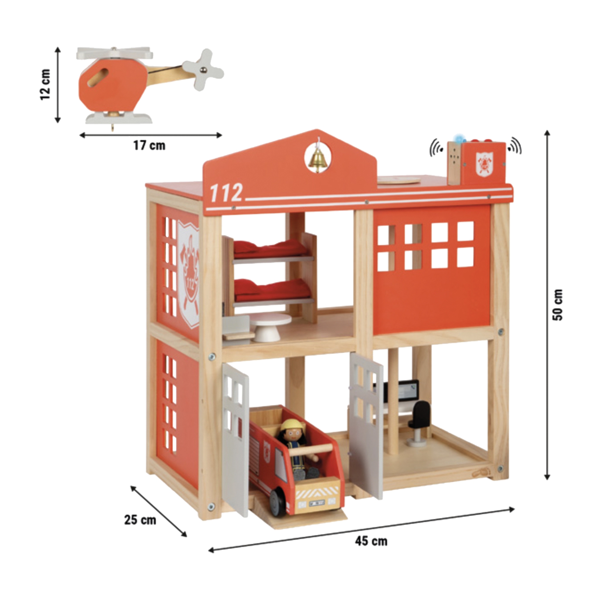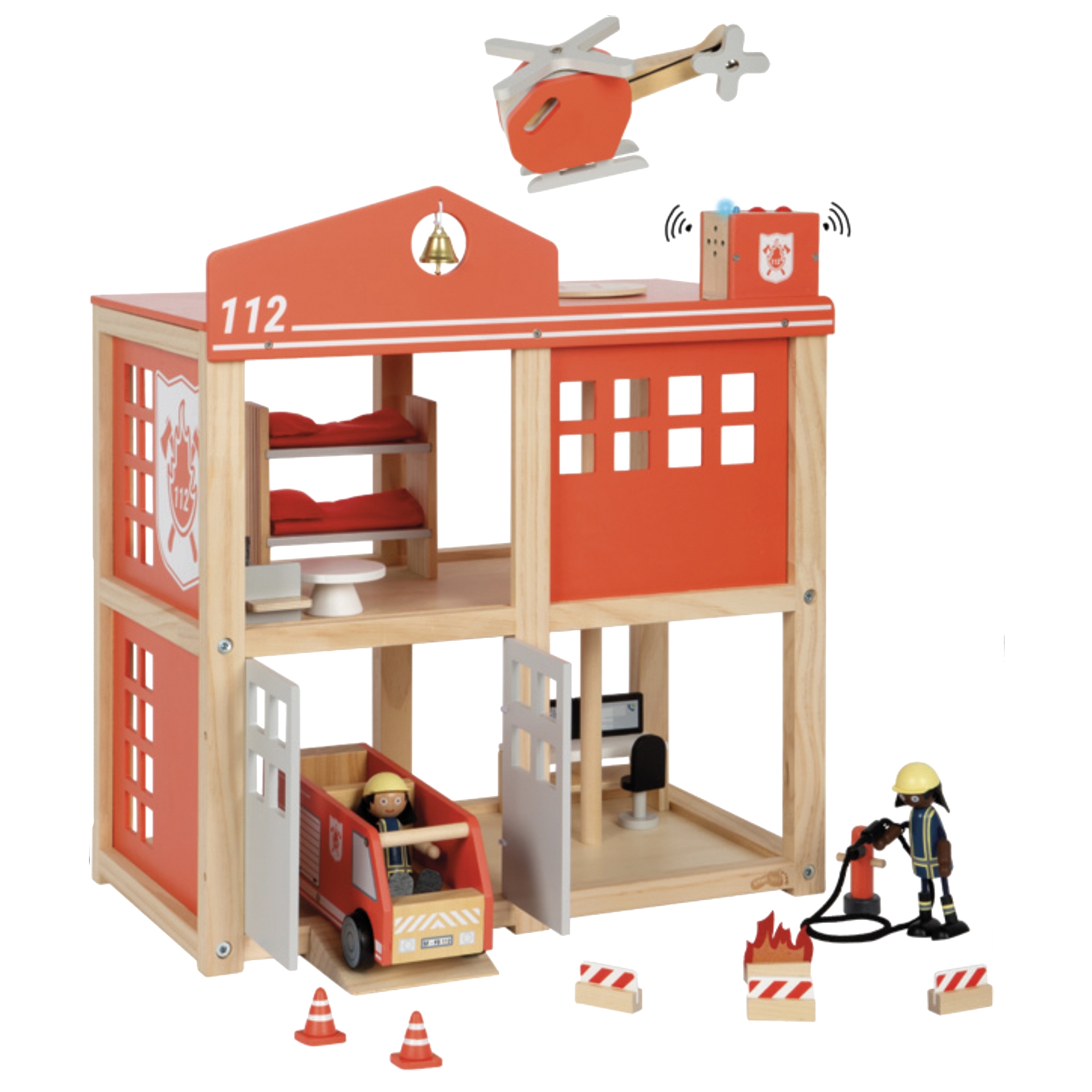 Zum umfangreichen Zubehör zählt ein batteriebetriebenes Sound- & Lichtmodul für realistische Einsätze, ein Feuerwehrauto, ein Hubschrauber mit Seilwinde, zwei Biegepuppen sowie ein Hydrant mit Schlauch, Feueraufsteller, Pylonen, Absperrgitter, eine möblierte Kommandozentrale plus Aufenthaltsraum mit Stockbett, Sofa und Couchtisch. Der Werkstattbereich ist mit Gummiband-Türen und einer Rampe zum Einfahren ausgestattet.Achtung! Nicht geeignet für Kinder unter 36 Monaten!
