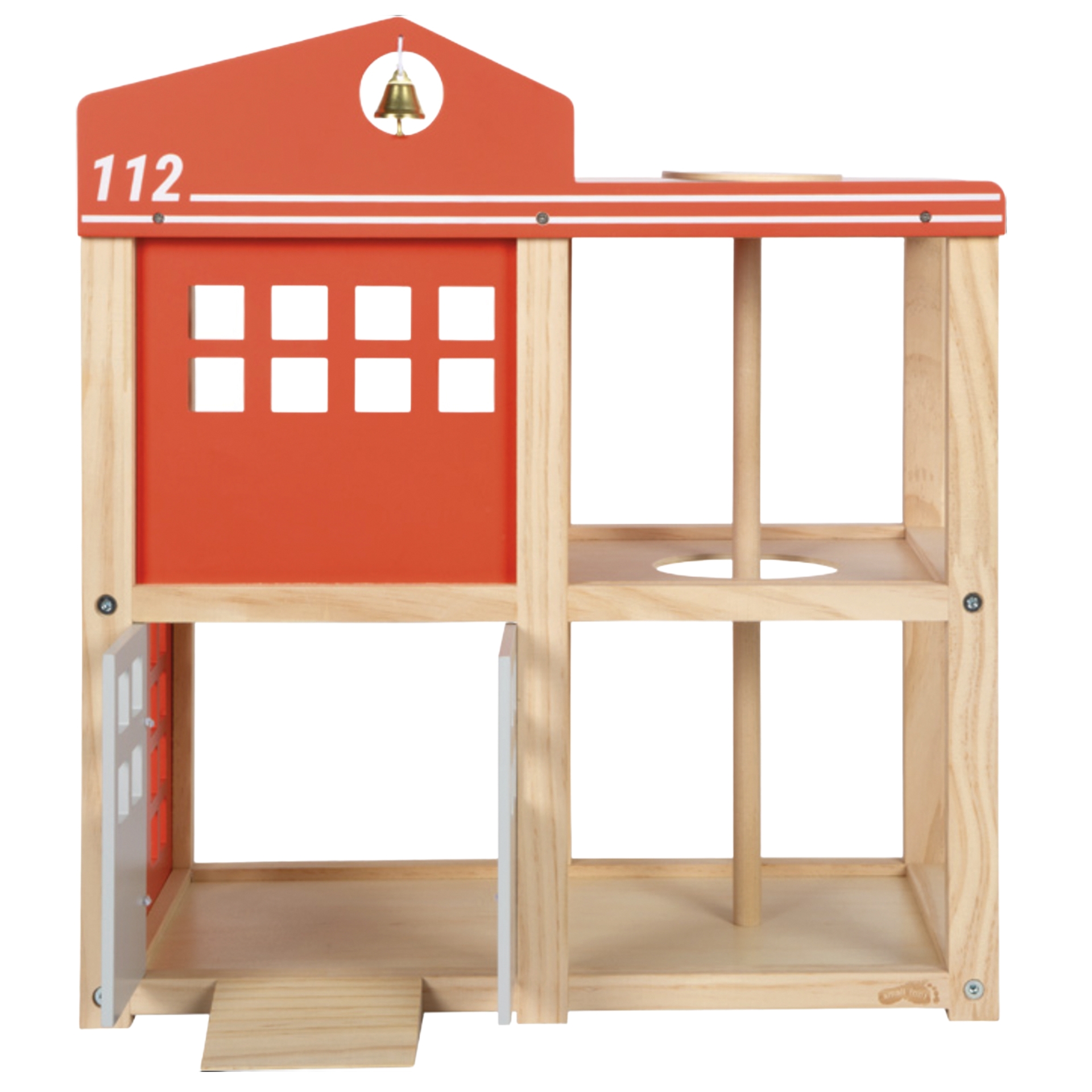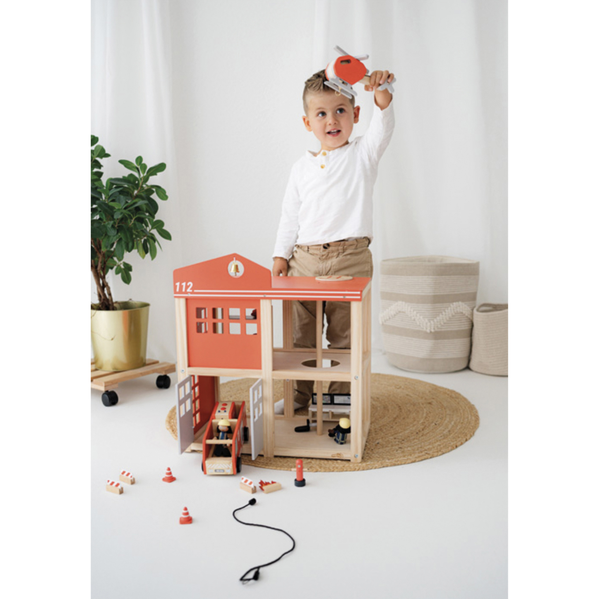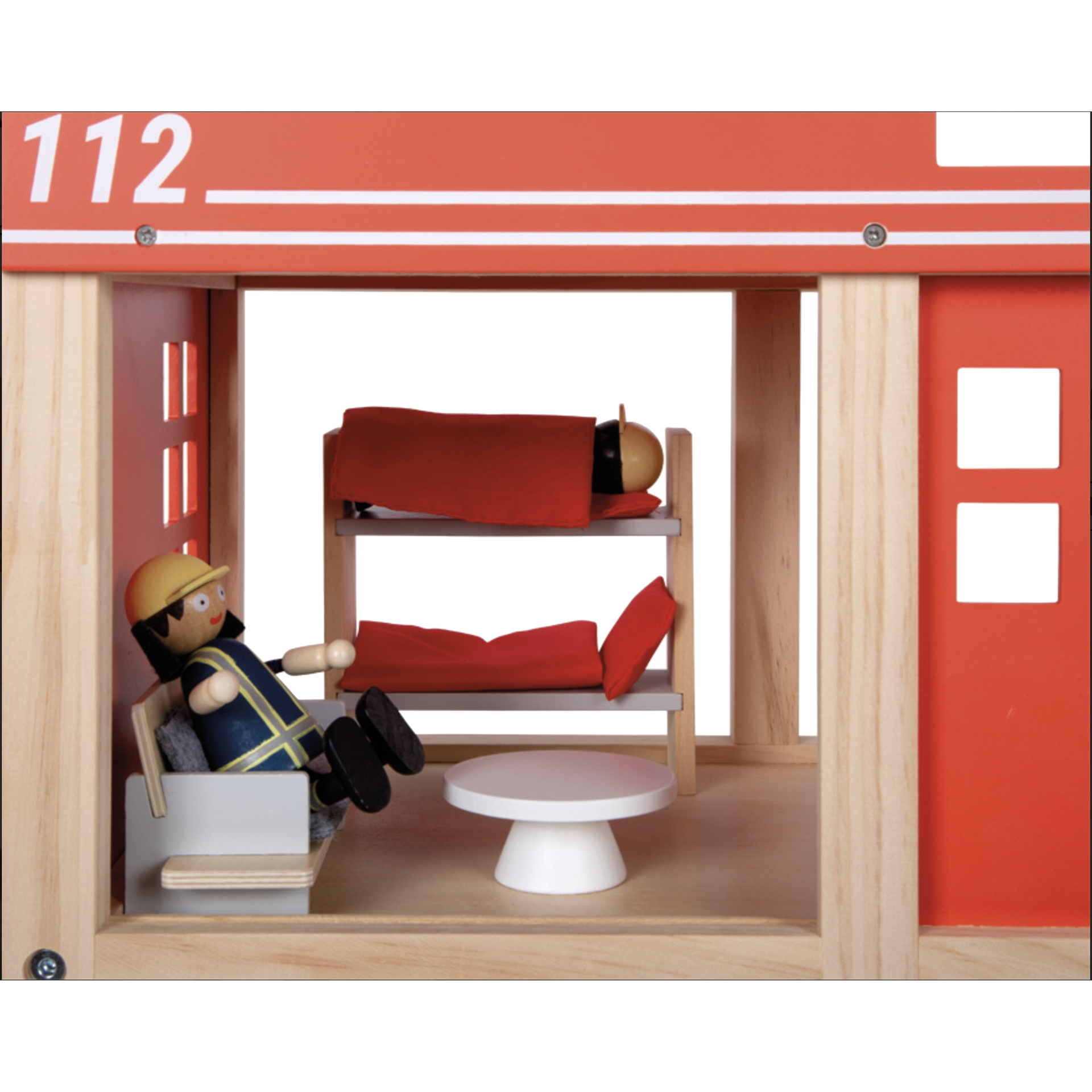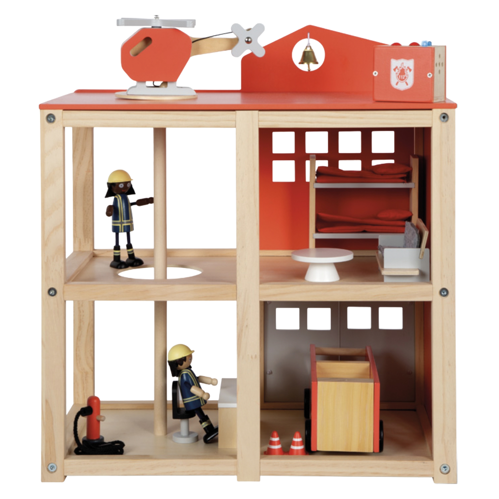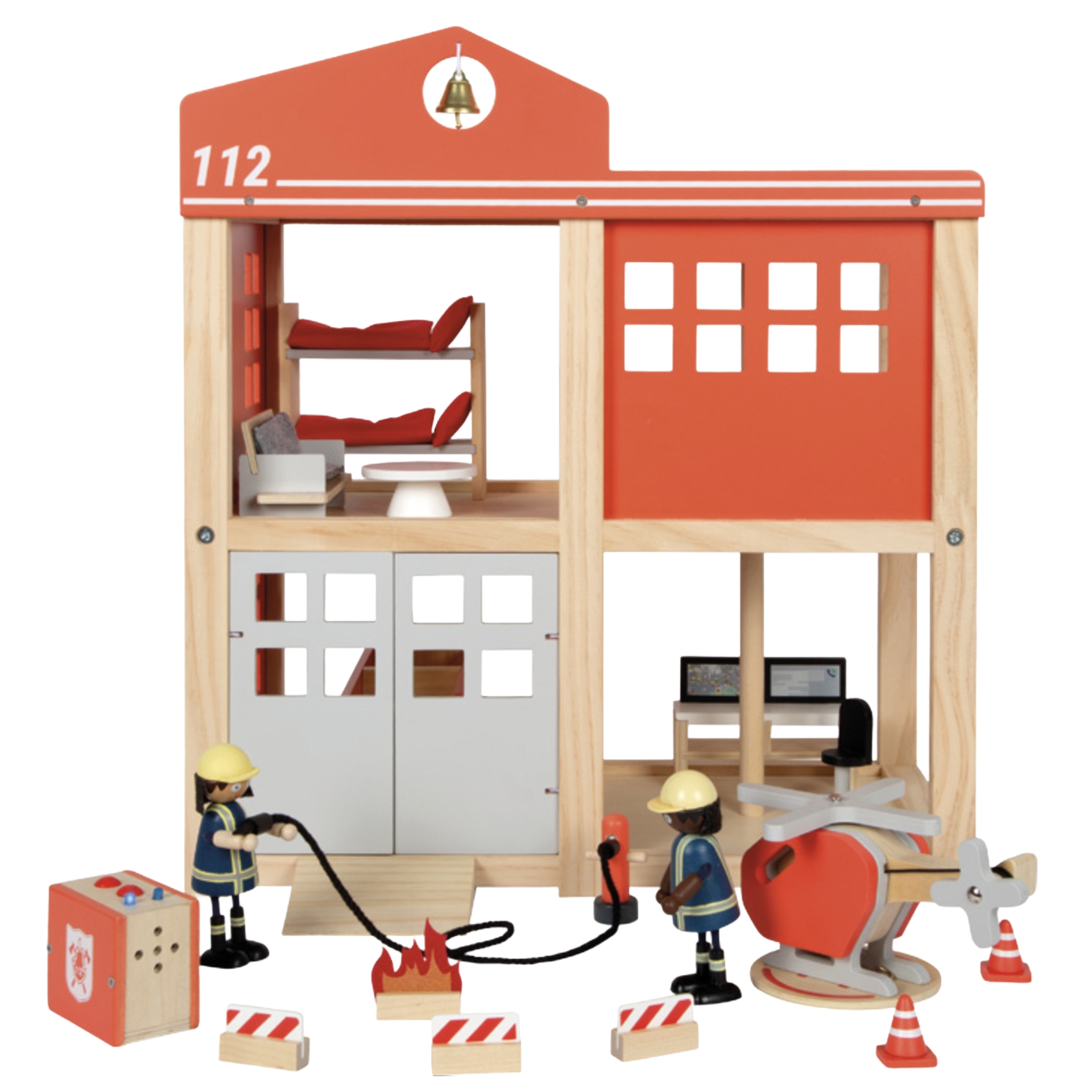Zum umfangreichen Zubehör zählt ein batteriebetriebenes Sound- & Lichtmodul für realistische Einsätze, ein Feuerwehrauto, ein Hubschrauber mit Seilwinde, zwei Biegepuppen sowie ein Hydrant mit Schlauch, Feueraufsteller, Pylonen, Absperrgitter, eine möblierte Kommandozentrale plus Aufenthaltsraum mit Stockbett, Sofa und Couchtisch. Der Werkstattbereich ist mit Gummiband-Türen und einer Rampe zum Einfahren ausgestattet.Achtung! Nicht geeignet für Kinder unter 36 Monaten!
