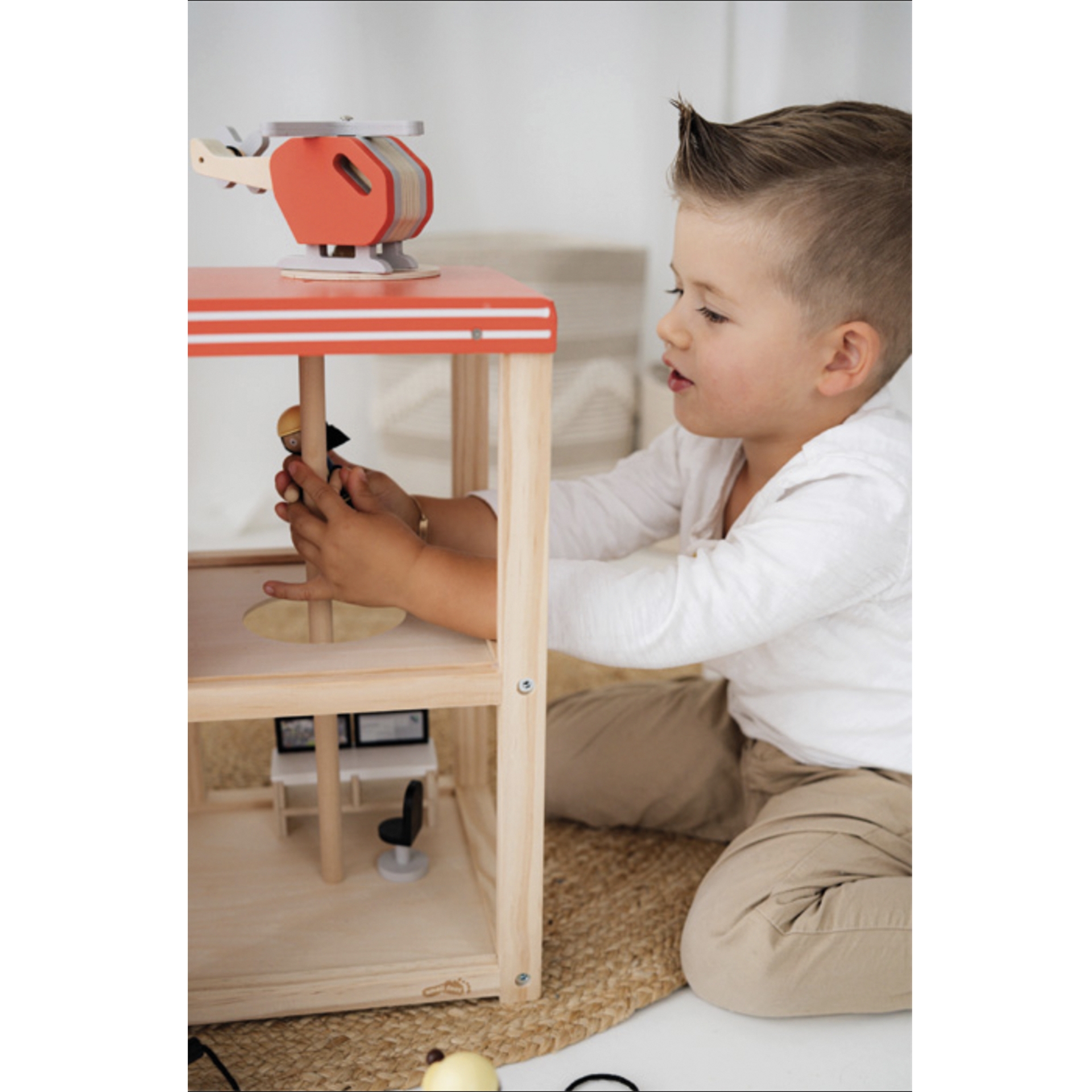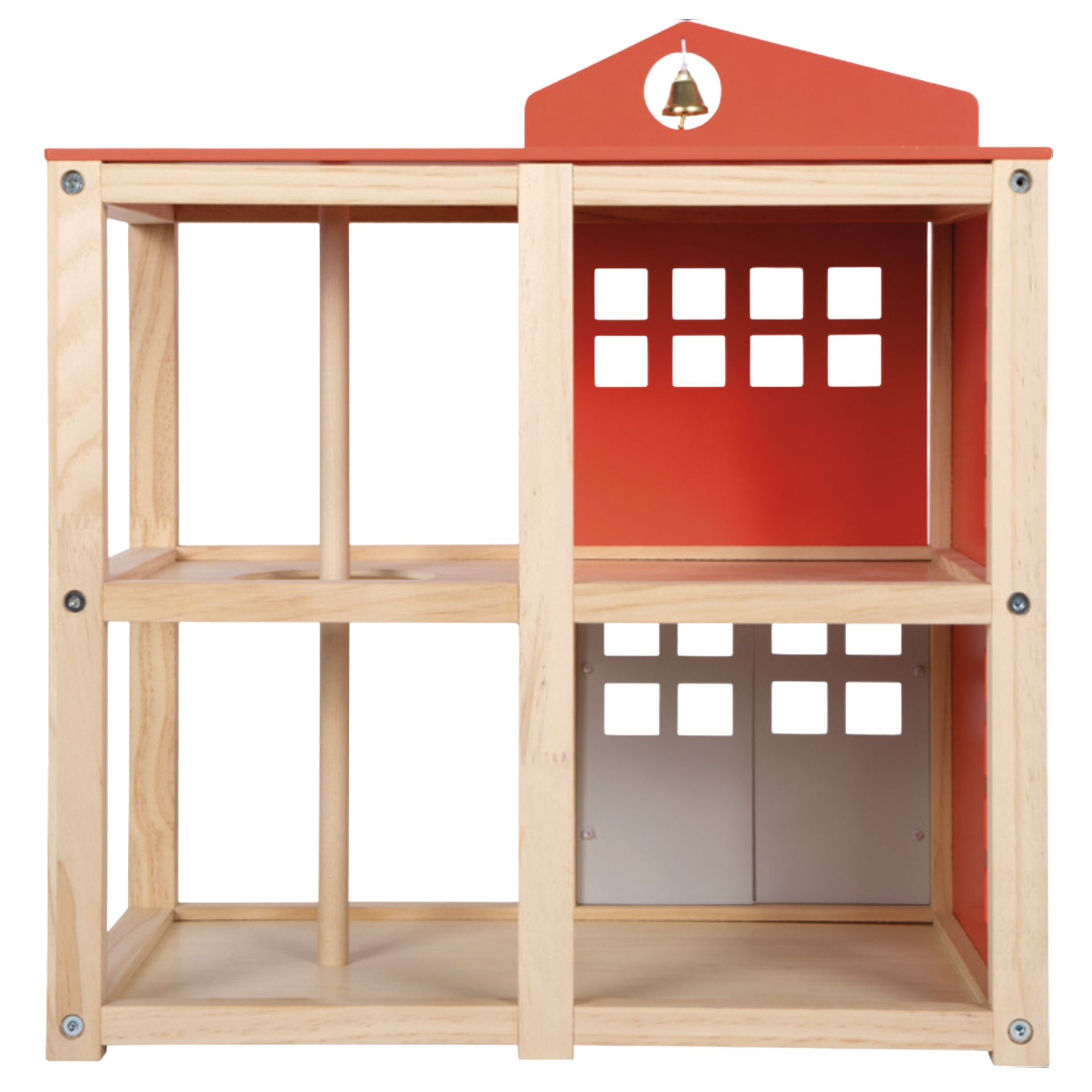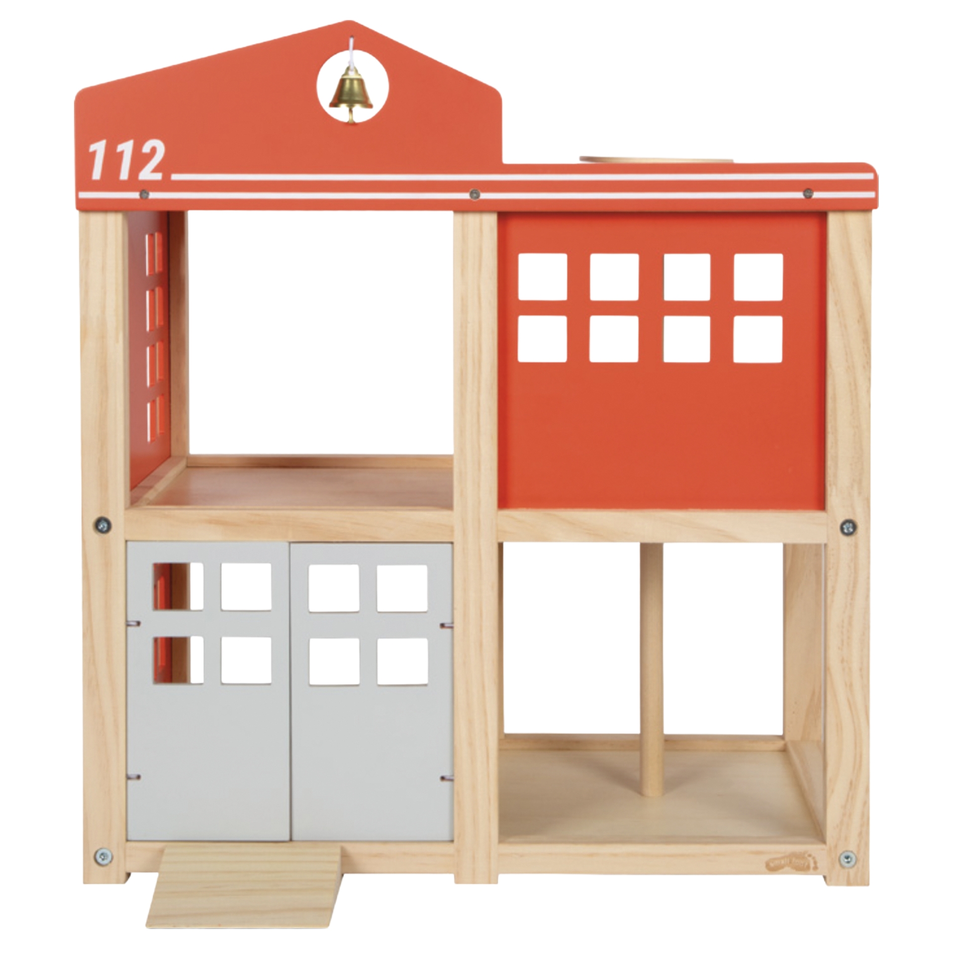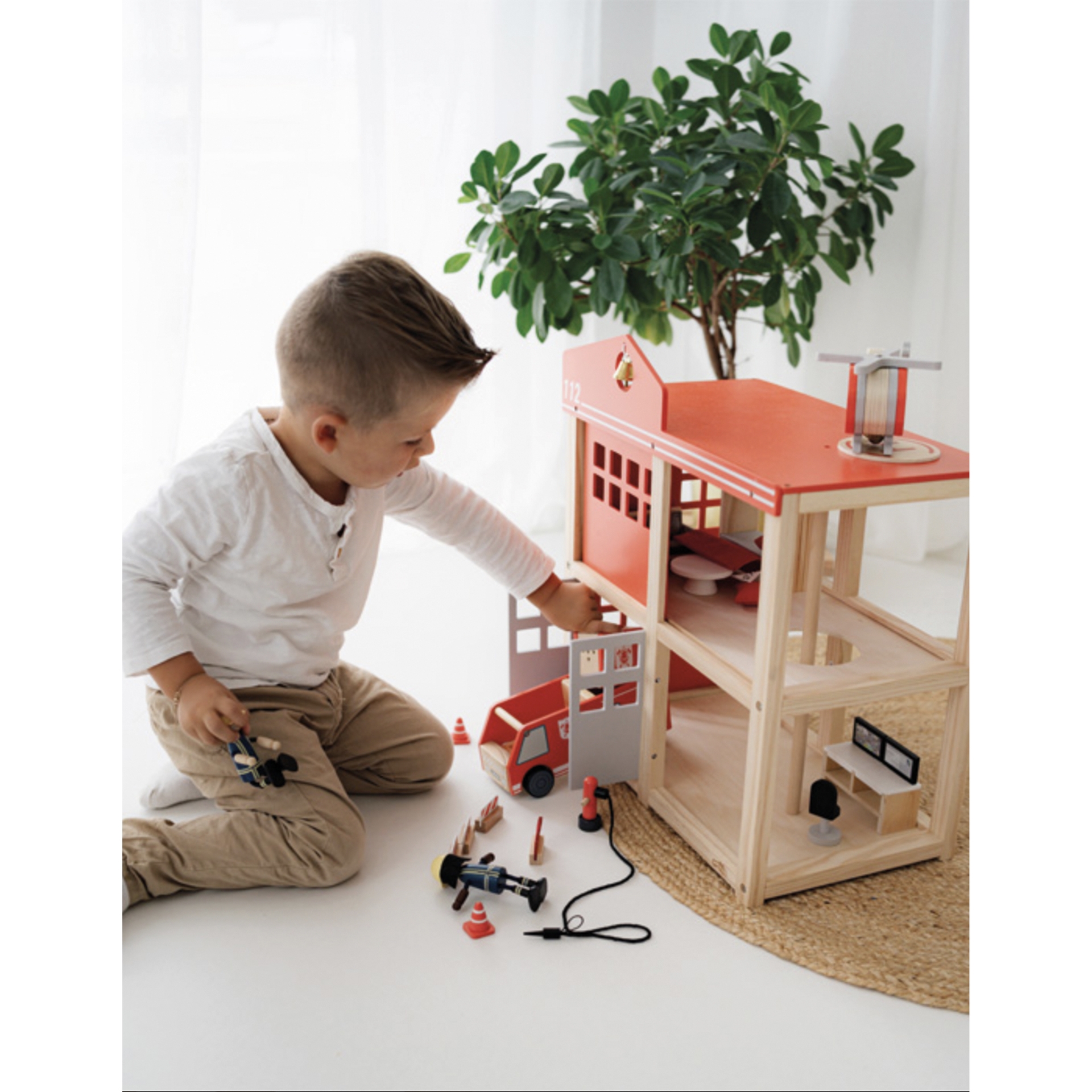Zum umfangreichen Zubehör zählt ein batteriebetriebenes Sound- & Lichtmodul für realistische Einsätze, ein Feuerwehrauto, ein Hubschrauber mit Seilwinde, zwei Biegepuppen sowie ein Hydrant mit Schlauch, Feueraufsteller, Pylonen, Absperrgitter, eine möblierte Kommandozentrale plus Aufenthaltsraum mit Stockbett, Sofa und Couchtisch. Der Werkstattbereich ist mit Gummiband-Türen und einer Rampe zum Einfahren ausgestattet.Achtung! Nicht geeignet für Kinder unter 36 Monaten!