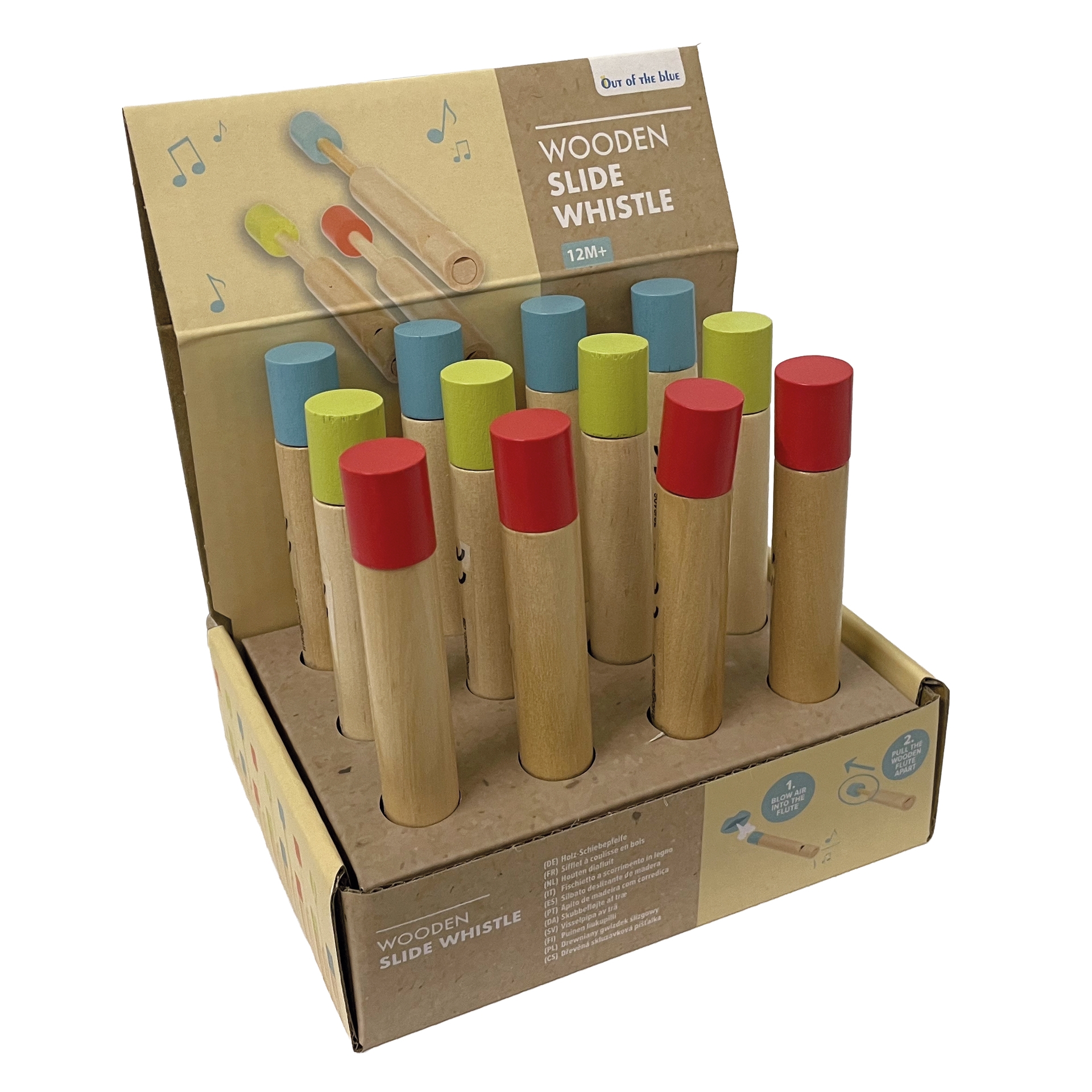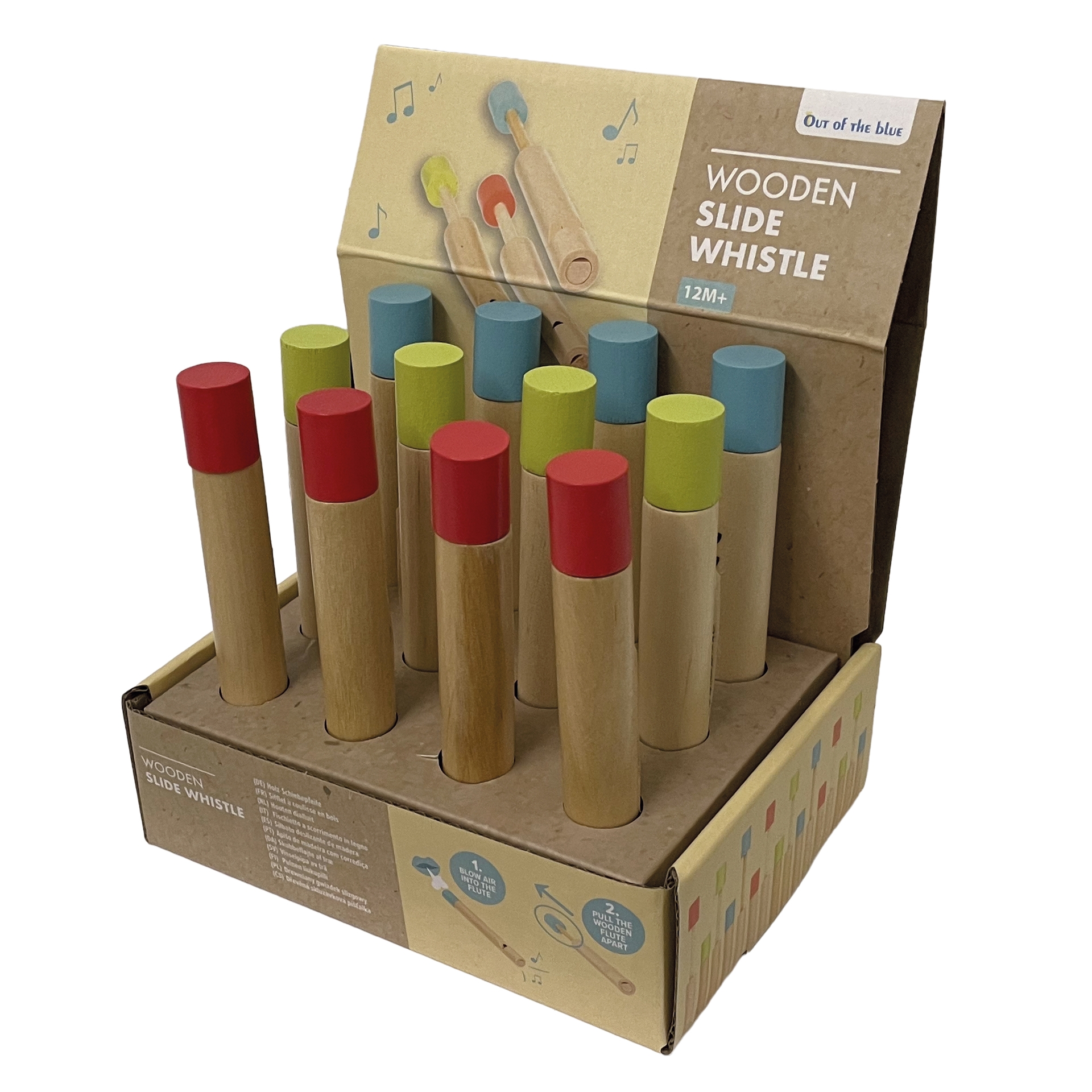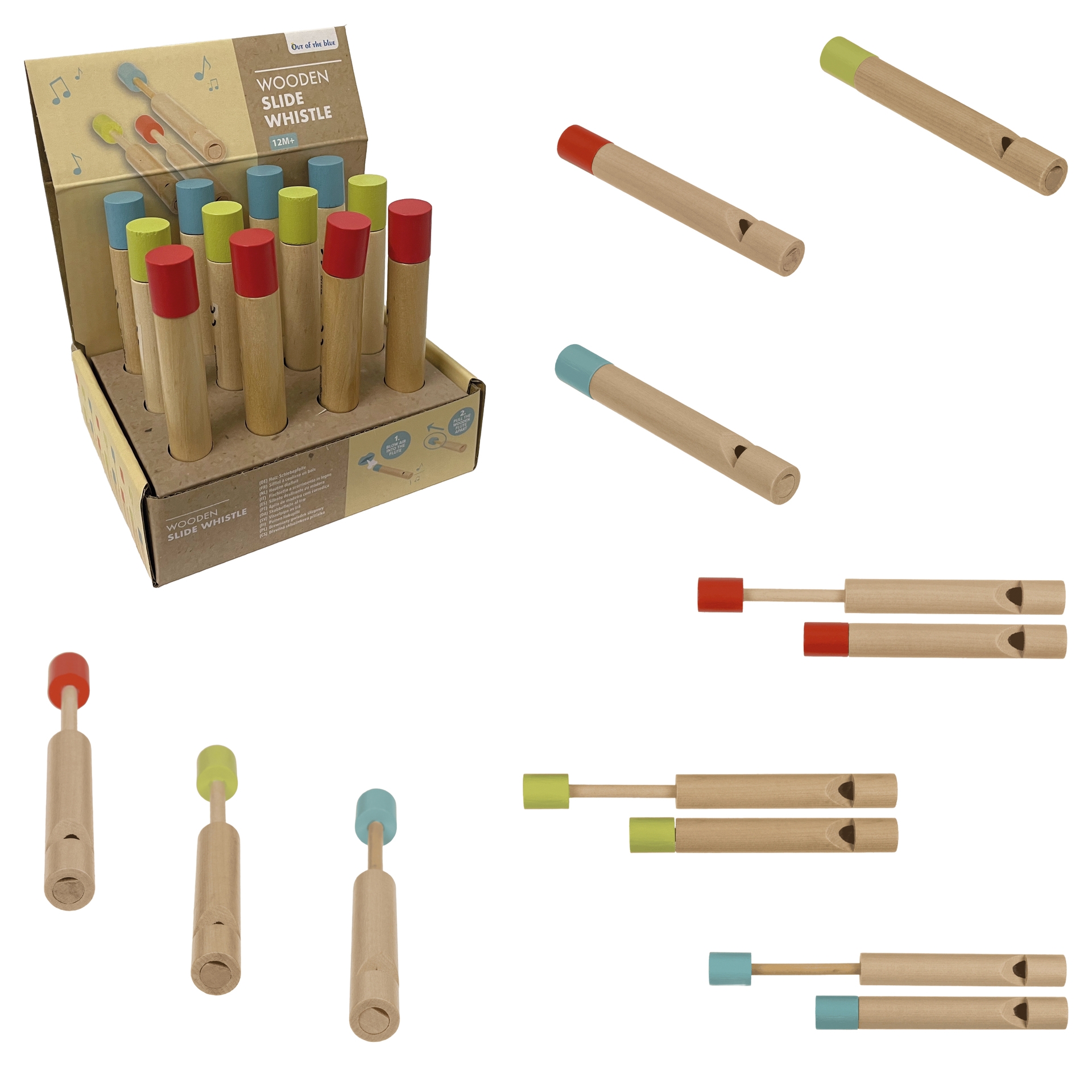 Durch Hin- und Herbewegen des Schiebers kann die Tonhöhe verändert werden. Dadurch entstehen die verschiedensten Pfeiflaute, von fröhlich trillernd bis gruselig unheimlich!Aus Holz, drei Farben sortiert.