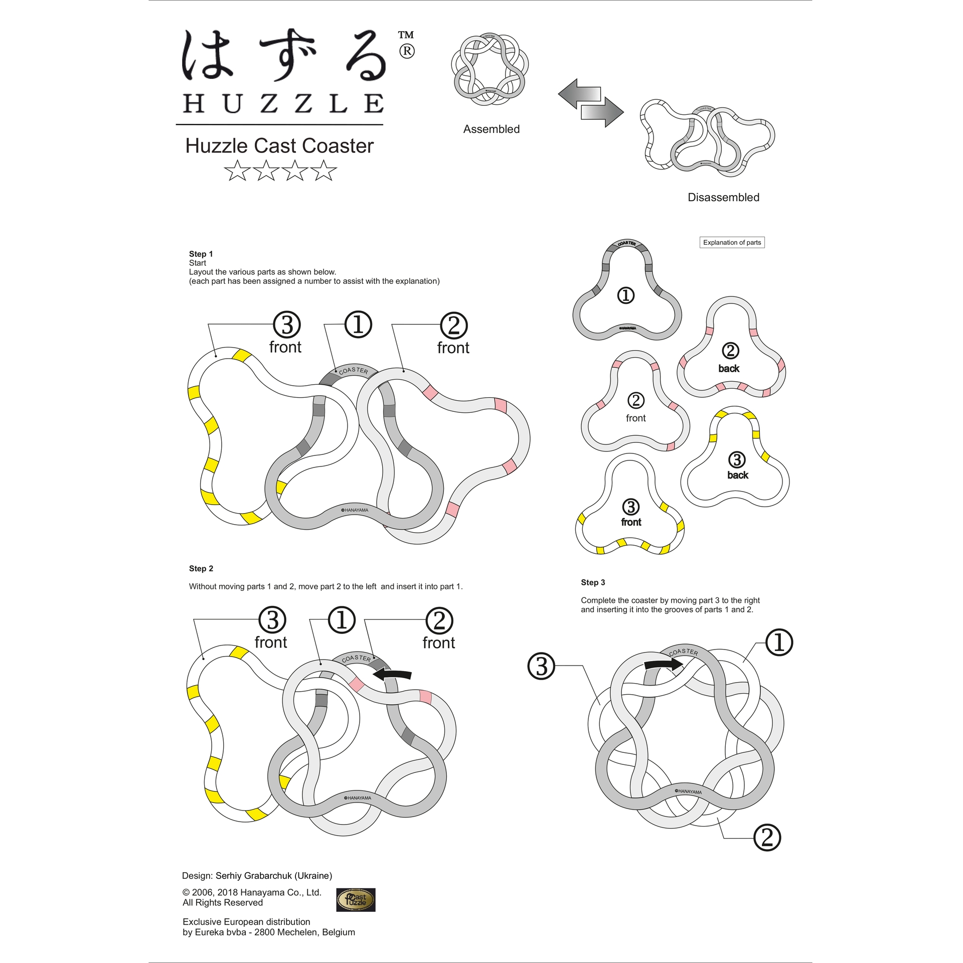 Aufgabe der verzwickten Metallpuzzles ist es, die Teile voneinander zu lösen und wieder zusammen zufügen. Der Name setzt sich zusammen aus 'HUZZLE' von 'to hug and nuzzle' (= umarmen und liebhaben) und 'to cast' (= Metall gießen). Die Puzzles werden aus Gießzink gegossen. Schwierigkeitsgrad 4 Sterne. Achtung! Nicht geeignet für Kinder unter 36 Monaten.