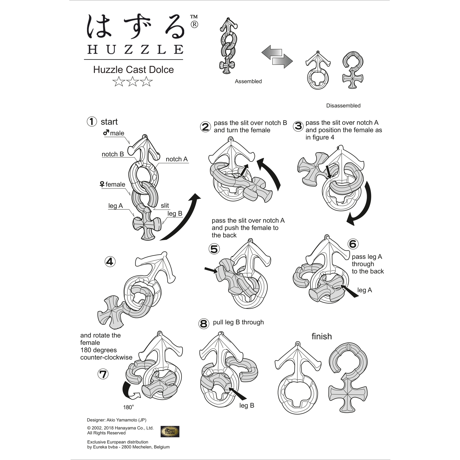Aufgabe der verzwickten Metallpuzzles ist es, die Teile voneinander zu lösen und wieder zusammen zufügen. Der Name setzt sich zusammen aus 'HUZZLE' von 'to hug and nuzzle' (= umarmen und liebhaben) und 'to cast' (= Metall gießen). Die Puzzles werden aus Gießzink gegossen. Schwierigkeitsgrad 3 Sterne. Achtung! Nicht geeignet für Kinder unter 36 Monaten.