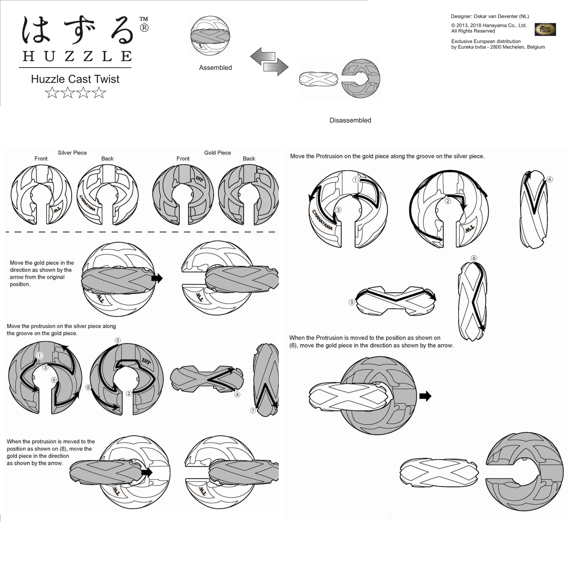 Aufgabe der verzwickten Metallpuzzles ist es, die Teile voneinander zu lösen und wieder zusammen zufügen. Der Name setzt sich zusammen aus 'HUZZLE' von 'to hug and nuzzle' (= umarmen und liebhaben) und 'to cast' (= Metall gießen). Die Puzzles werden aus Gießzink gegossen. Schwierigkeitsgrad 4 Sterne. Achtung! Nicht geeignet für Kinder unter 36 Monaten.