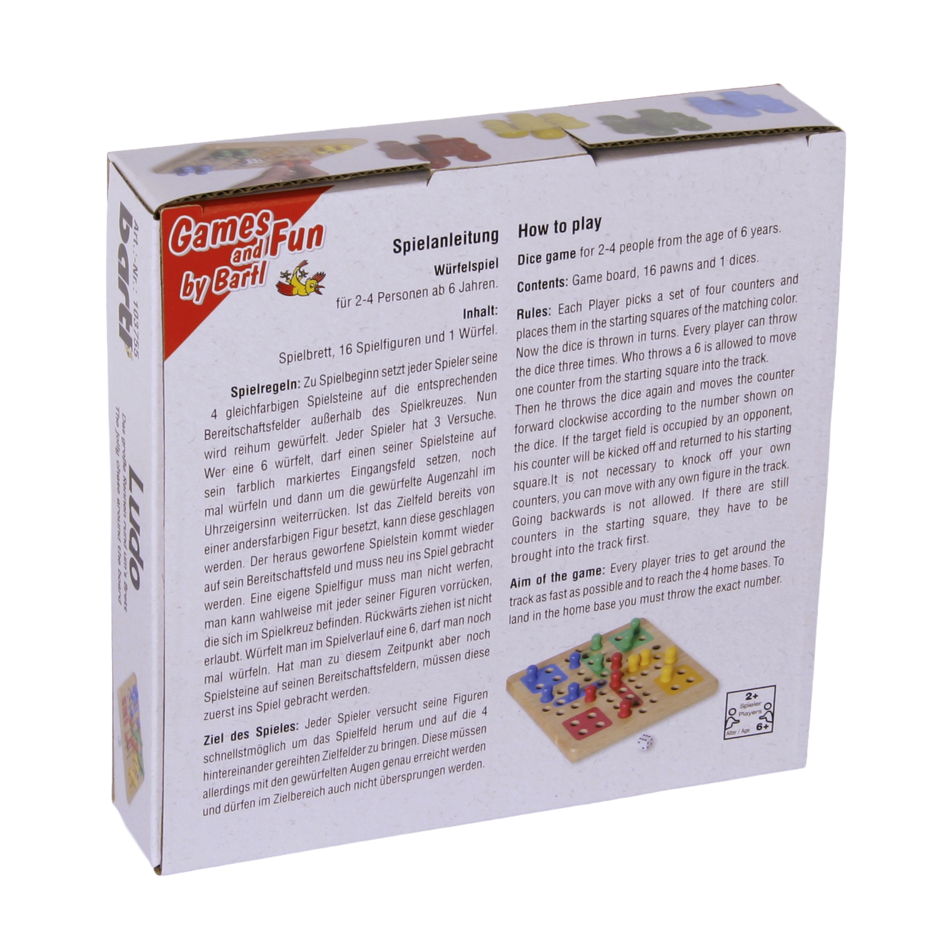 Praktische kleine Ausführung aus Holz. Die Figuren werden gesteckt, ideal für Kinder, Senioren oder unterwegs. Inklusive einem Würfel.Achtung! Nicht geeignet für Kinder unter 36 Monaten.