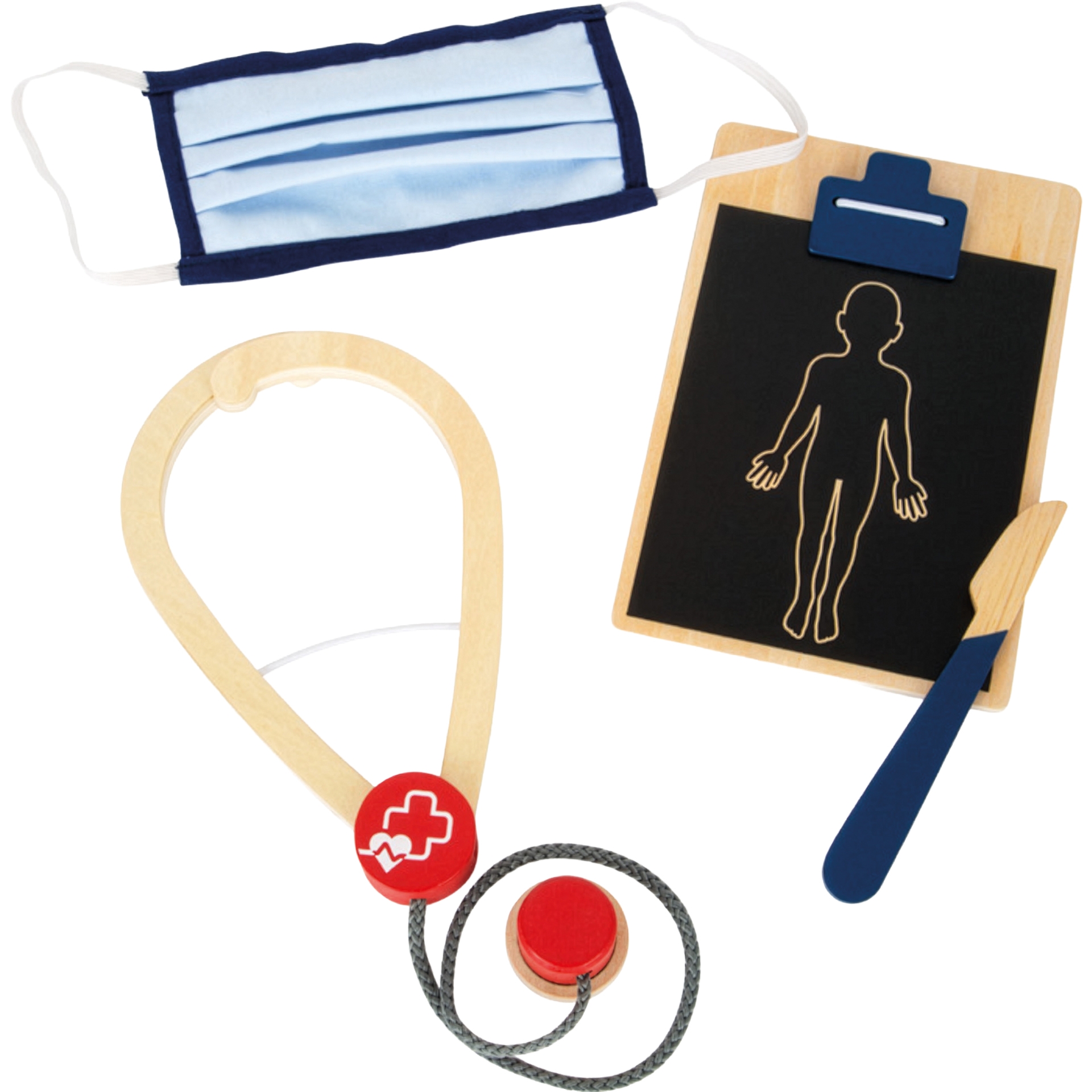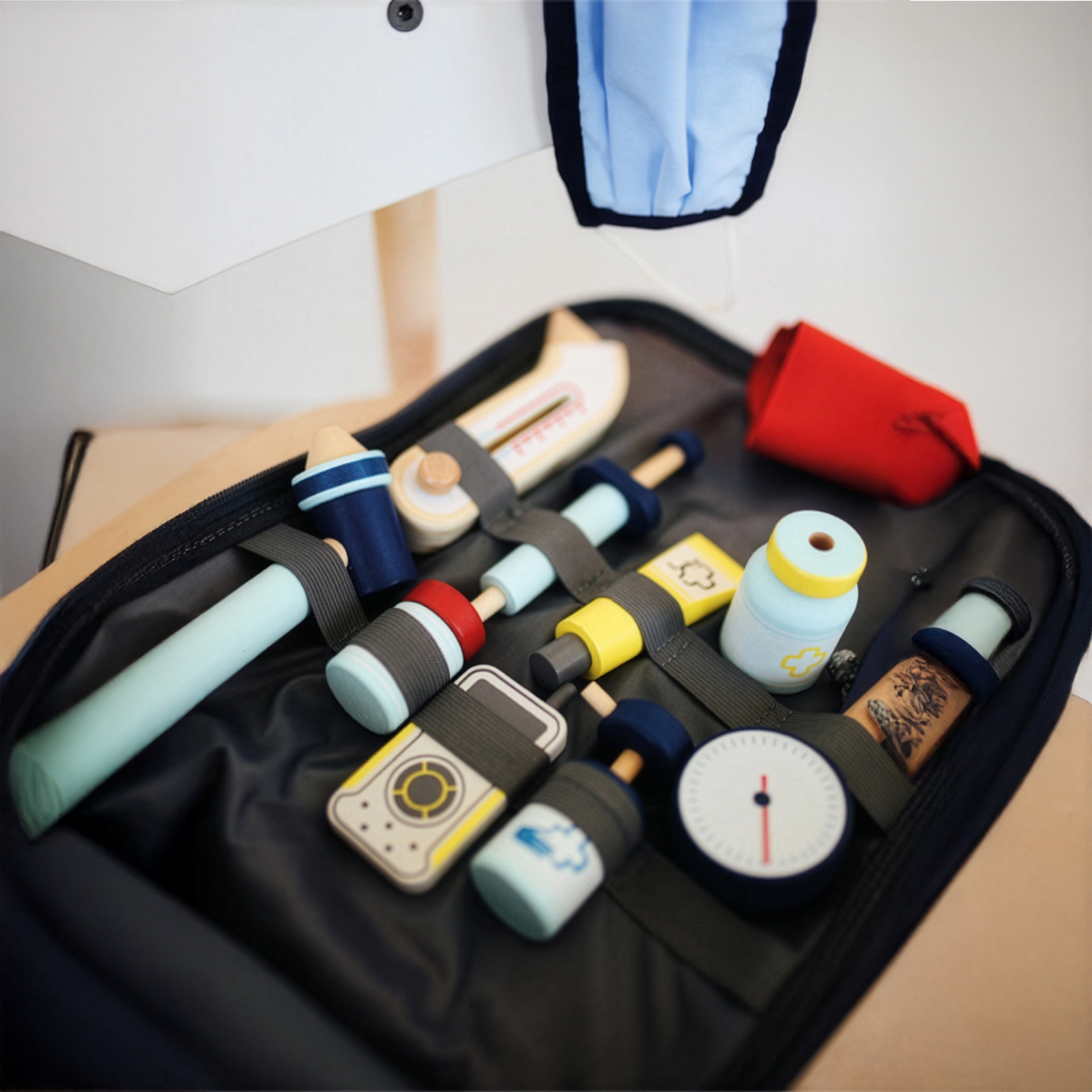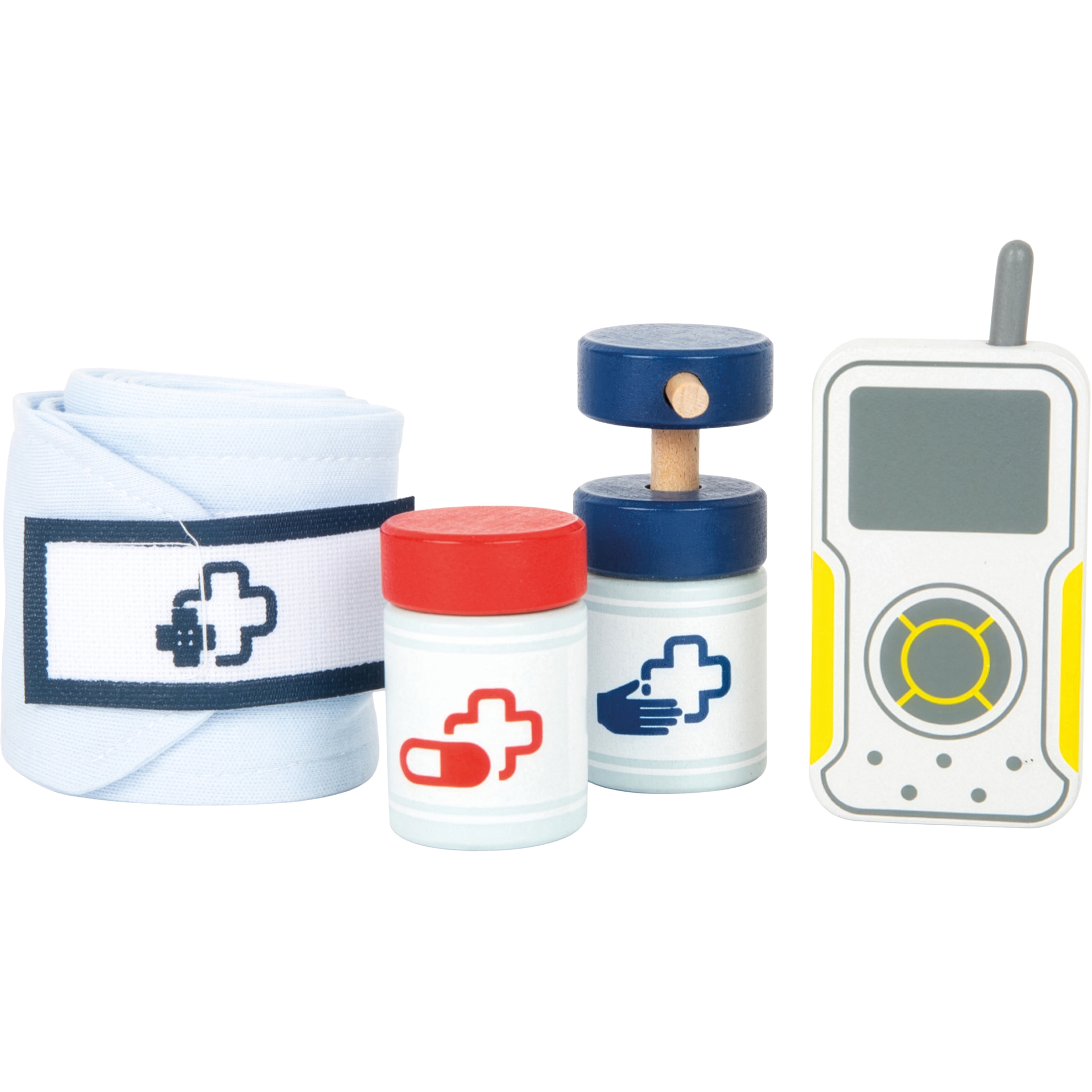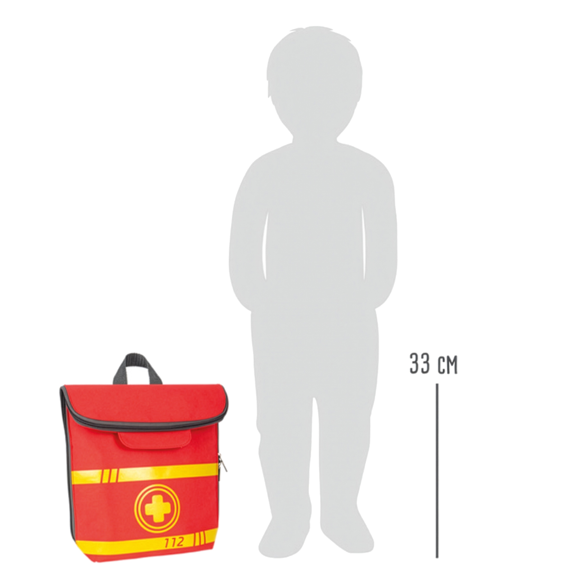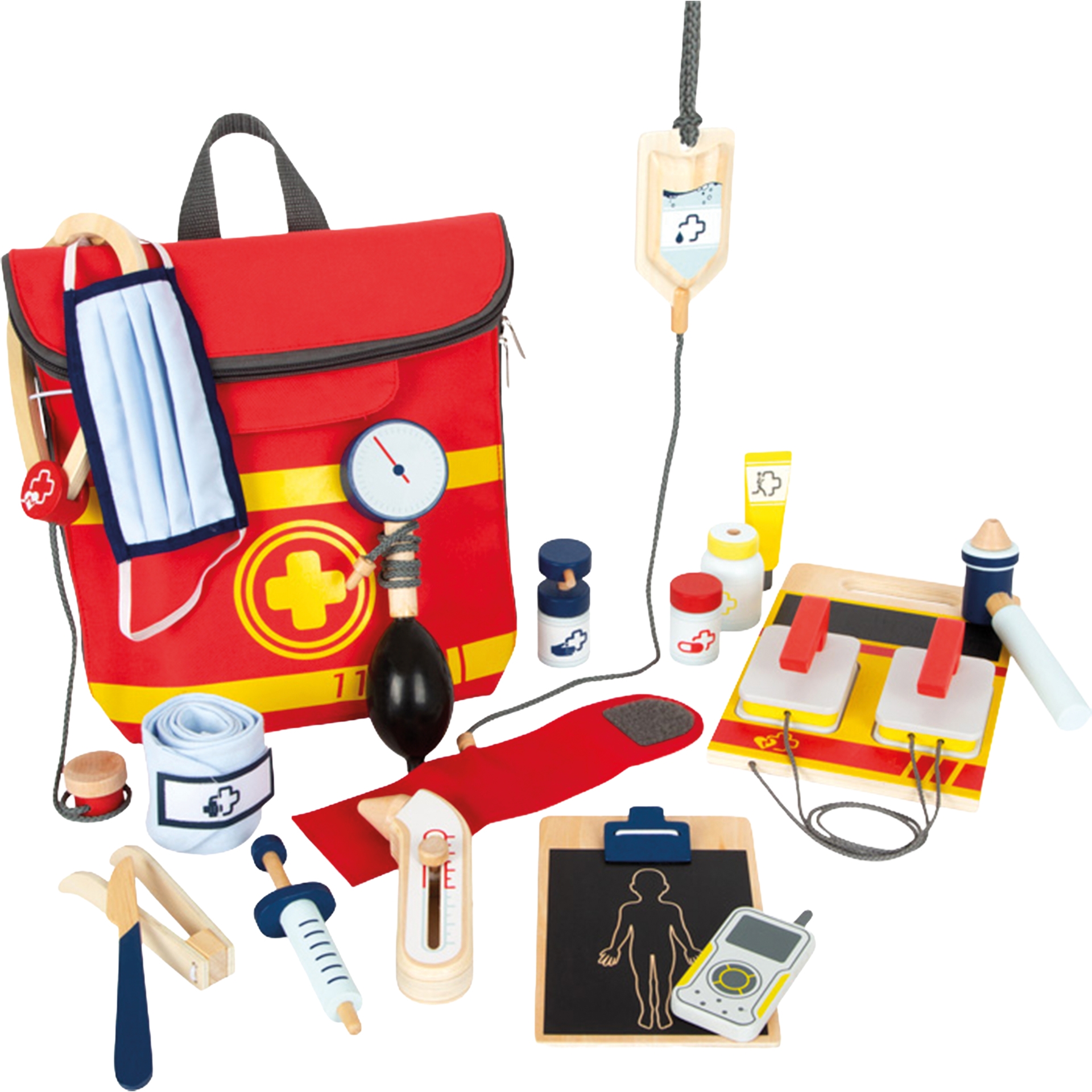 All-in-One für den Notfall! Mit diesem "realistischen" Rettungsrucksack in Signalfarben mit verstellbaren Riemen haben kleine Ersthelfer viele “echte” Utensilien aus dem Medizinbereich immer parat. Der doppelte Reißverschluss und Gummisteckplätze im Rucksack sorgen für Ordnung und schnellen Zugriff aufs Notfall-Equipment aus robustem Holz! Absolute Highlights des Notarzt-Spielsets sind das Blutdruckmessgerät mit Pumpball, das Otoskop mit echtem Vergrößerungsglas und der Defibrillator mit Tafelfeld!Ein innovatives, umfangreiches Notarzt-Set, das alles in einem praktischen Rucksack vereint, was Kinder fürs Arzt-Patienten-Rollenspiel brauchen! Zum Komplett-Set gehören neben Fieberthermometer, Kinderstoffmaske und Klemmbrett auch Notfallampulle mit Steckplatz für eine Spritze, Desinfektionsspray mit Drückmechanismus, Infusionsbeutel, Verband mit Klettverschluss, Tablettendose mit Schraubdeckel, Spritze mit Drückmechanismus, Salbentube, Stethoskop, Skalpell, Pinzette und ein Funkgerät. Mit den robusten und haptisch angenehmen Medizingeräten aus Holz können Kinder im Rollenspiel erkunden und üben, was im Notfall wichtig für eine Behandlung ist. Die Grafiken auf den Utensilien geben Hinweise, wofür diese im Spiel verwendet werden können. Ideal für unterwegs!