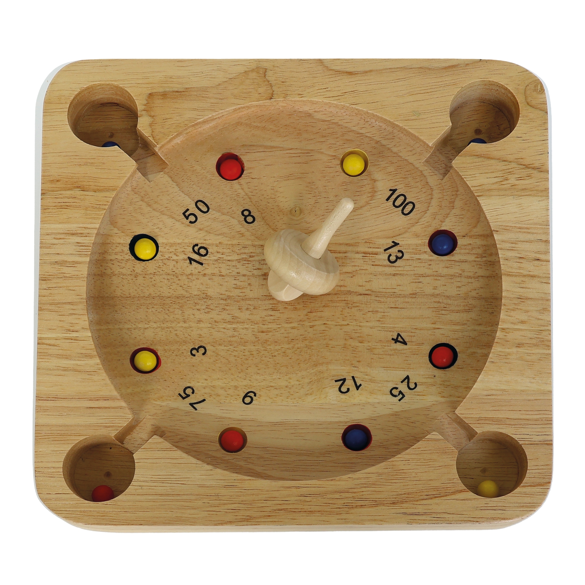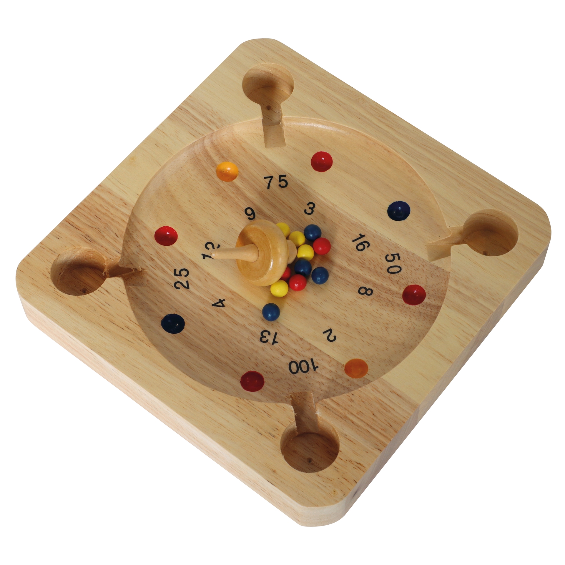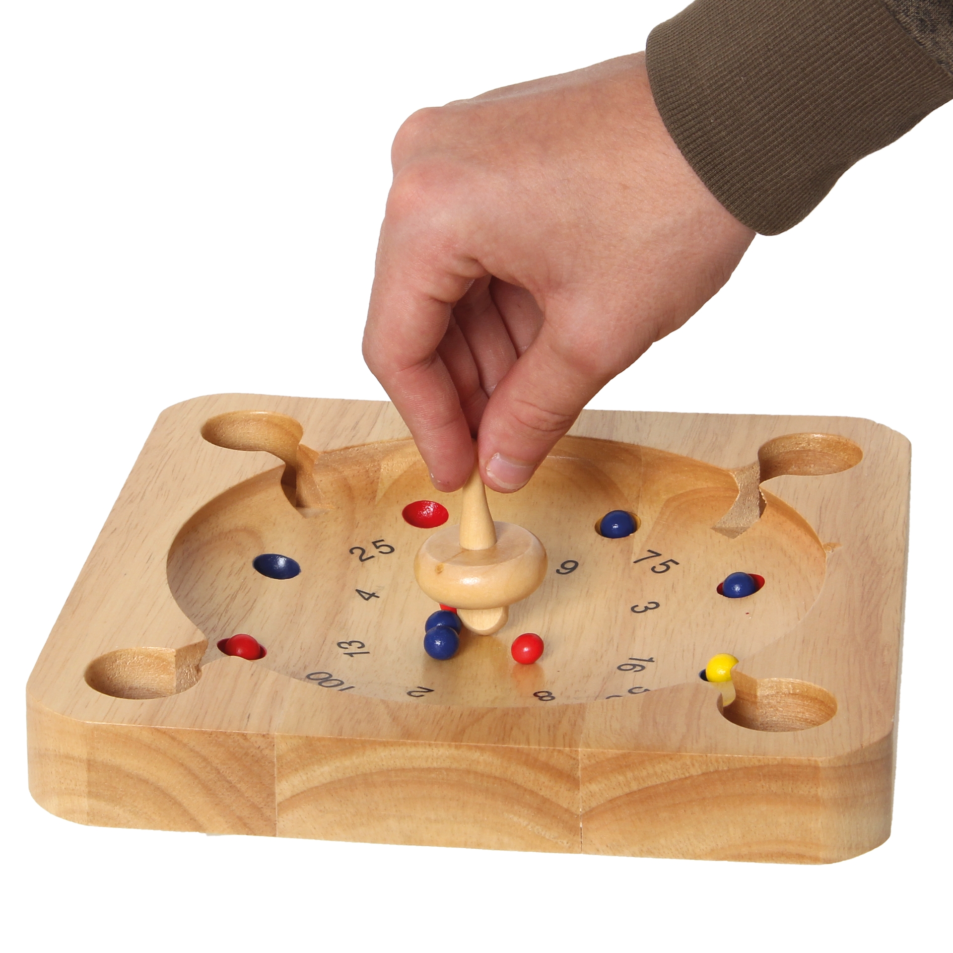 Geschick und auch ein wenig Glück braucht man für das rasante Kreisel-Roulette-Spiel aus Holz.Die bunten Kugeln werden zu Beginn einer Spielrunde in die Mitte des Spielbrettes gelegt. Dann dreht der Spielende den Kreisel an und lässt ihn zwischen den Kugeln starten, durch die Rotation werden die Kugeln wild herumgeschupst und landen möglichst in einem Punktefeld. Hört der Kreisel auf sich zu drehen werden die Punkte zusammen gezählt und notiert, dann ist der nächste an der Reihe. Wer am Ende die meisten Punkte sammeln konnte gewinnt!
