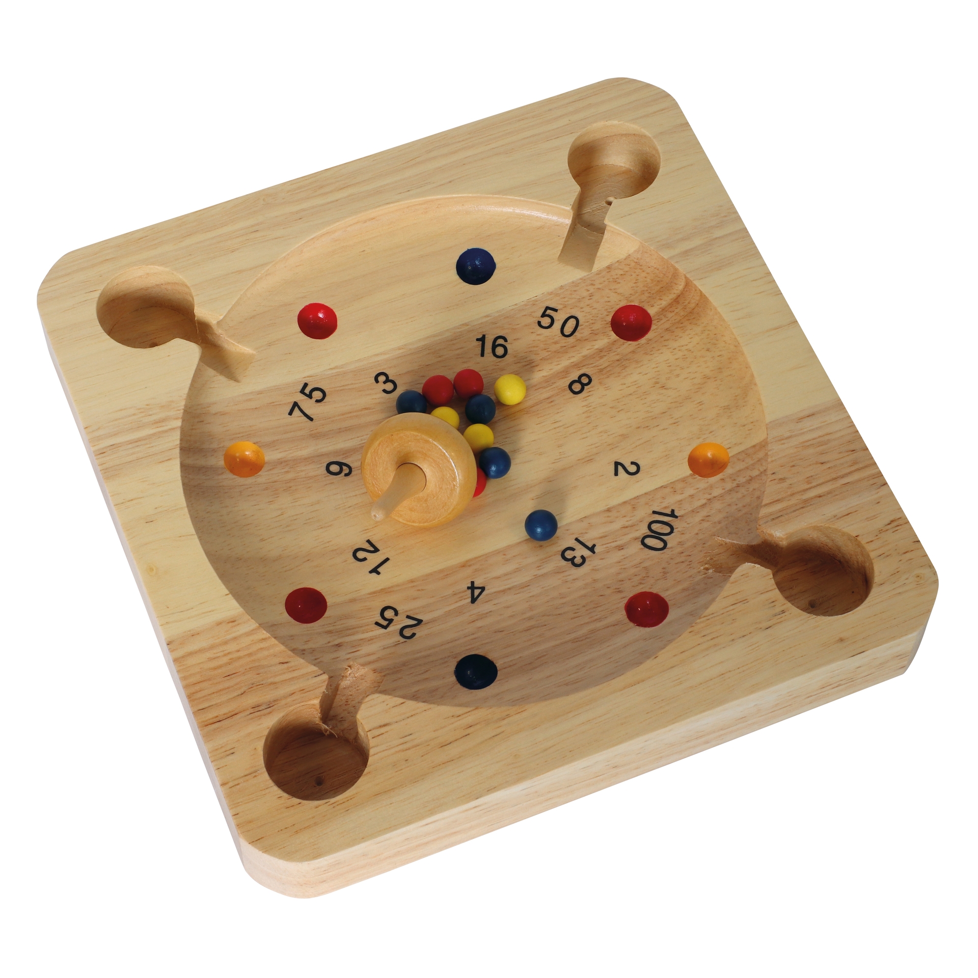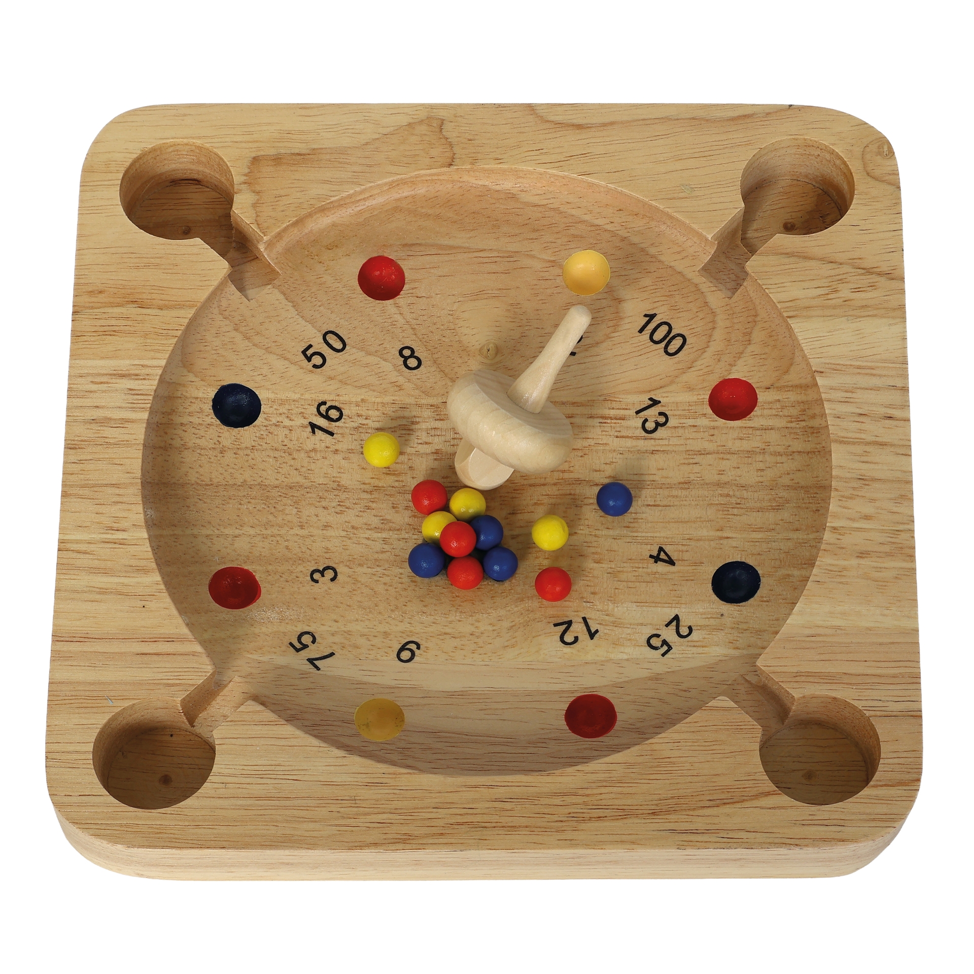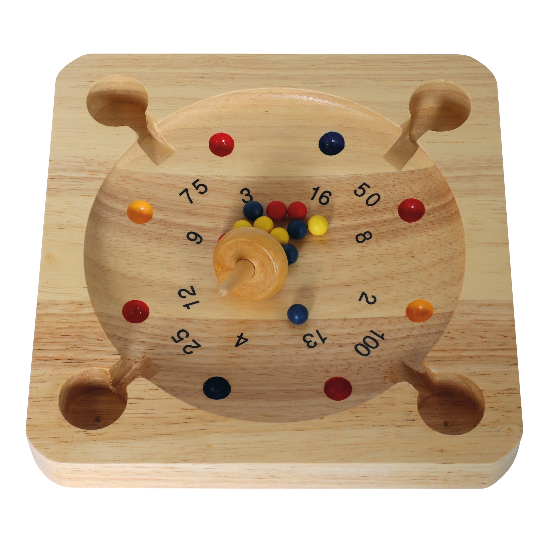 Geschick und auch ein wenig Glück braucht man für das rasante Kreisel-Roulette-Spiel aus Holz.Die bunten Kugeln werden zu Beginn einer Spielrunde in die Mitte des Spielbrettes gelegt. Dann dreht der Spielende den Kreisel an und lässt ihn zwischen den Kugeln starten, durch die Rotation werden die Kugeln wild herumgeschupst und landen möglichst in einem Punktefeld. Hört der Kreisel auf sich zu drehen werden die Punkte zusammen gezählt und notiert, dann ist der nächste an der Reihe. Wer am Ende die meisten Punkte sammeln konnte gewinnt!