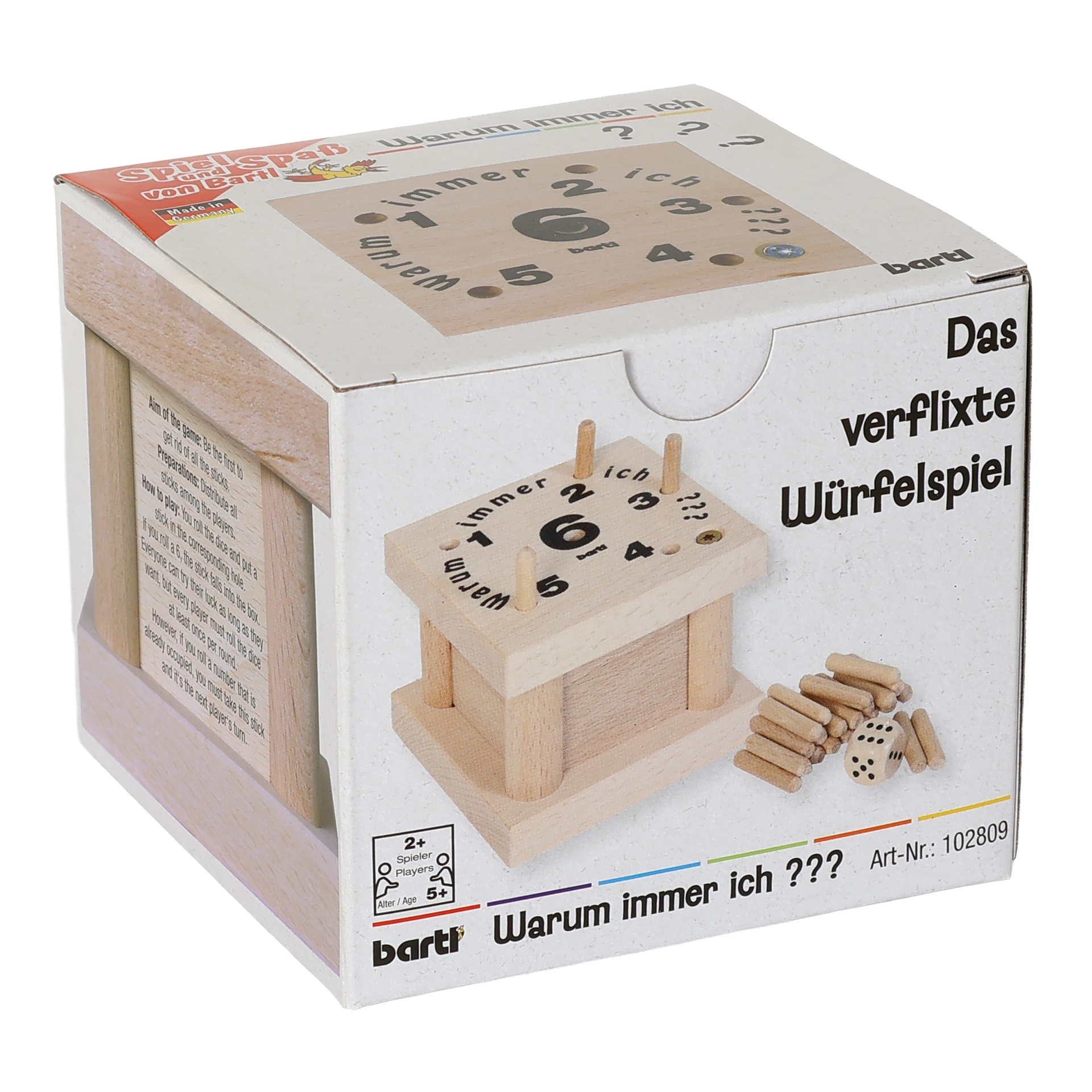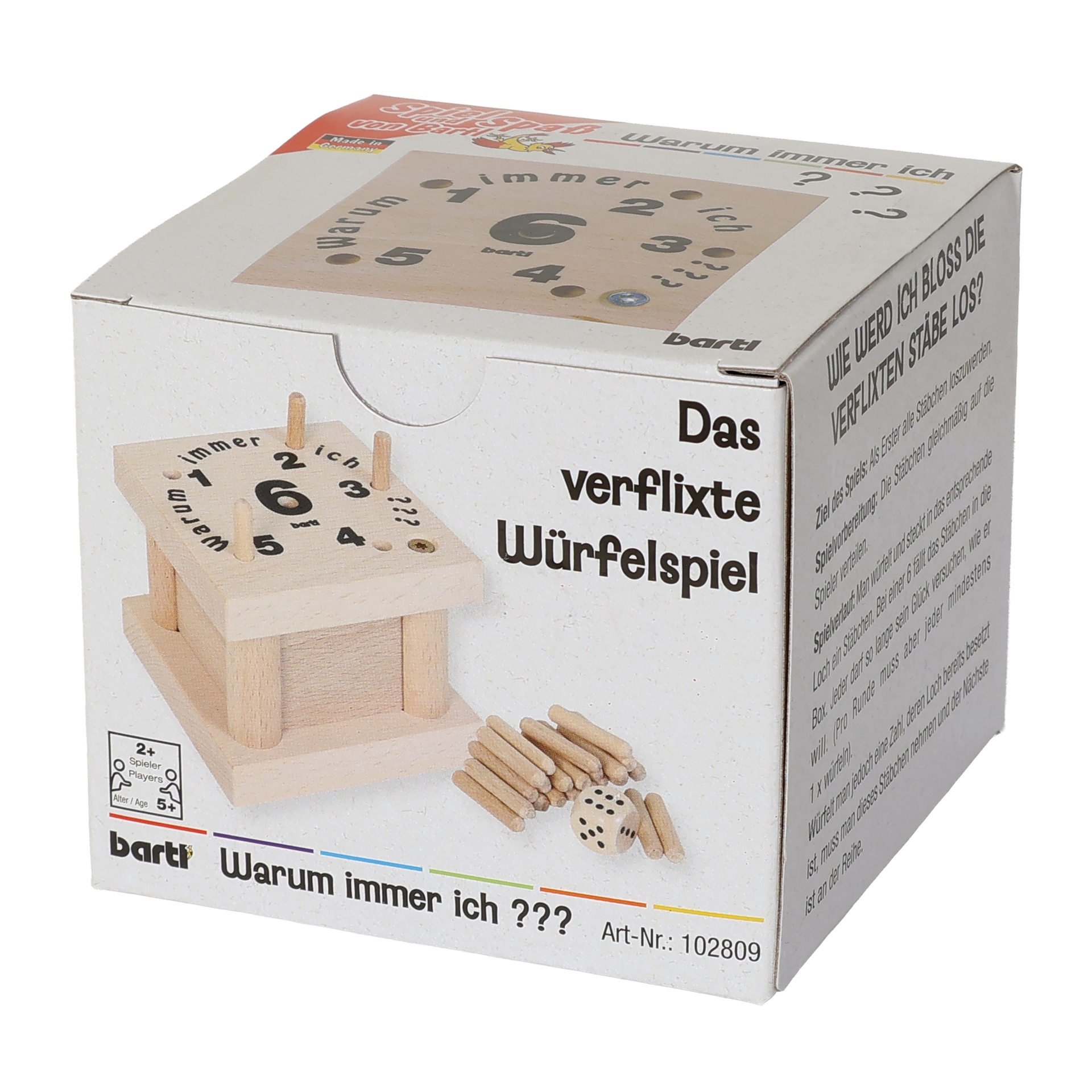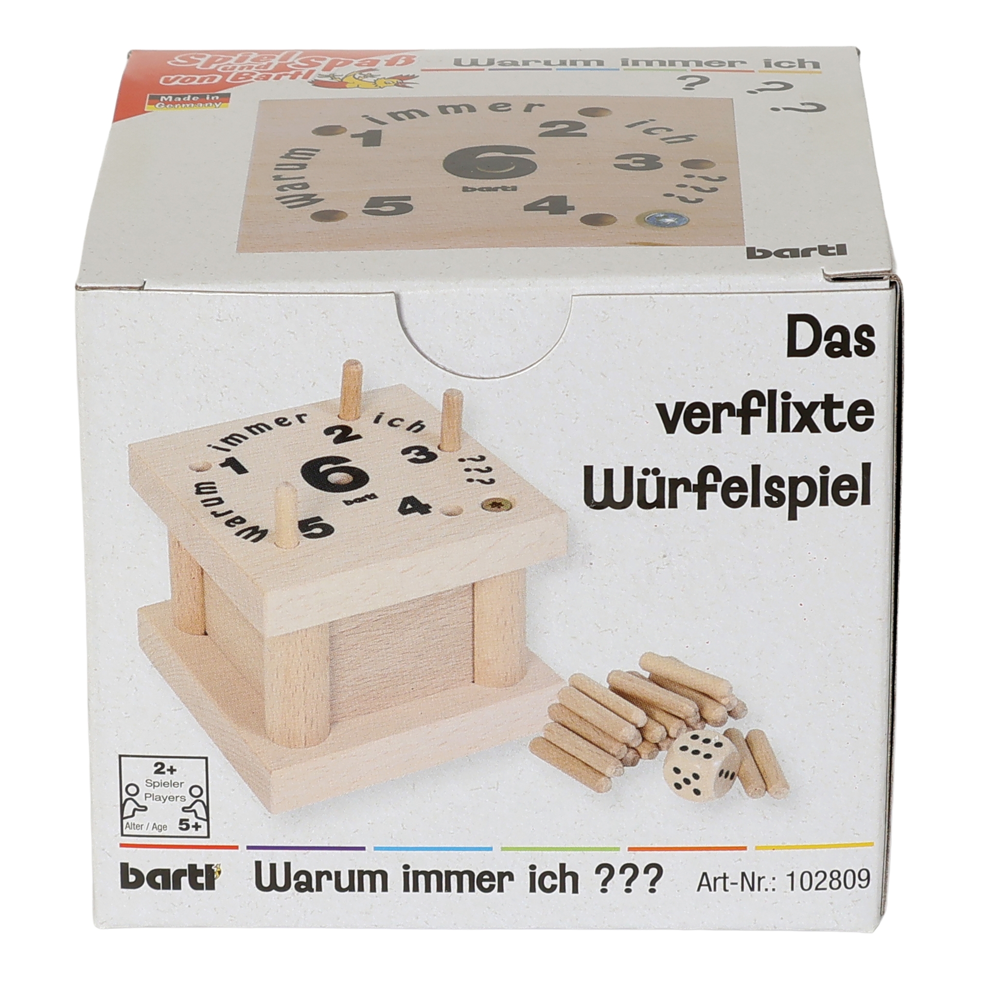 Beliebtes Würfelspiel für zwei und mehr Personen jeden Alters. So geht es: Alle Holzstäbe werden an die Spieler verteilt. Würfelnd werden die Felder des Spielbretts entsprechend der Augenzahlen besetzt. Bei 6 fällt das Stäbchen durch. Ist ein Feld bereits besetzt, muss der Spieler den Stab nehmen, und der Nächste ist dran. Wer keine Holzstäbe mehr hat, gewinnt. Und bald werden Sie wissen, warum das Spiel Warum immer ich? heißt! Achtung! Nicht geeignet für Kinder unter 36 Monaten.