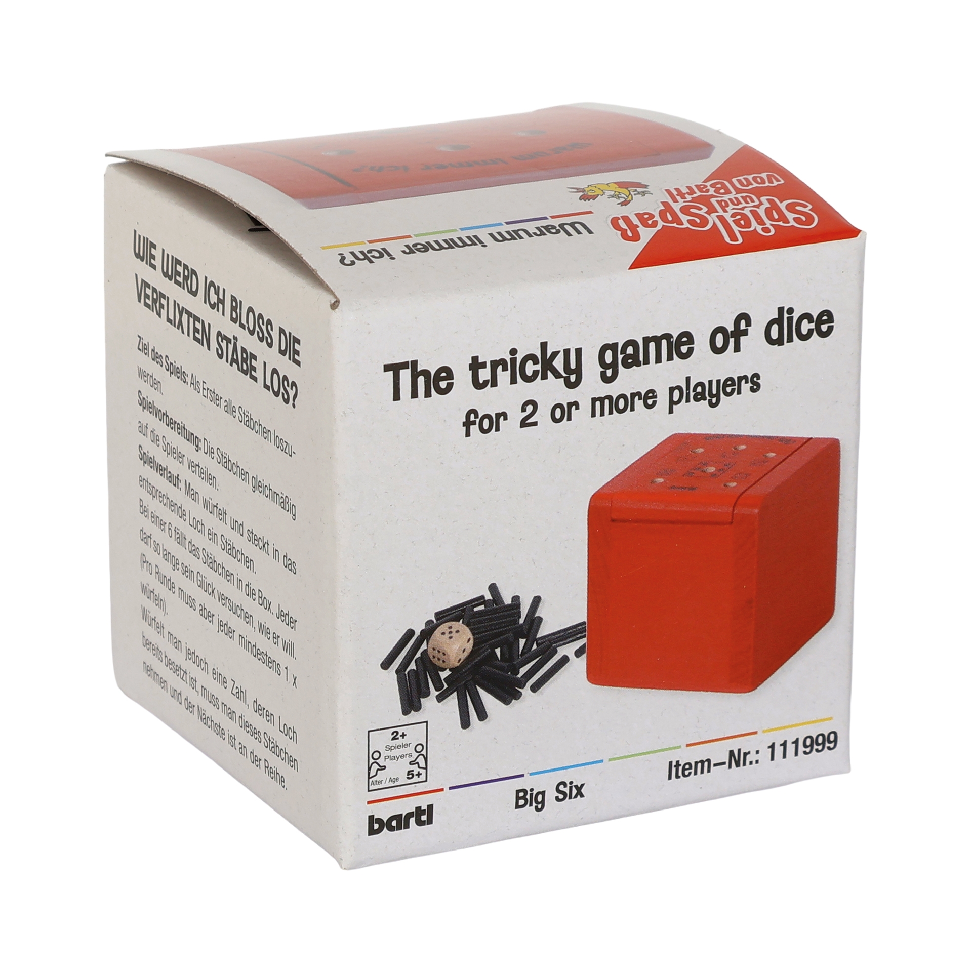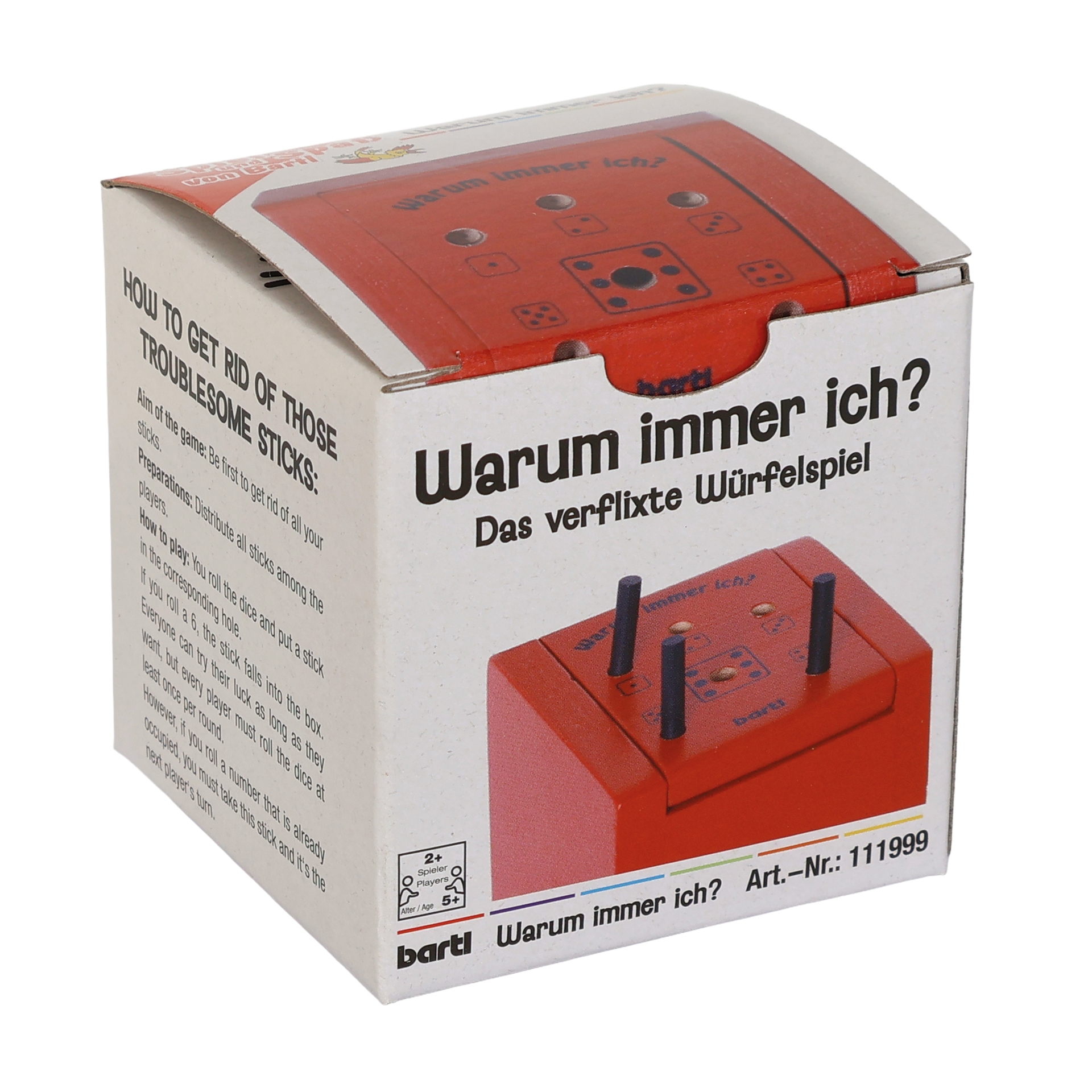 Beliebtes Würfelspiel für zwei und mehr Personen jeden Alters. So geht es: Alle Holzstäbe werden an die Spieler verteilt. Würfelnd werden die Felder des Spielbretts entsprechend der Augenzahlen besetzt. Bei 6 fällt das Stäbchen durch. Ist ein Feld bereits besetzt, muss der Spieler den Stab nehmen und der Nächste ist dran. Wer keine Holzstäbe mehr hat, gewinnt. Und bald werden Sie wissen, warum das Spiel Warum immer ich? heißt! Gefertigt aus Buchenholz, mit praktischem Magnetverschluß. Achtung! Nicht geeignet für Kinder unter 36 Monaten.