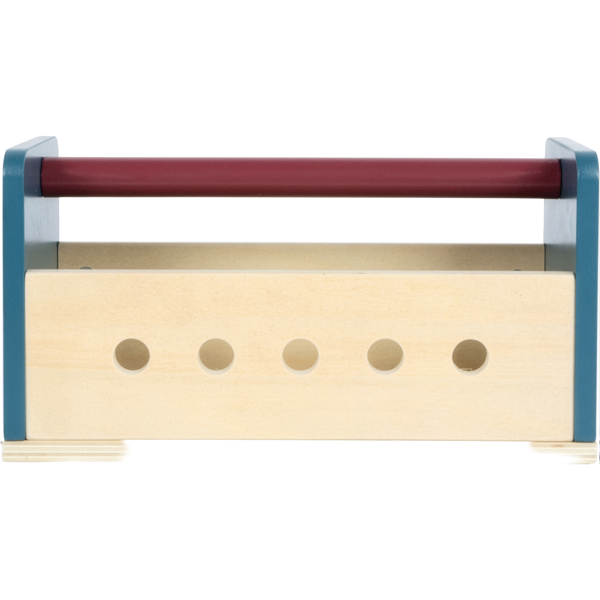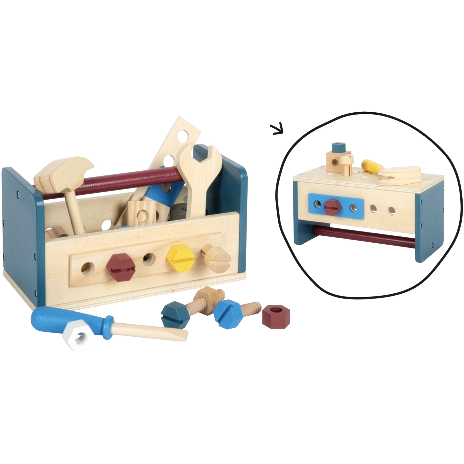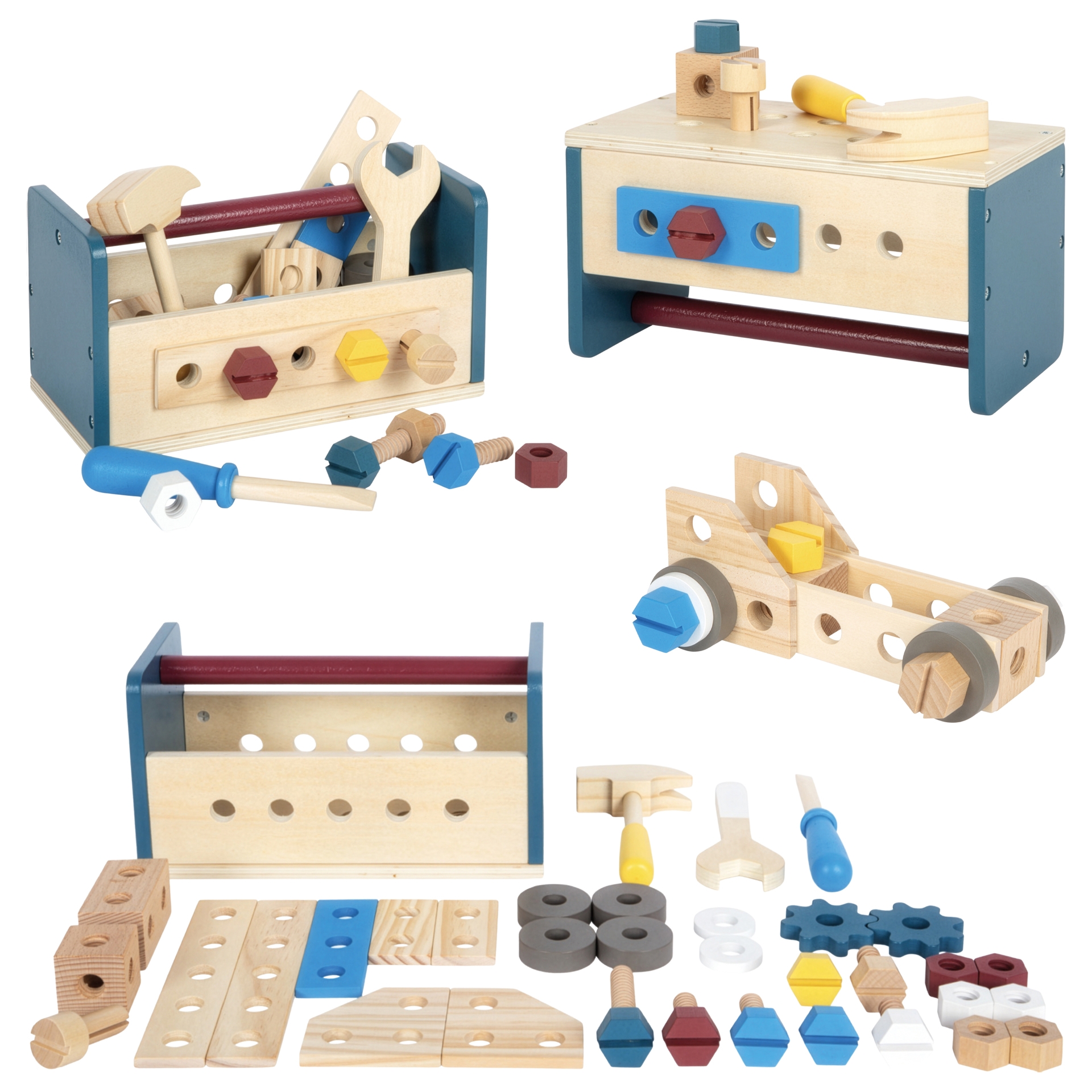 Mit diesem stabilen Werkzeugkasten aus Holz, der umgedreht auch als Werkbank verwendet werden kann, haben kleine Baumeister:innen das Profi-Equipment immer zur Hand! Ausgestattet mit drei Werkzeugen sowie allerlei Zubehör kann direkt losgebaut werden. Durch das vielfältige Konstruktionszubehör ist es möglich, eigene kleine Figuren zu bauen oder anhand der mitgelieferten Anleitung ein Rennauto zu konstruieren. Beim Tüfteln und Bauen werden die Kreativität sowie feinmotorische Fähigkeiten geschult und das aktive Rollenspiel gefördert.Dieser multifunktionale Werkzeugkasten überzeugt durch die ansprechende Farbgebung mit hohem sichtbarem Holzanteil. Ein absolutes Must-Have für die Kinderwerkstatt und das Rollenspielsortiment.