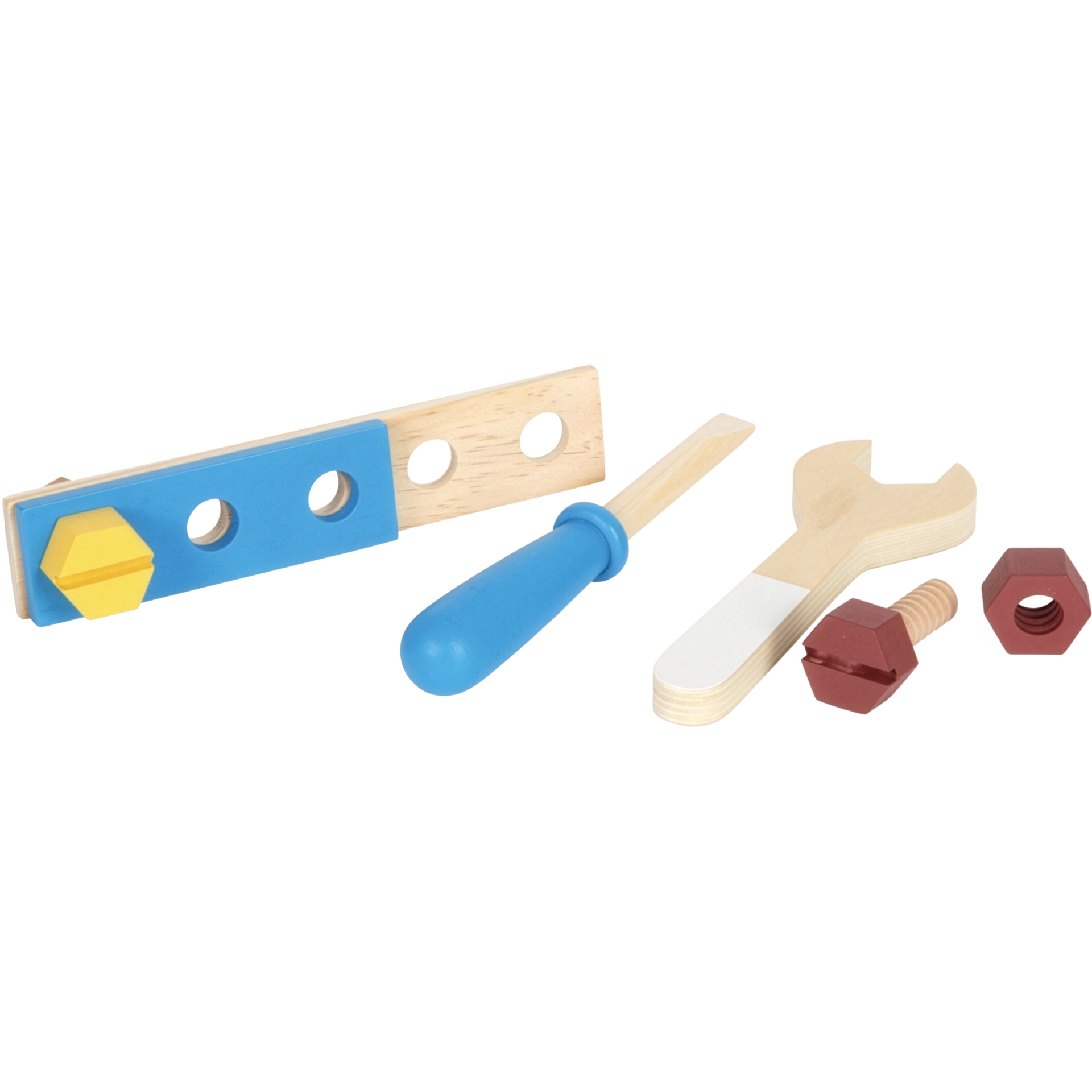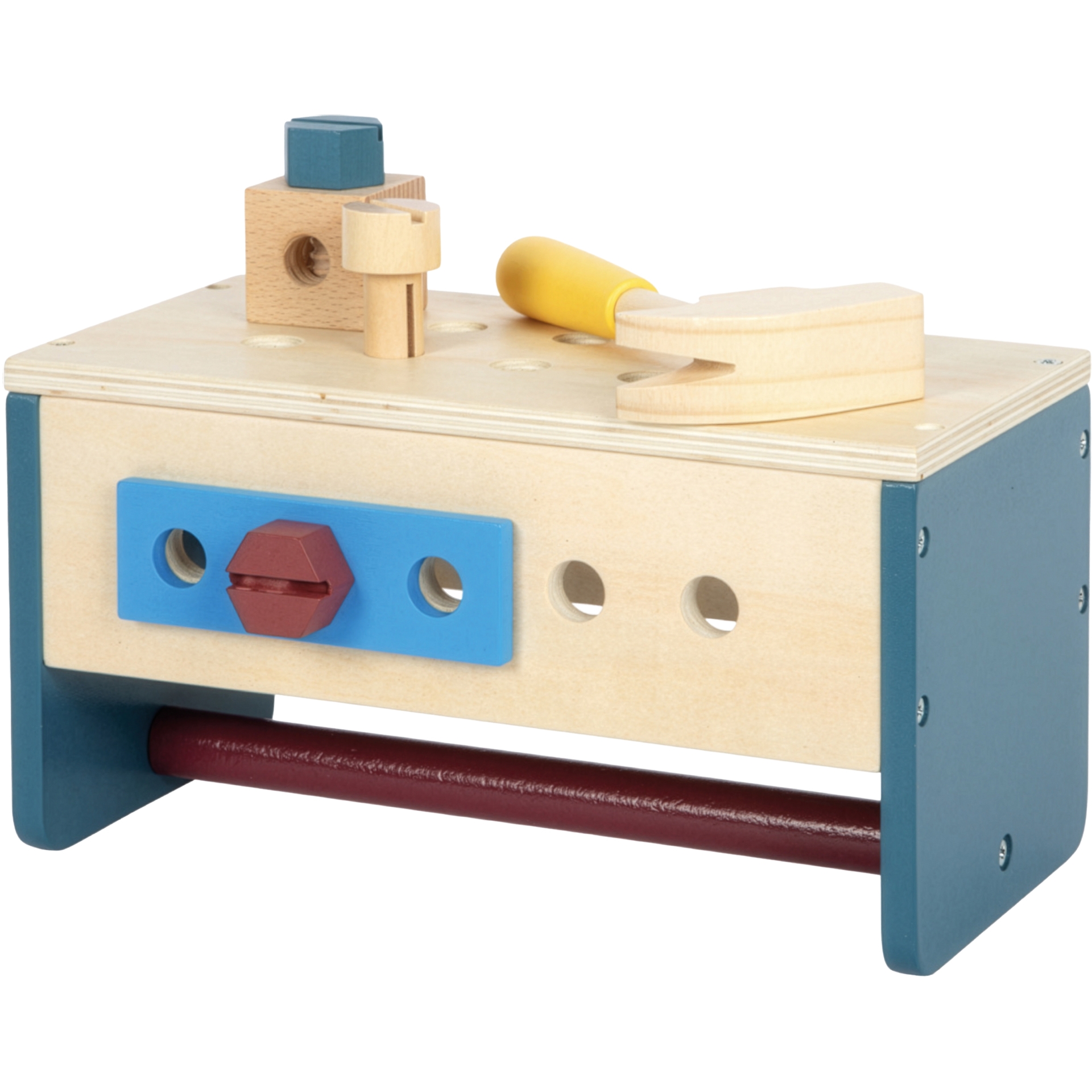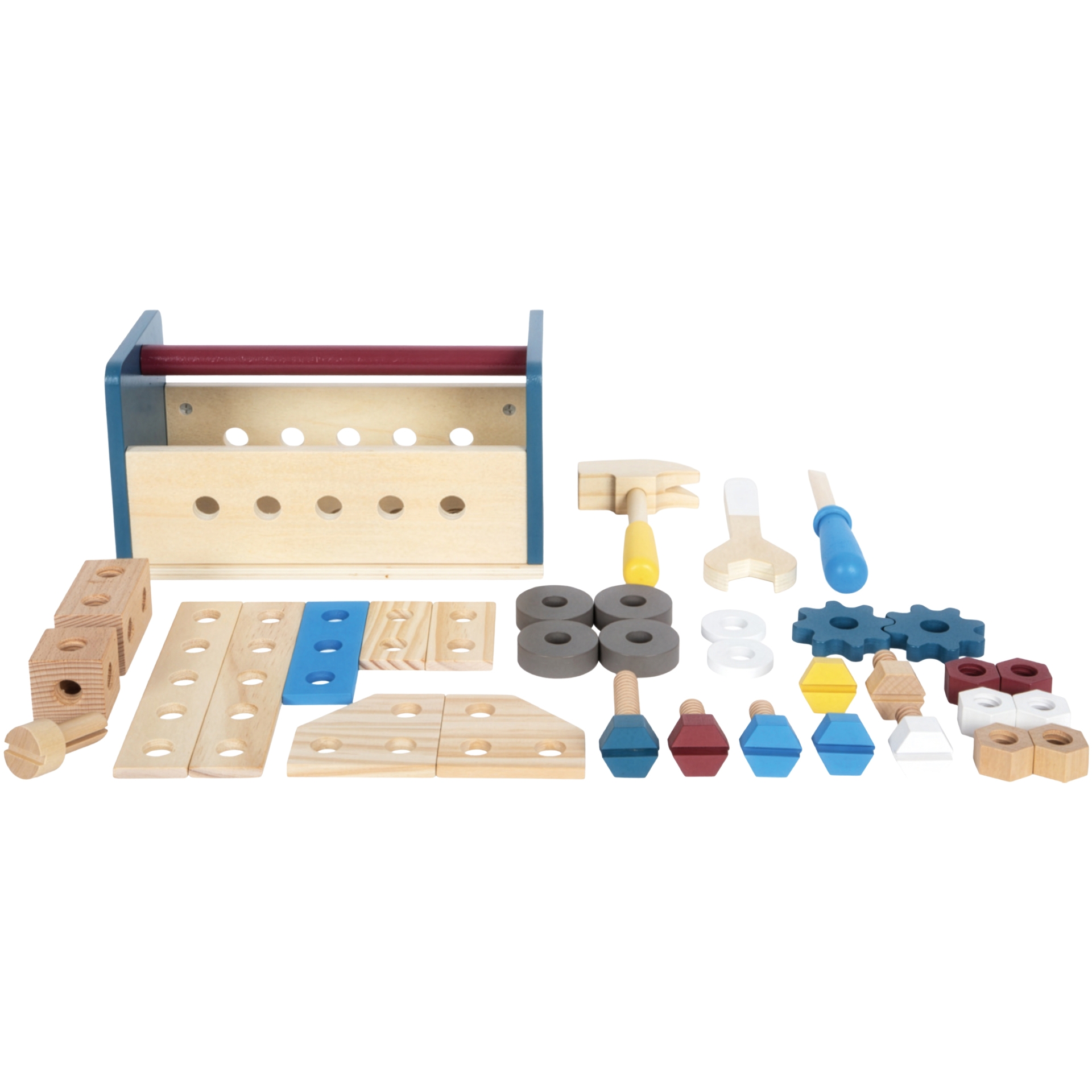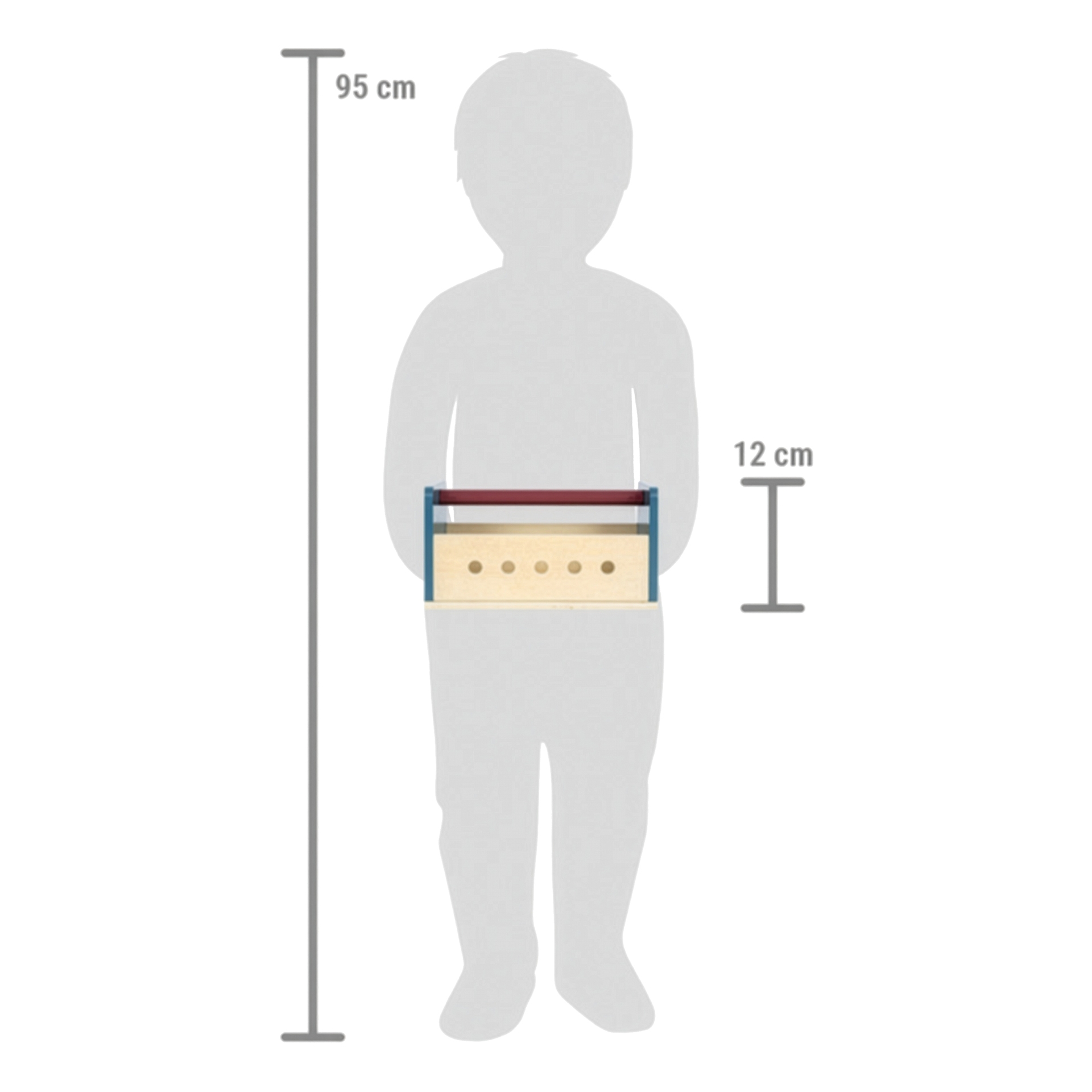 Mit diesem stabilen Werkzeugkasten aus Holz, der umgedreht auch als Werkbank verwendet werden kann, haben kleine Baumeister:innen das Profi-Equipment immer zur Hand! Ausgestattet mit drei Werkzeugen sowie allerlei Zubehör kann direkt losgebaut werden. Durch das vielfältige Konstruktionszubehör ist es möglich, eigene kleine Figuren zu bauen oder anhand der mitgelieferten Anleitung ein Rennauto zu konstruieren. Beim Tüfteln und Bauen werden die Kreativität sowie feinmotorische Fähigkeiten geschult und das aktive Rollenspiel gefördert.Dieser multifunktionale Werkzeugkasten überzeugt durch die ansprechende Farbgebung mit hohem sichtbarem Holzanteil. Ein absolutes Must-Have für die Kinderwerkstatt und das Rollenspielsortiment.