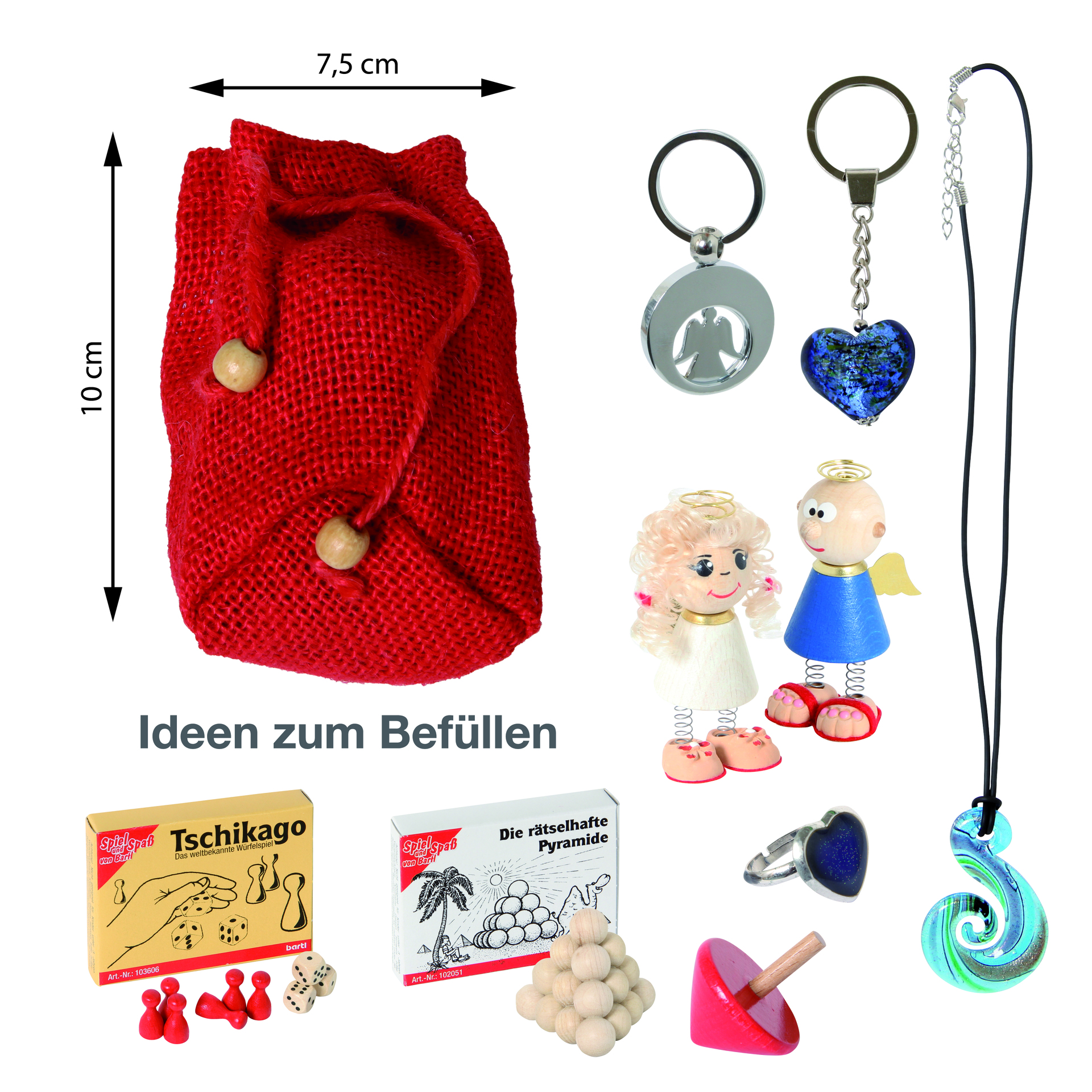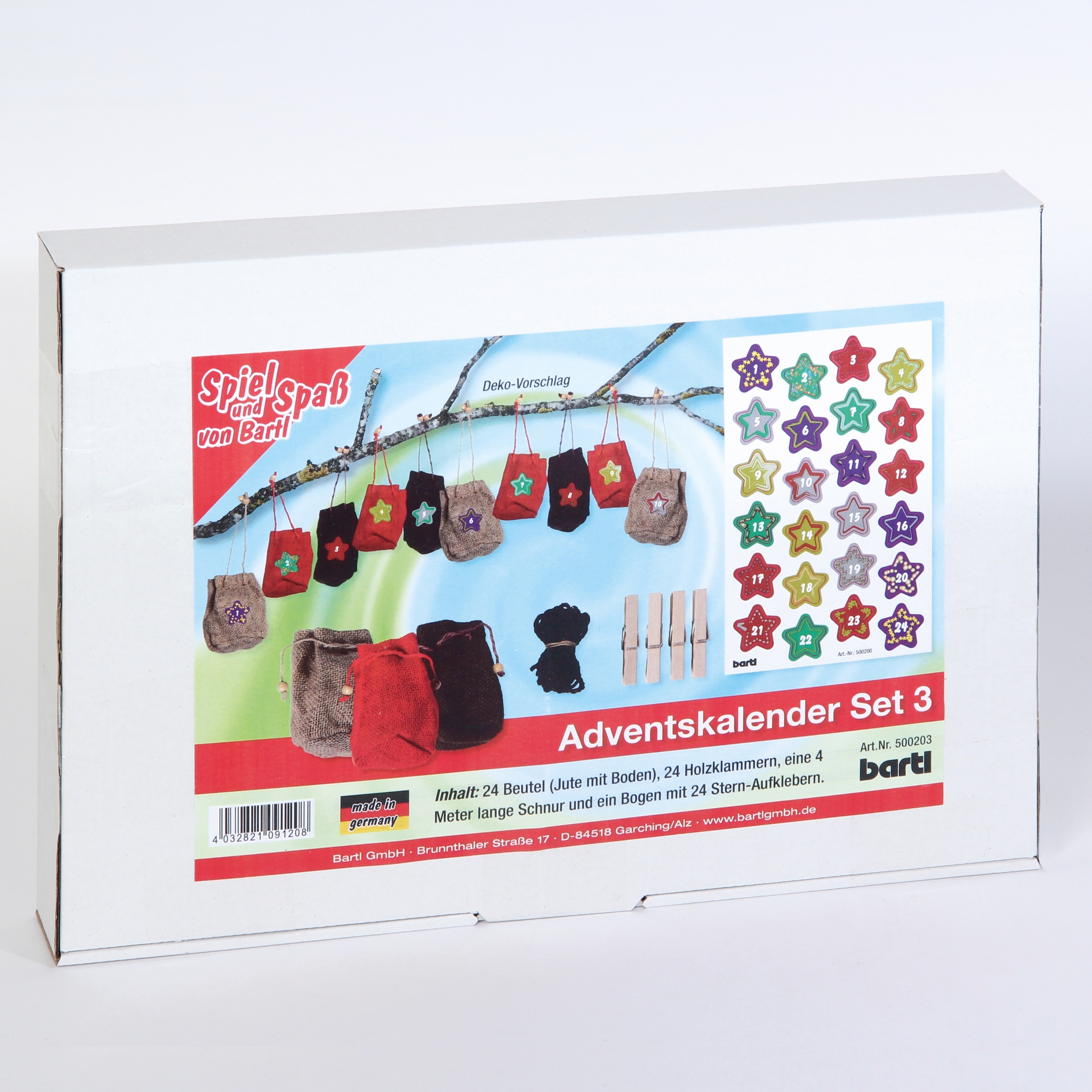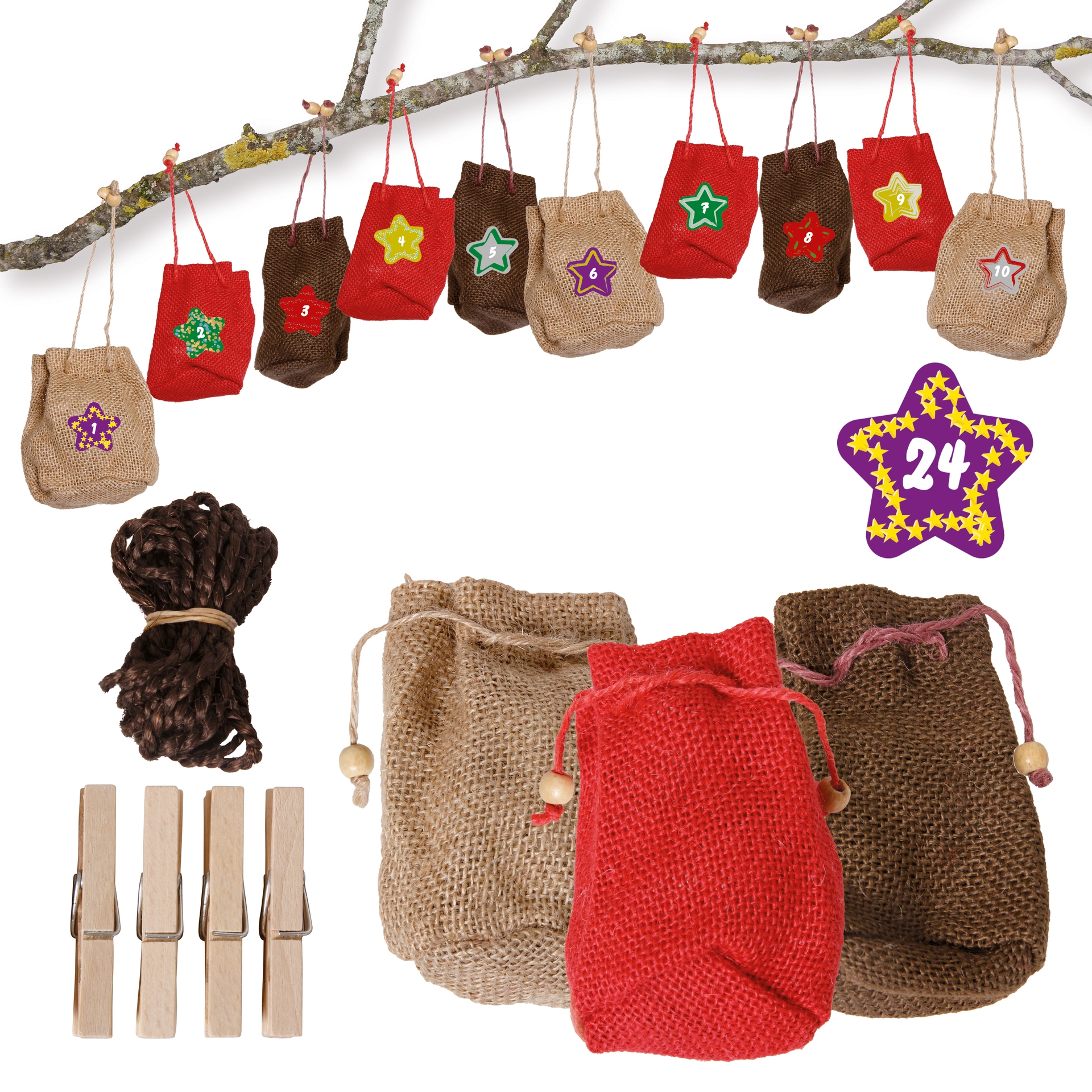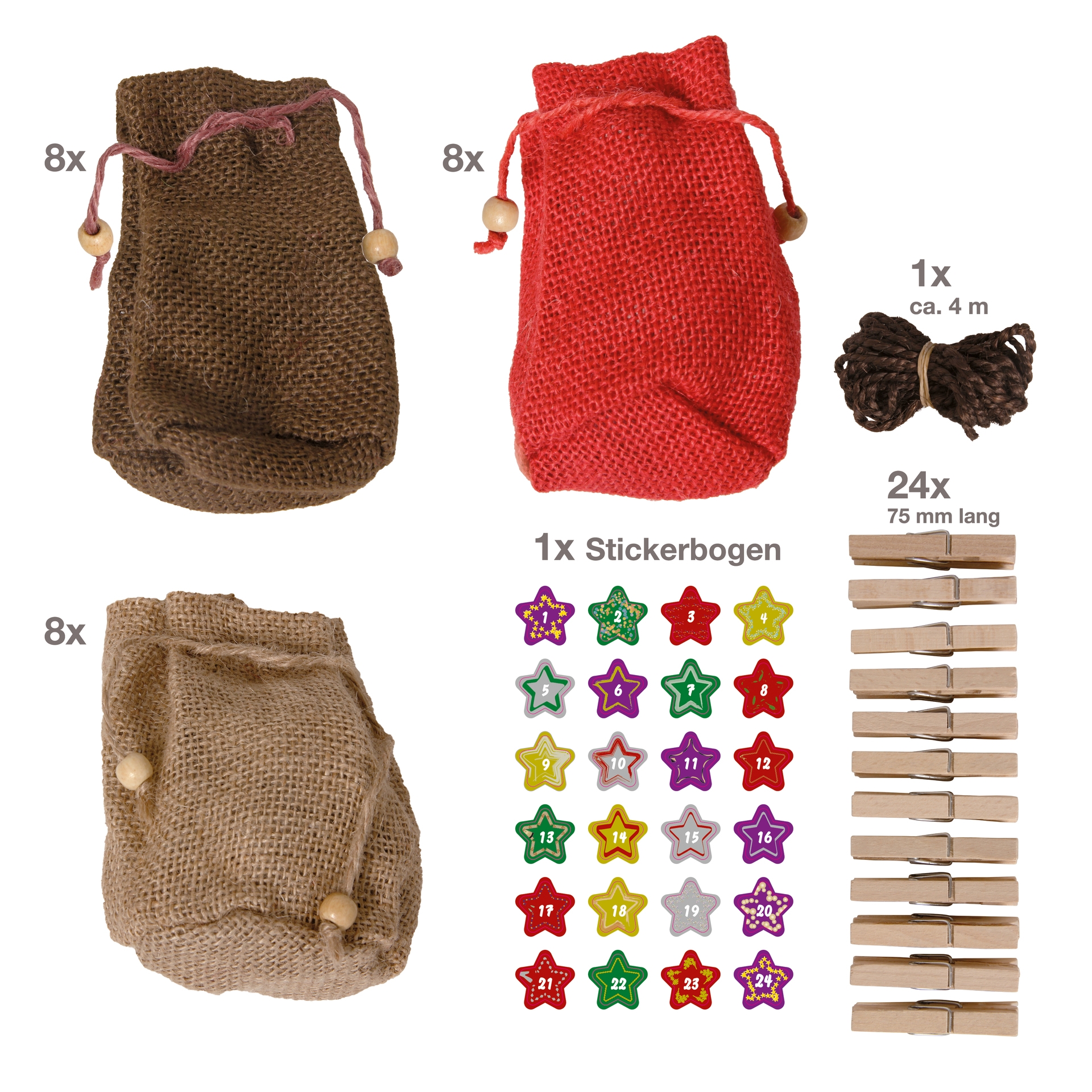 High-quality jute bags with bottoms and drawstrings in 3 different colors. They look really great and you'll be admired for them!The set contains everything you need to create a very special Advent calendar: 24 elegant bags, 24 wooden clips (clothes pegs), 4 meters of string, and decorative, extra-strong adhesive Advent numbers from 1 to 24.
