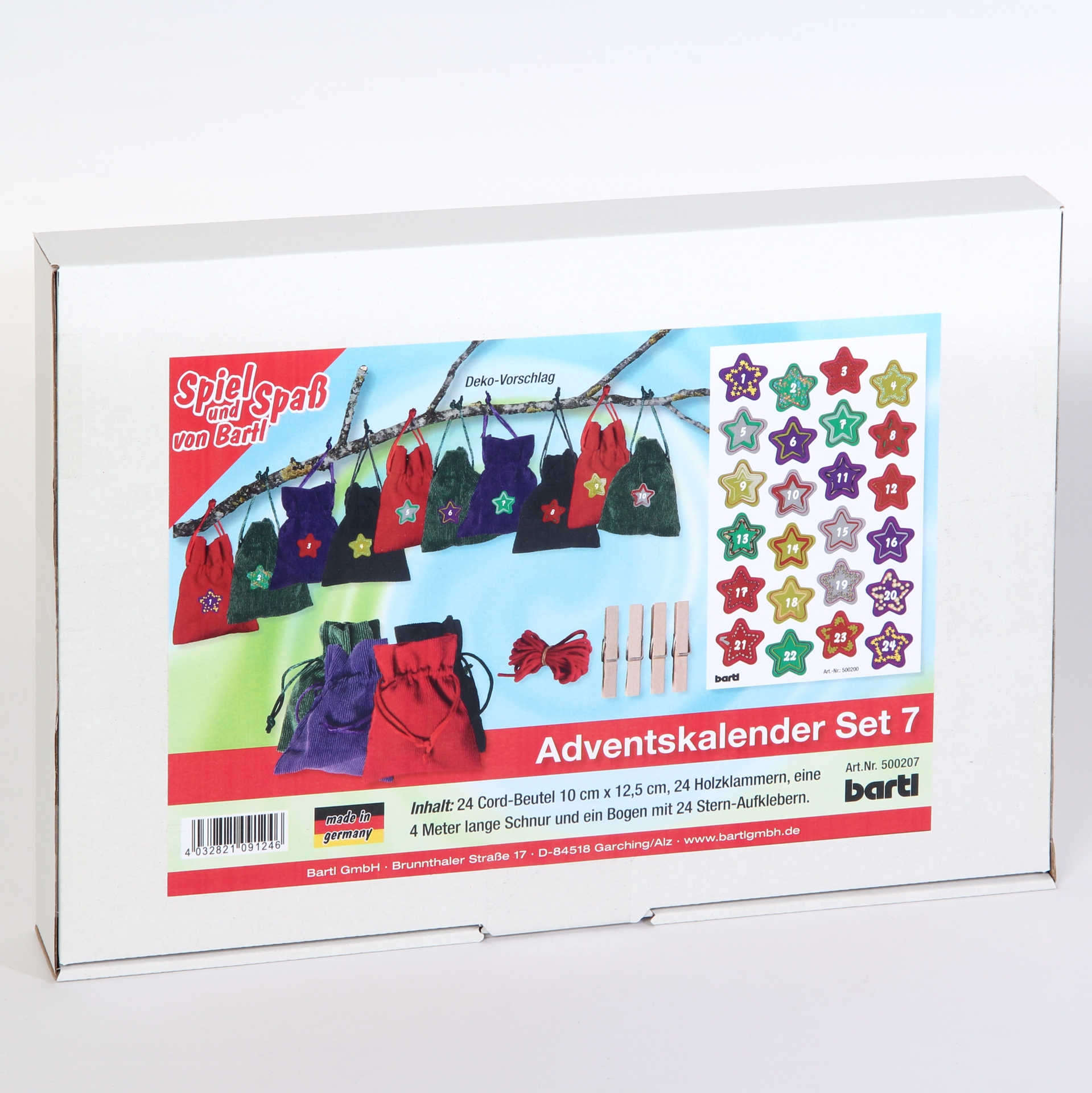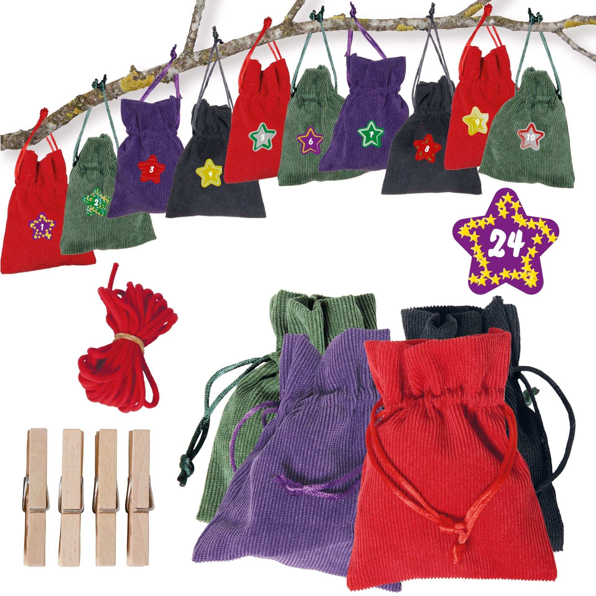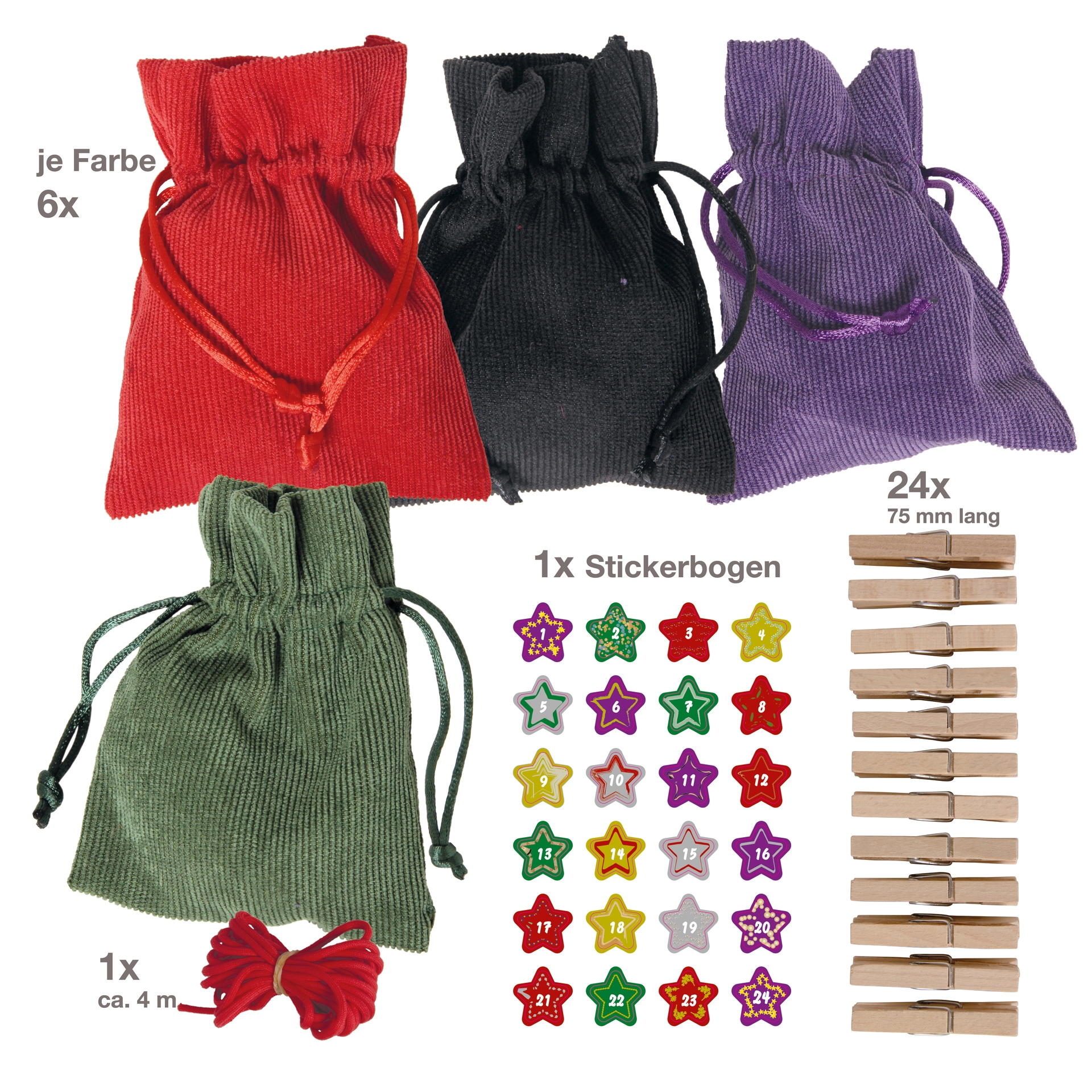 High-quality corduroy bags with drawstrings in 4 different colors. They look really great—no cheap jute or cotton. They're extraordinary, and you'll be admired for them!The set contains everything you need to create a very special Advent calendar: 24 elegant bags, 24 wooden clips (clothes pegs), 4 meters of string, and decorative, extra-strong adhesive Advent numbers from 1 to 24.