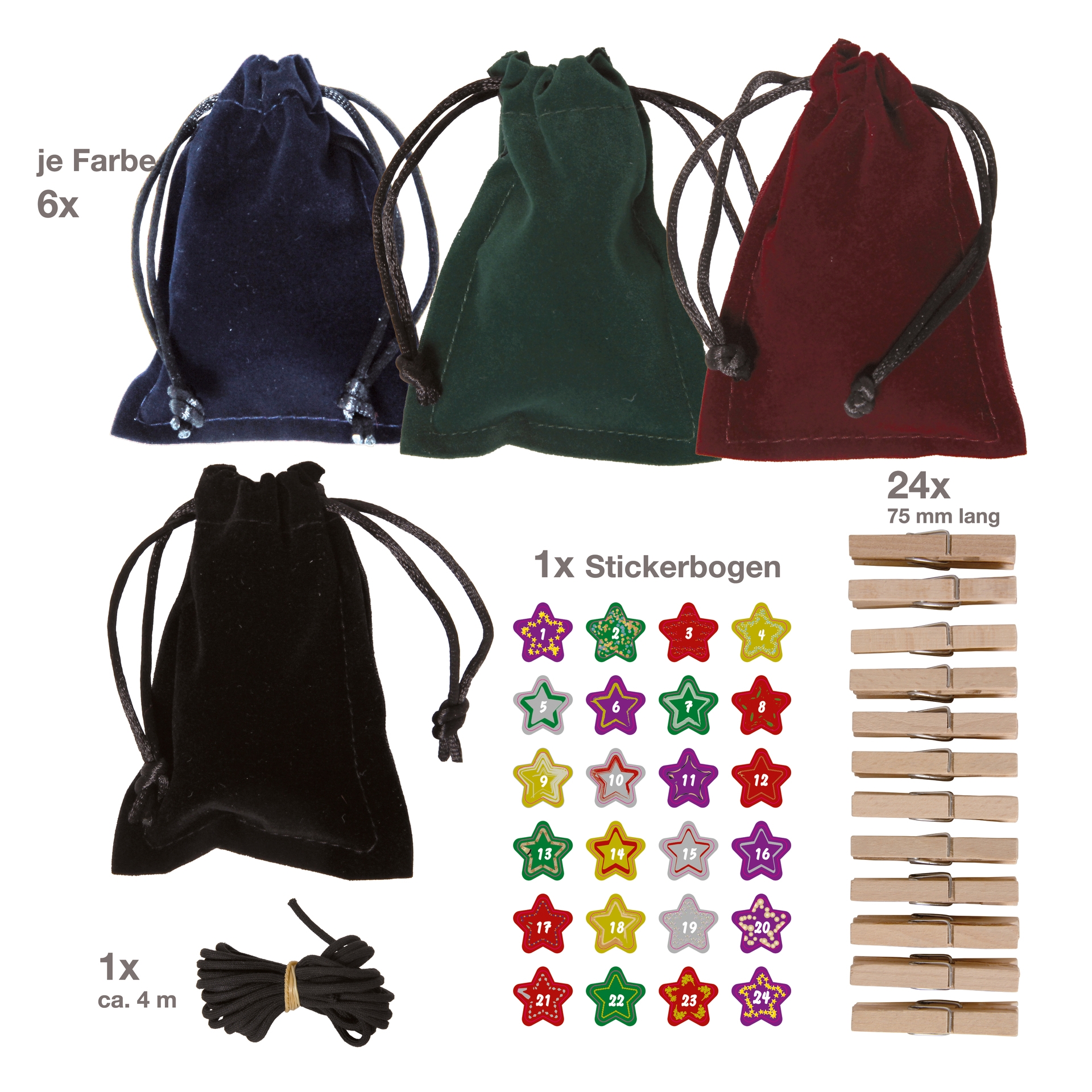 High-quality velvet bags with drawstrings. They look really great—no cheap jute or cotton. They're extraordinary, and you'll be admired for them!The set contains everything you need to create a very special Advent calendar: 24 elegant bags, 24 wooden clips (clothes pegs), 4 meters of string, and decorative, extra-strong adhesive Advent numbers from 1 to 24.