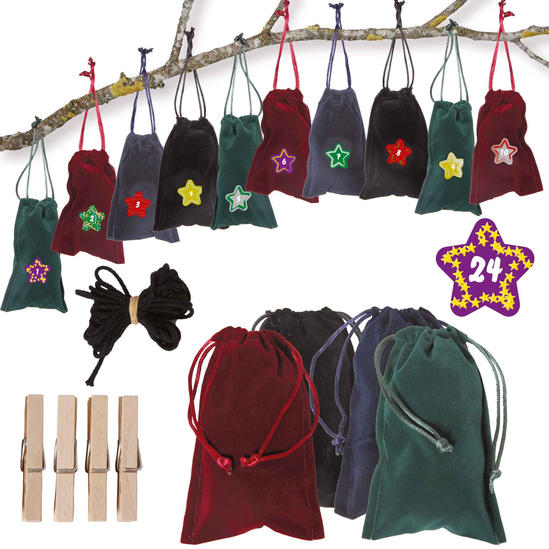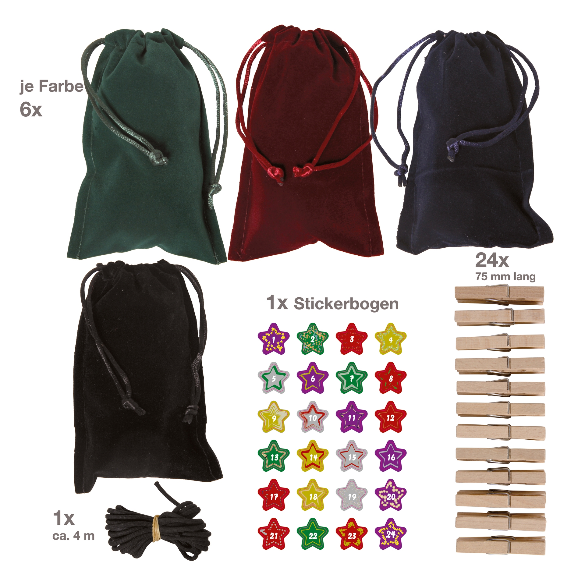 High-quality velvet bags with drawstrings. They look really great—no cheap jute or cotton. They're extraordinary, and you'll be admired for them!The set contains everything you need to create a very special Advent calendar: 24 elegant bags, 24 wooden clips (clothes pegs), 4 meters of string, and decorative, extra-strong adhesive Advent numbers from 1 to 24.