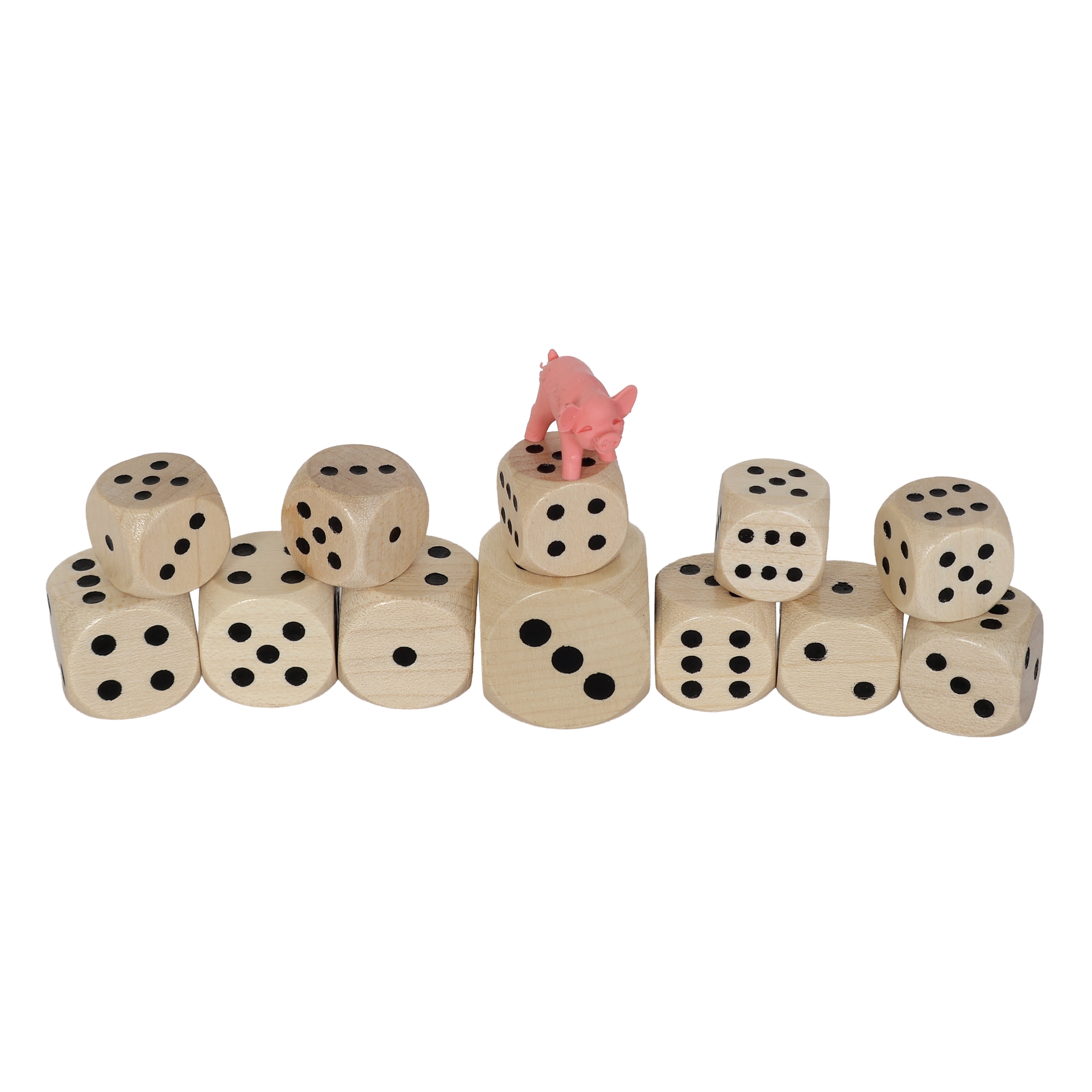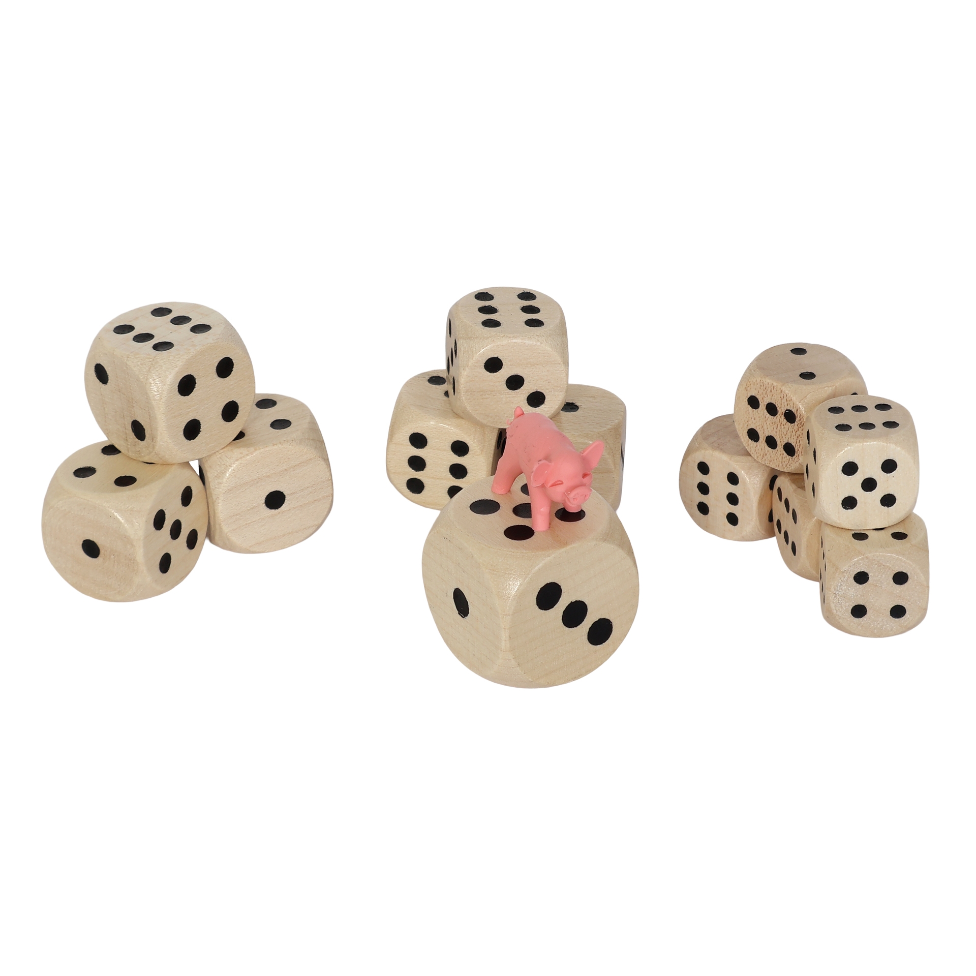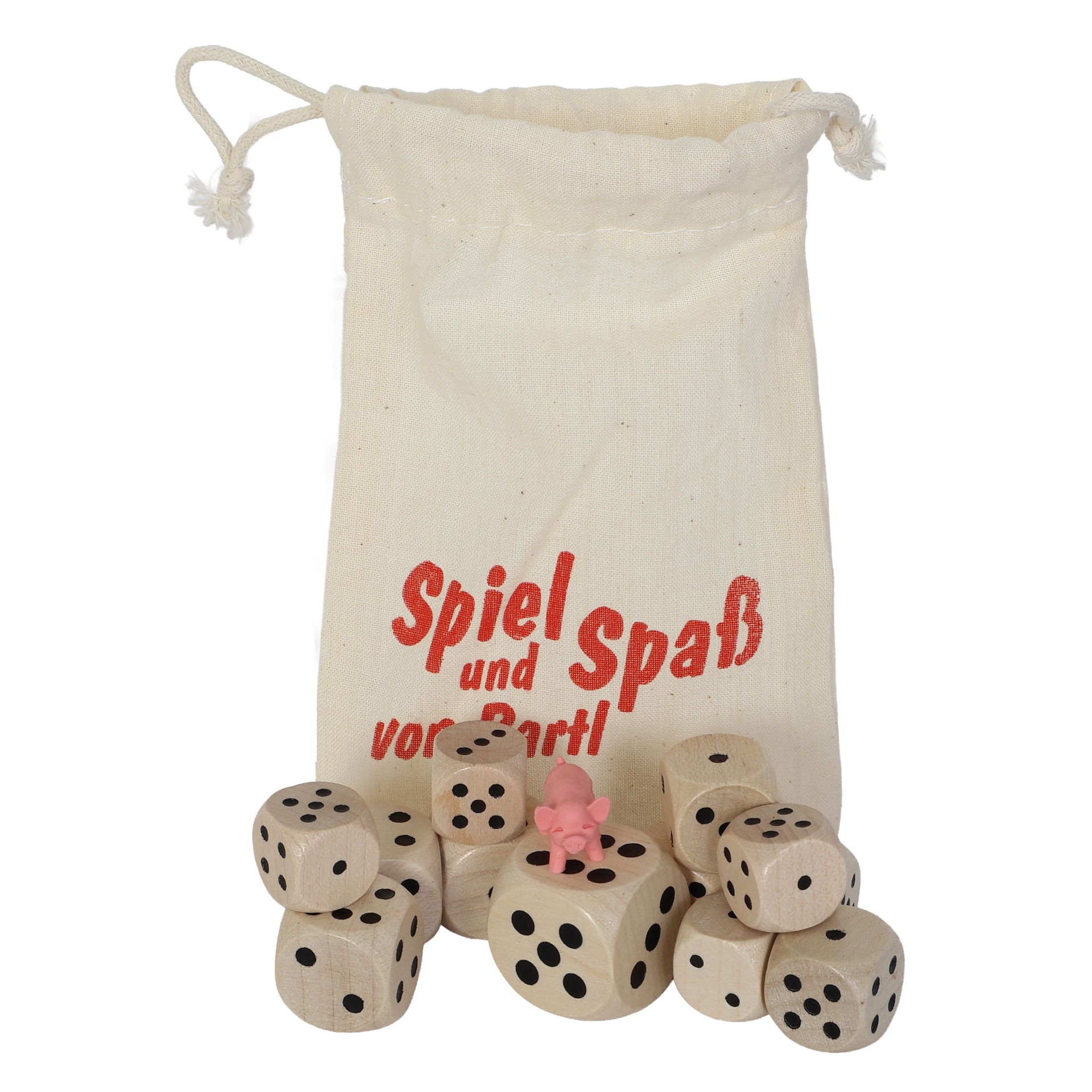 The practical cotton drawstring bag contains 12 embossed wooden dice in various sizes for all situations:1 x 25 mm dice