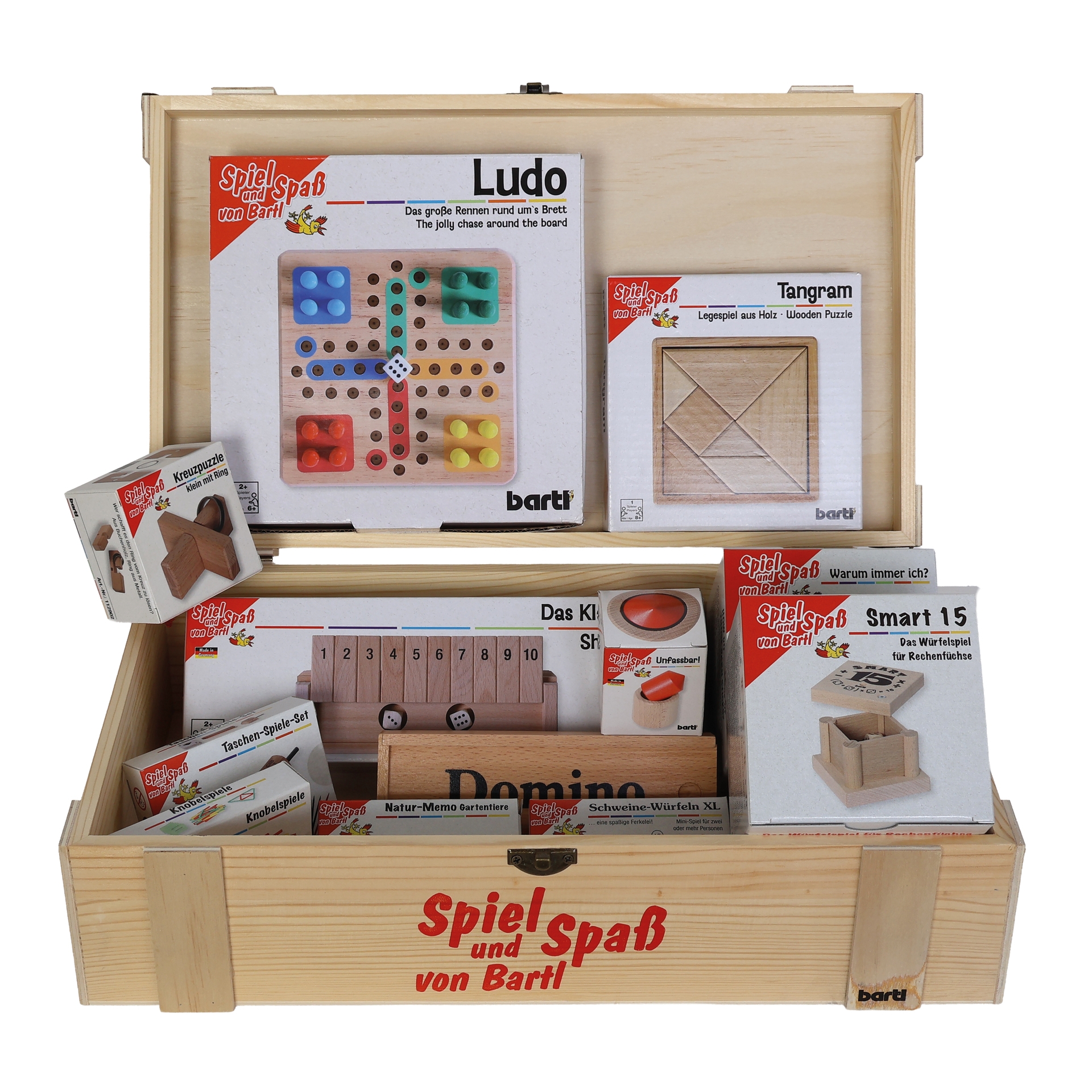 The high-quality wooden box comes packed with 12 Bartl classics and offers the best gaming fun for the whole family! Included are:Warum immer ich ??? – the tricky dice game where the aim is to get rid of your sticks as quickly as possible.