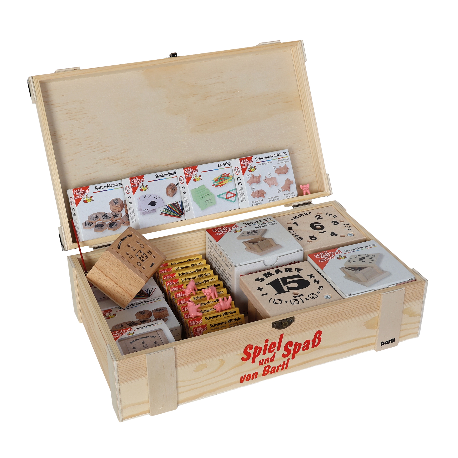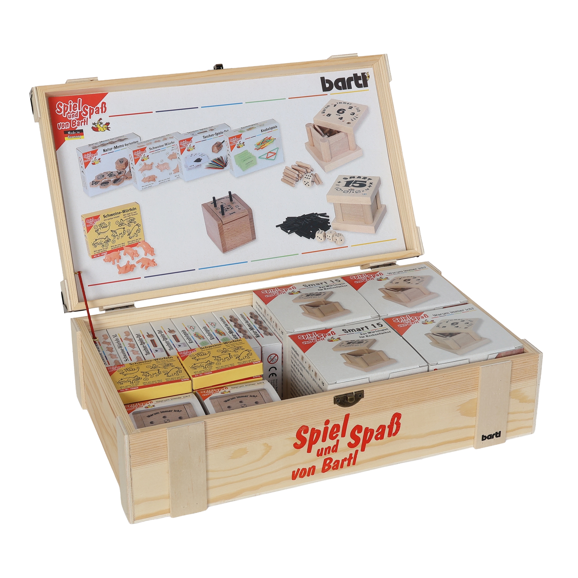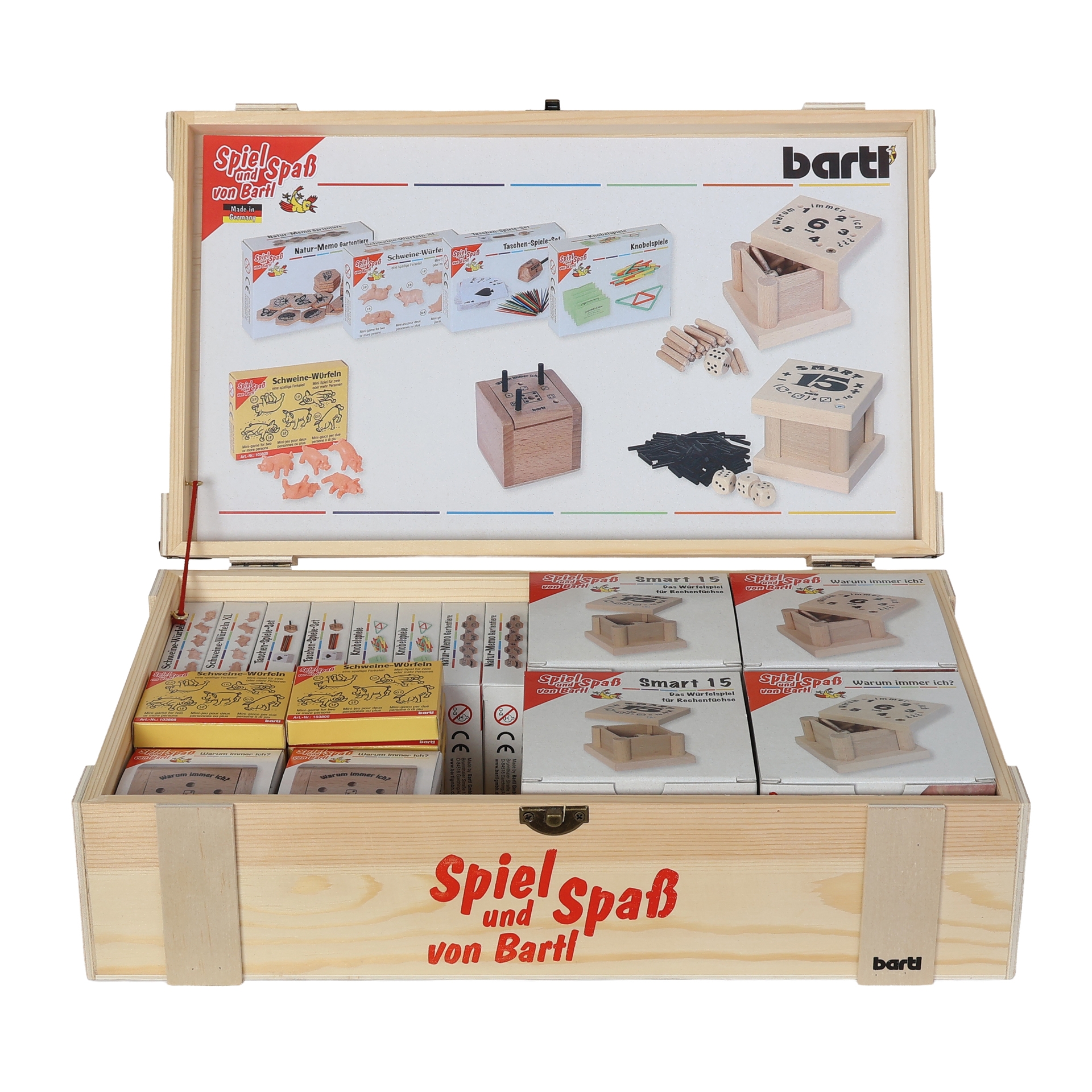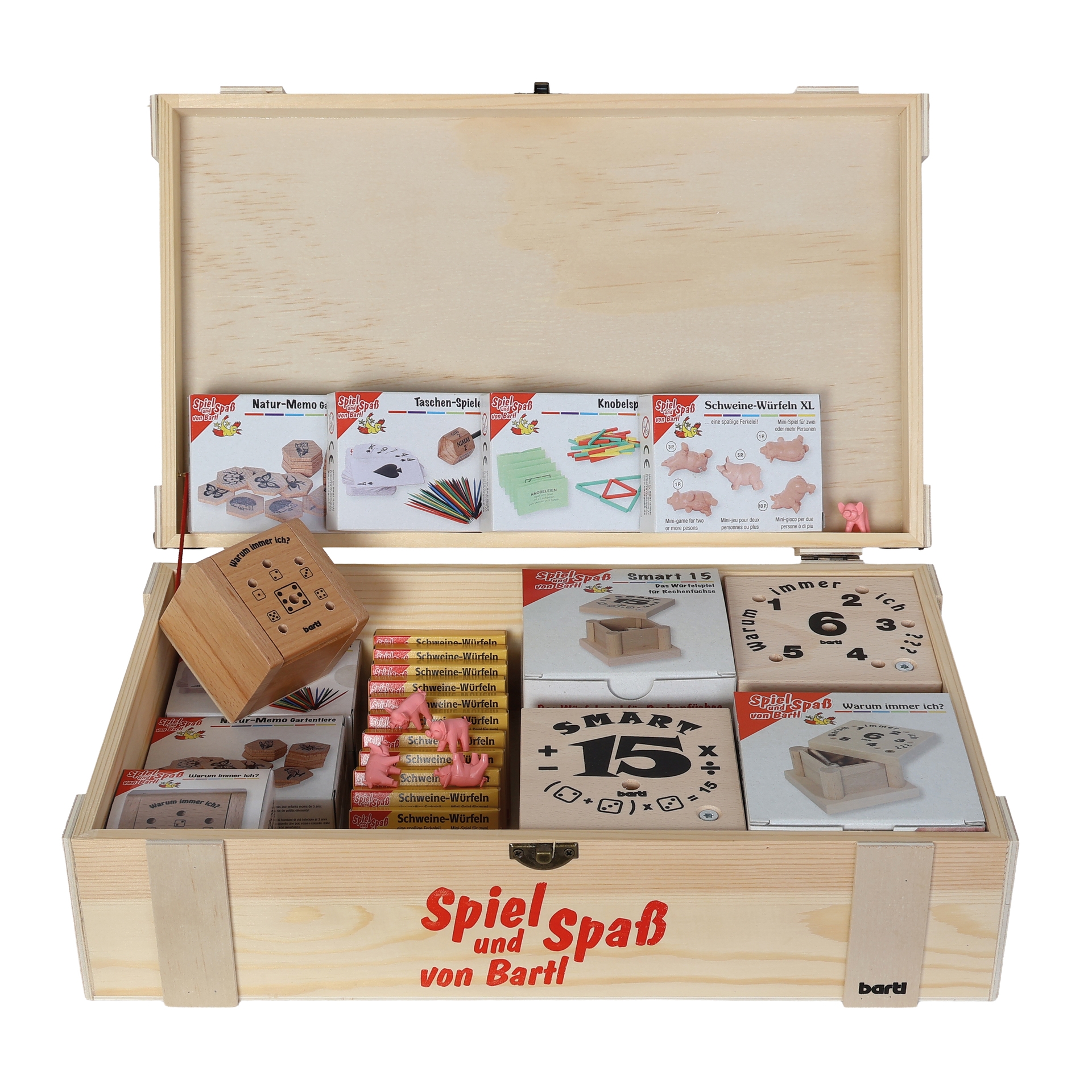The high-quality wooden box, which serves as a sales display that can be refilled again and again, contains the following Bartl classics:2 x Warum immer ich ??? – the tricky dice game in which the aim is to get rid of your sticks as quickly as possible.
