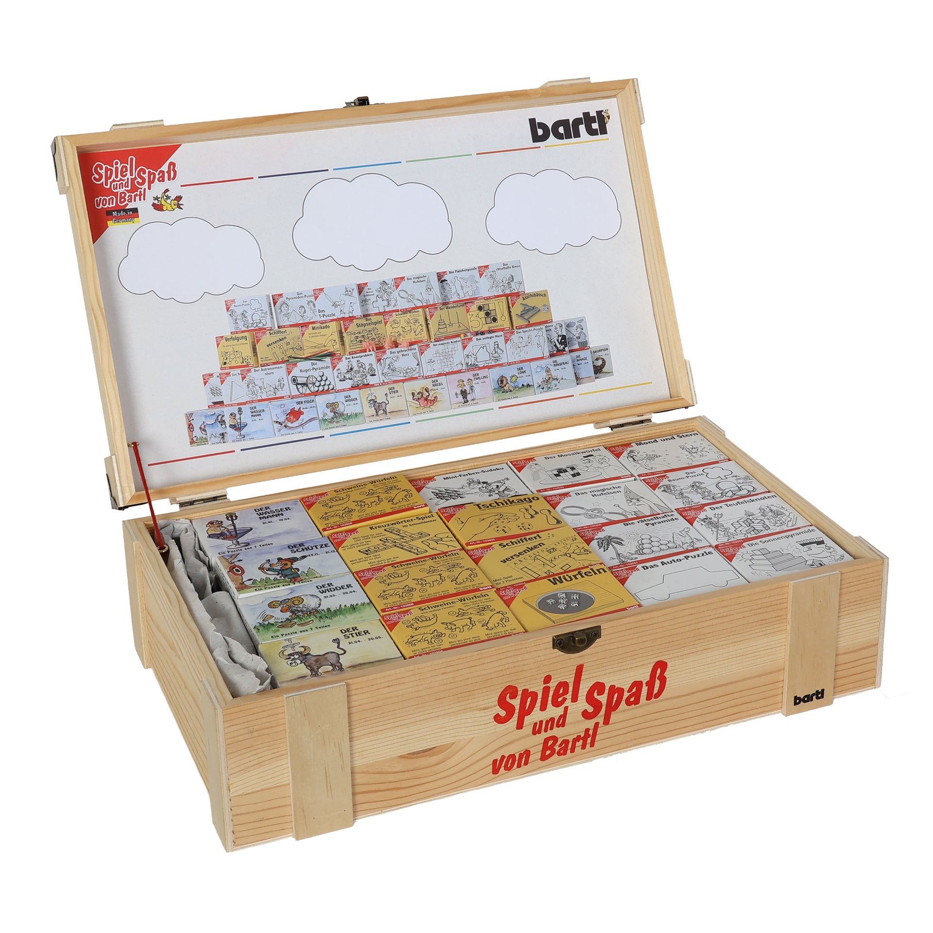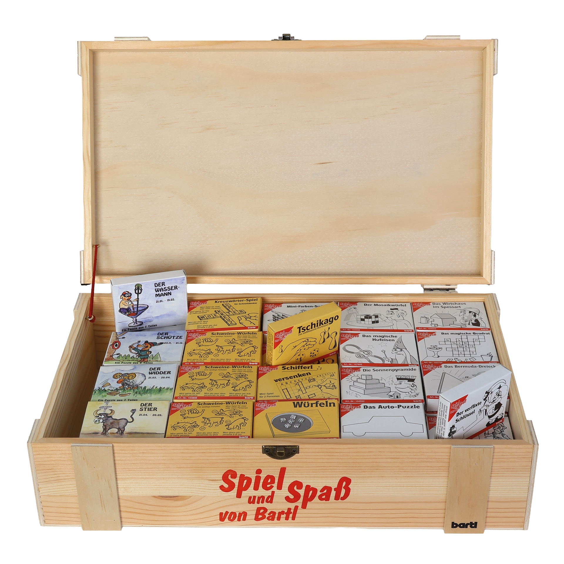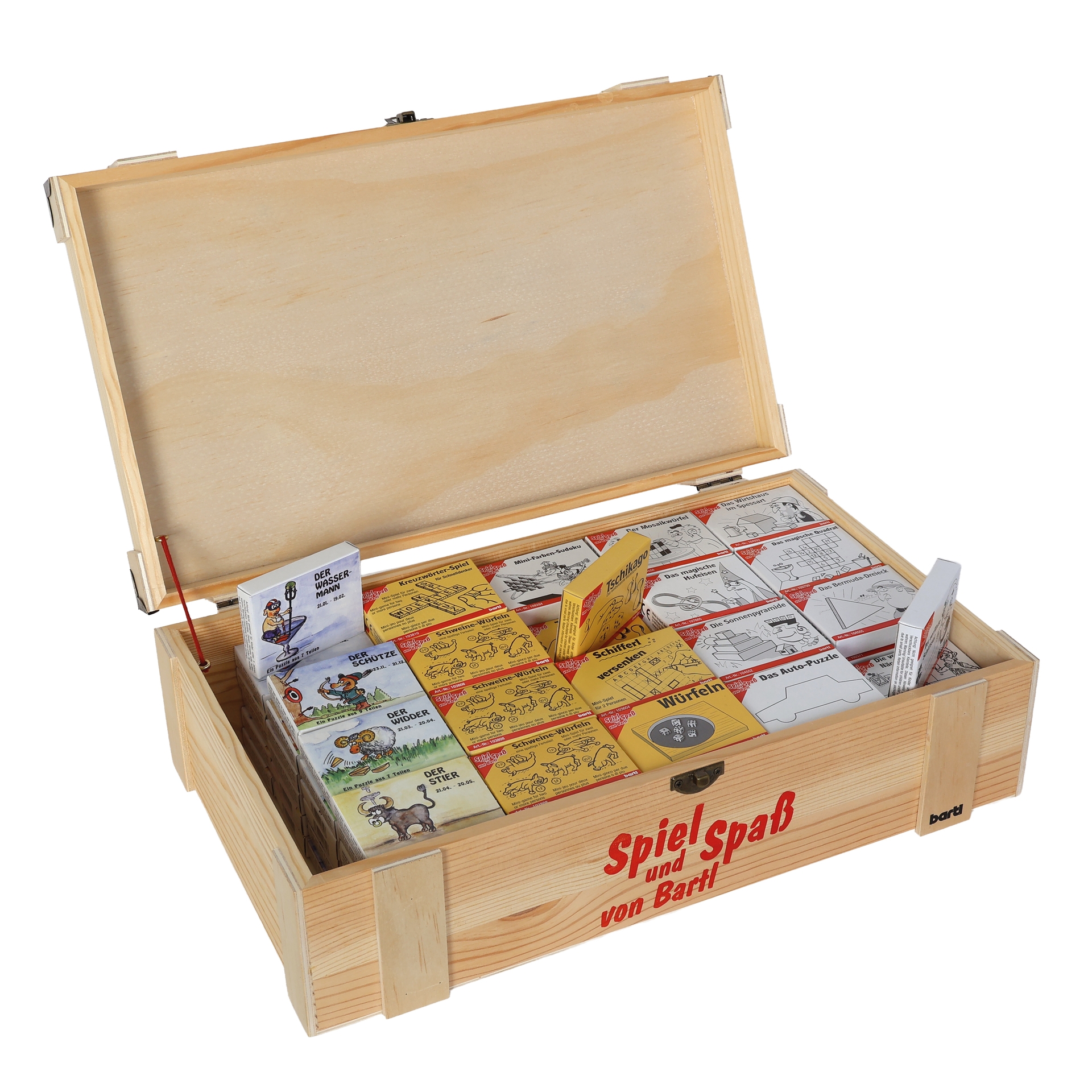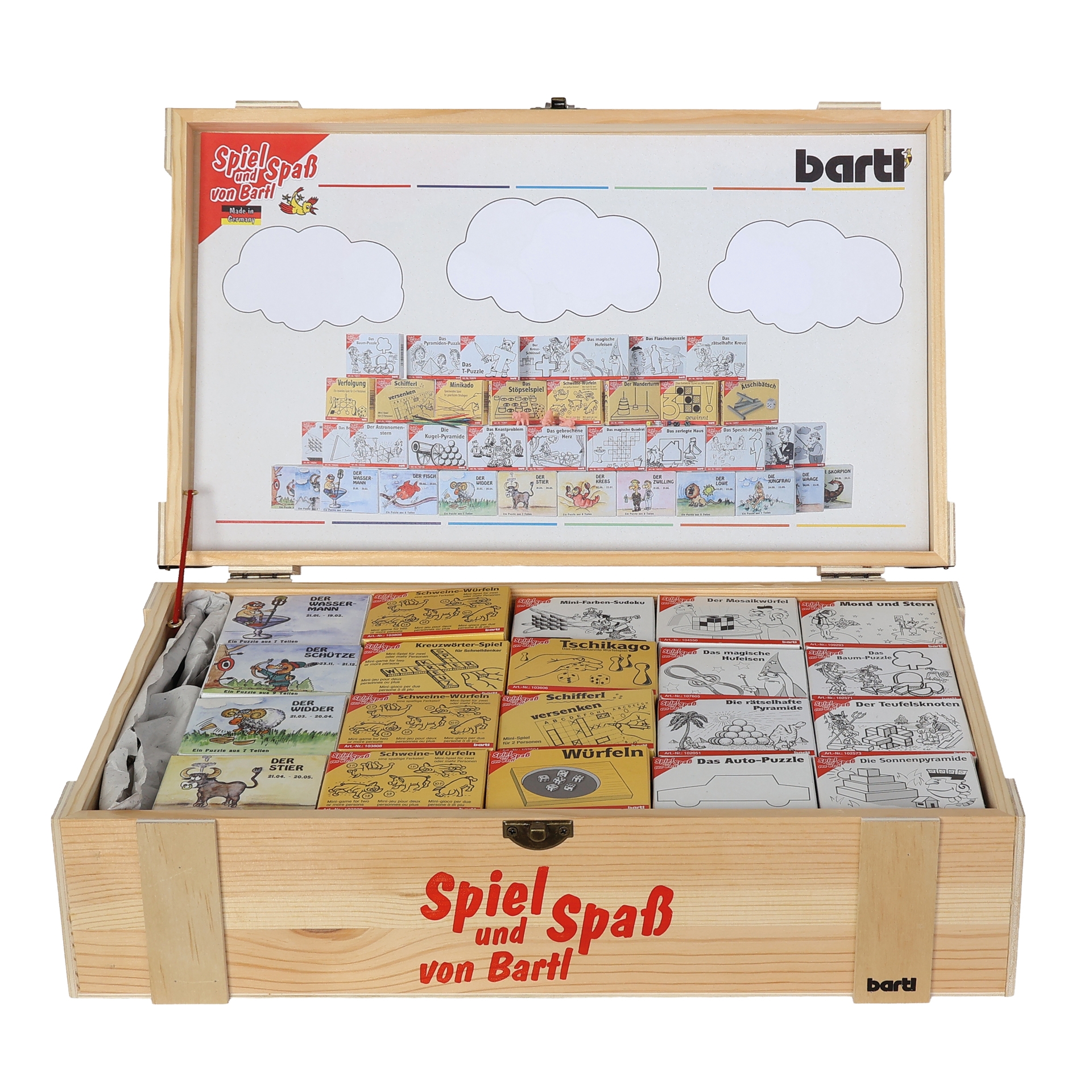 The high-quality wooden box, which serves as a refillable sales display, contains a total of 120 puzzles and games:54 x Bartl-Mini-Puzzles, assorted