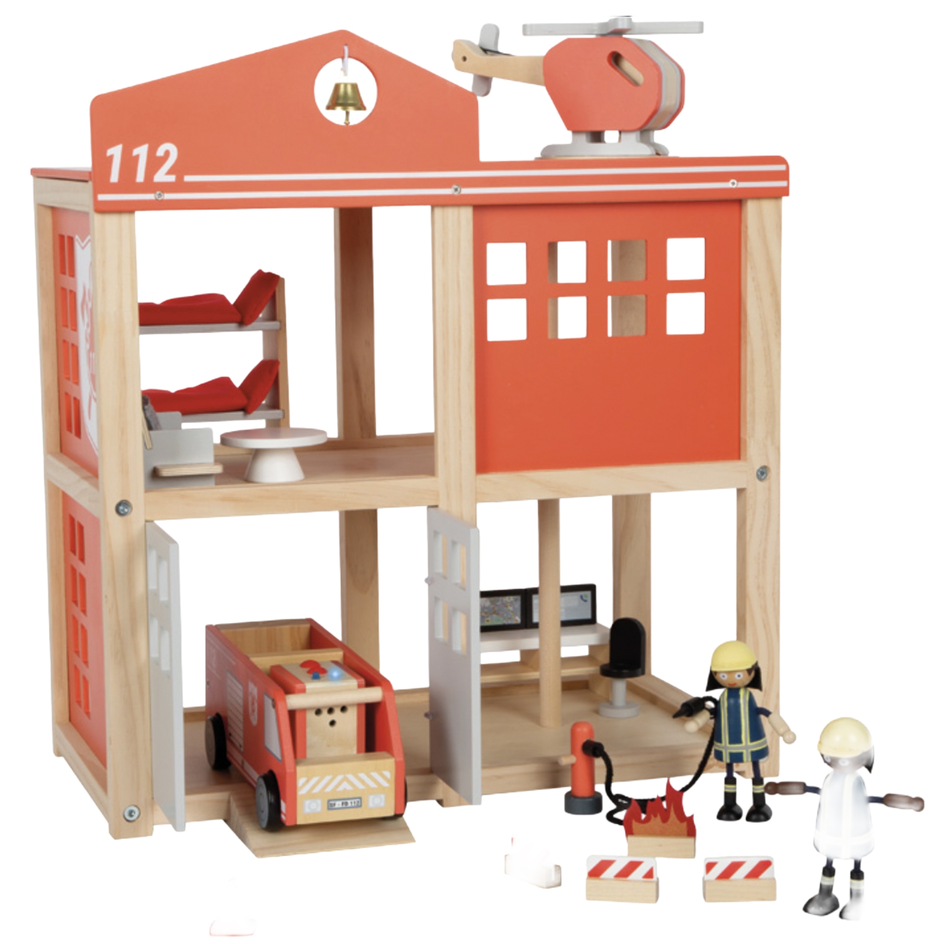 The extensive accessories include a battery-operated sound and light module for realistic operations, a fire truck, a helicopter with a winch, two bendable dolls, a hydrant with a hose, fire displays, pylons, barrier fences, a furnished command center, and a lounge with bunk beds, a sofa, and a coffee table. The workshop area is equipped with elastic band doors and a ramp for driving in.Warning! Not suitable for children under 36 months!