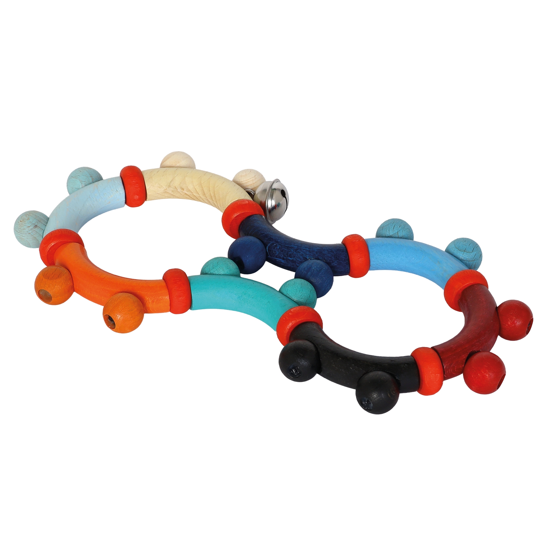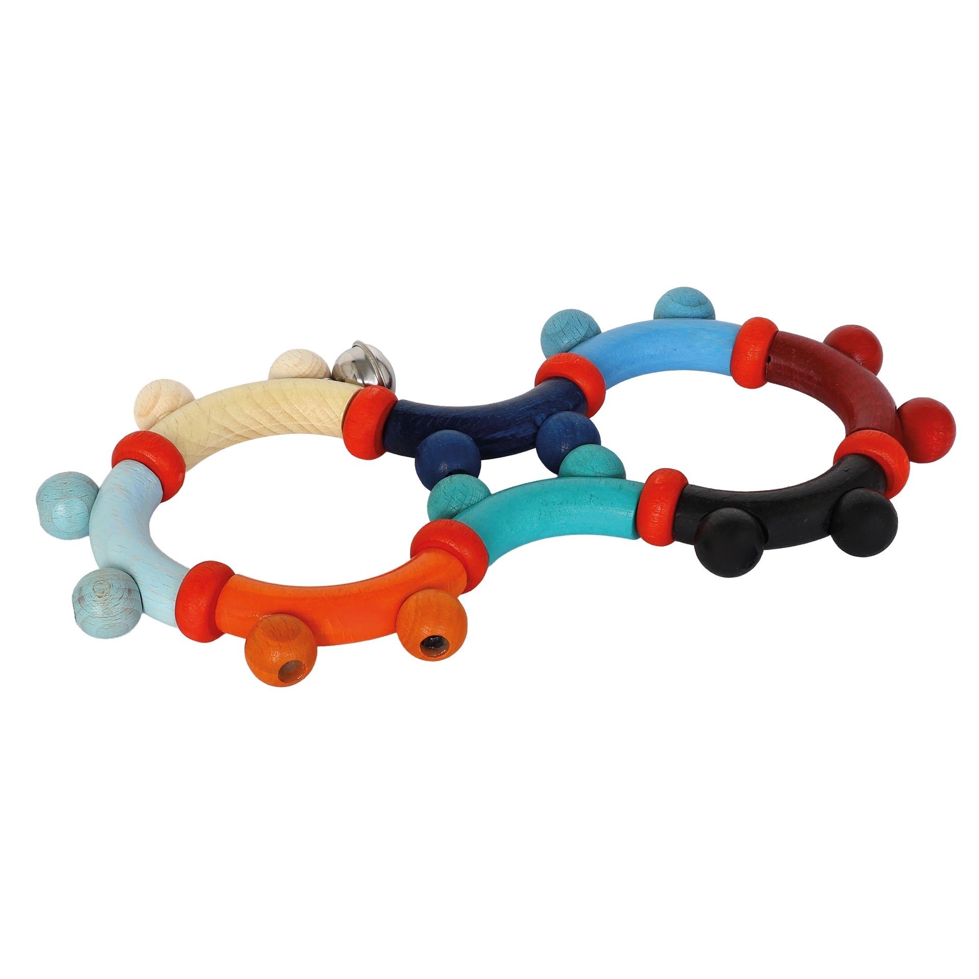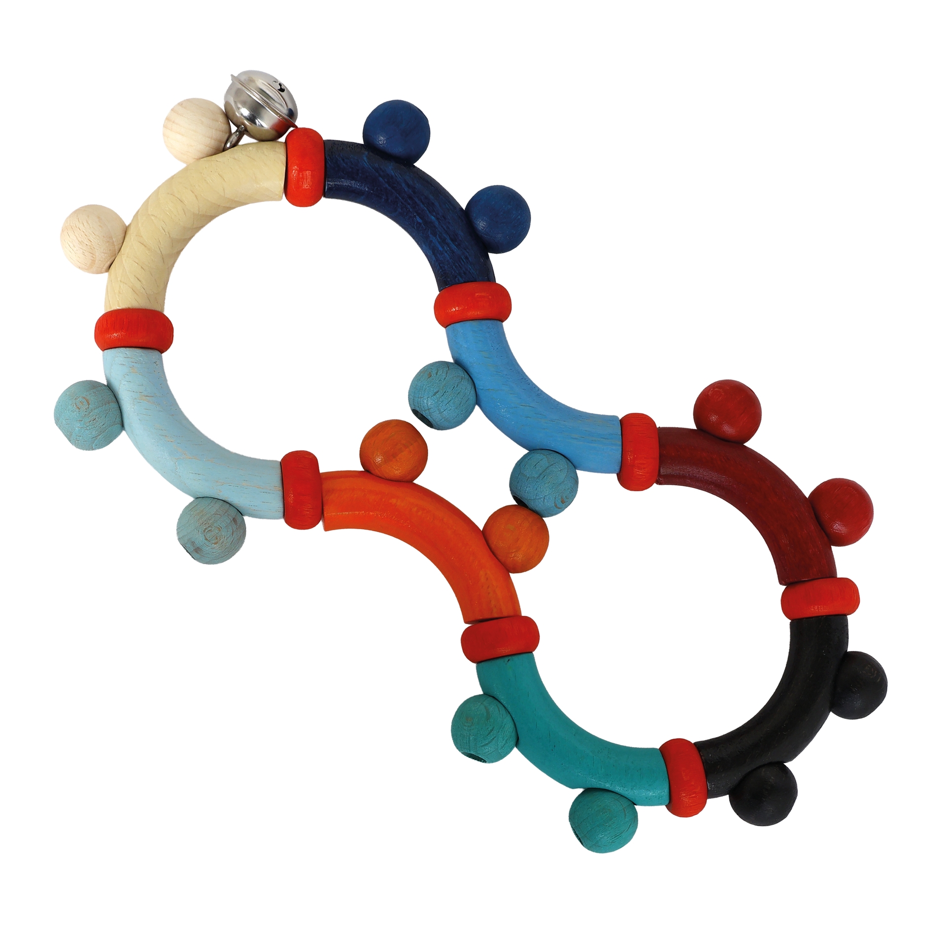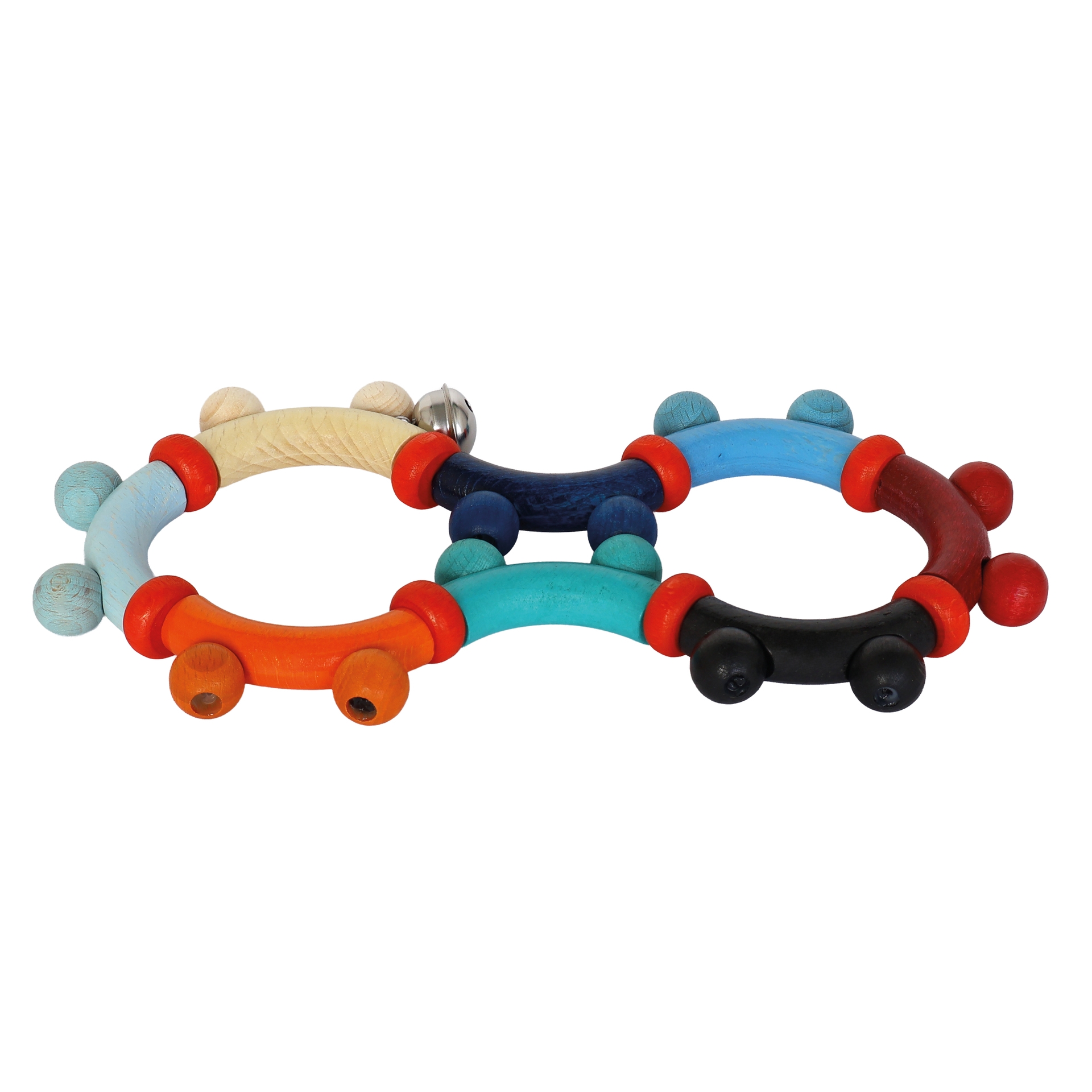 Come and discover! The small bell rings and the baby can bend the toy, while the baby's palms are being massaged by the wooden pearls.