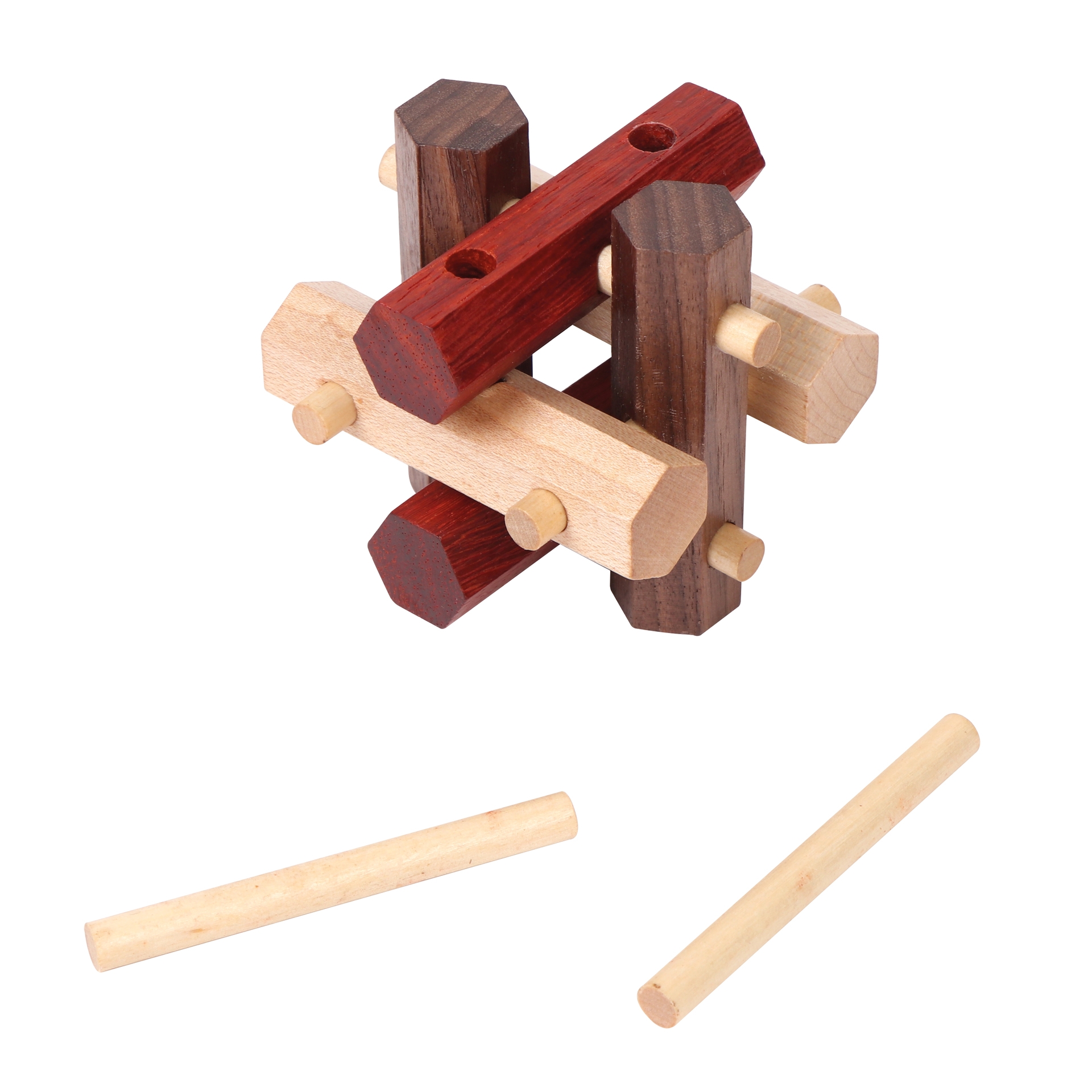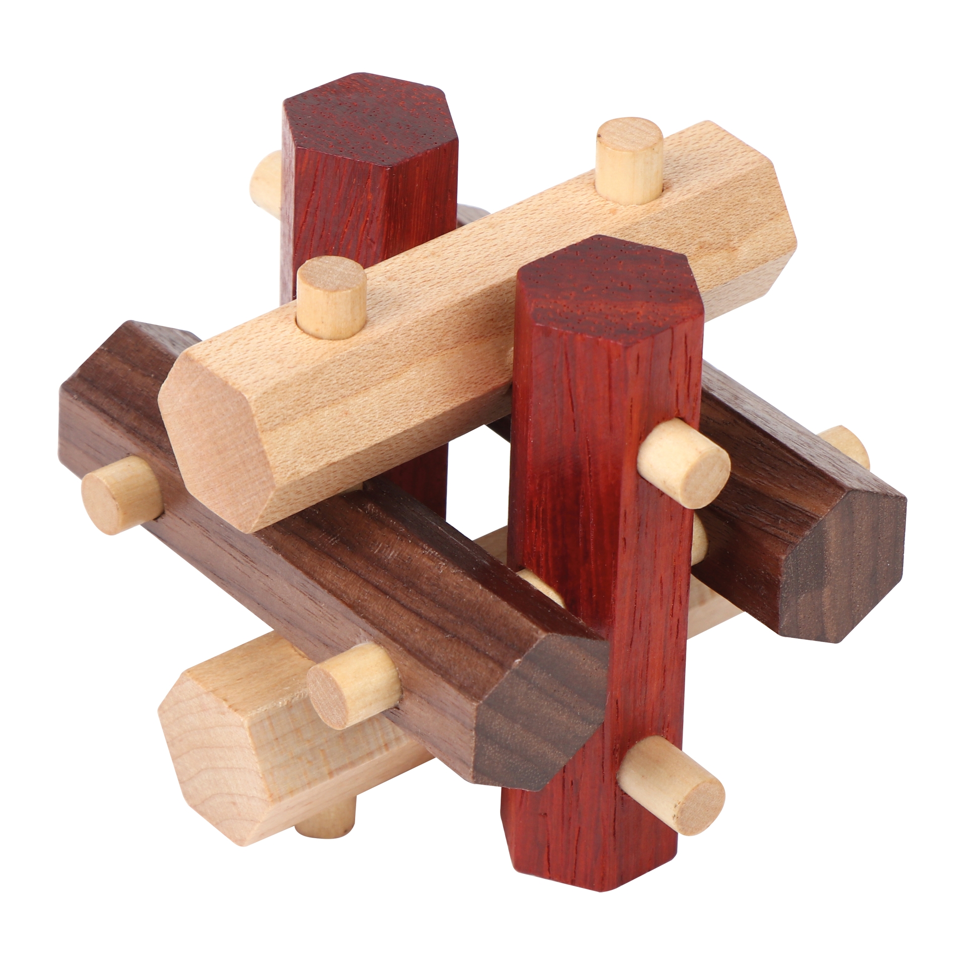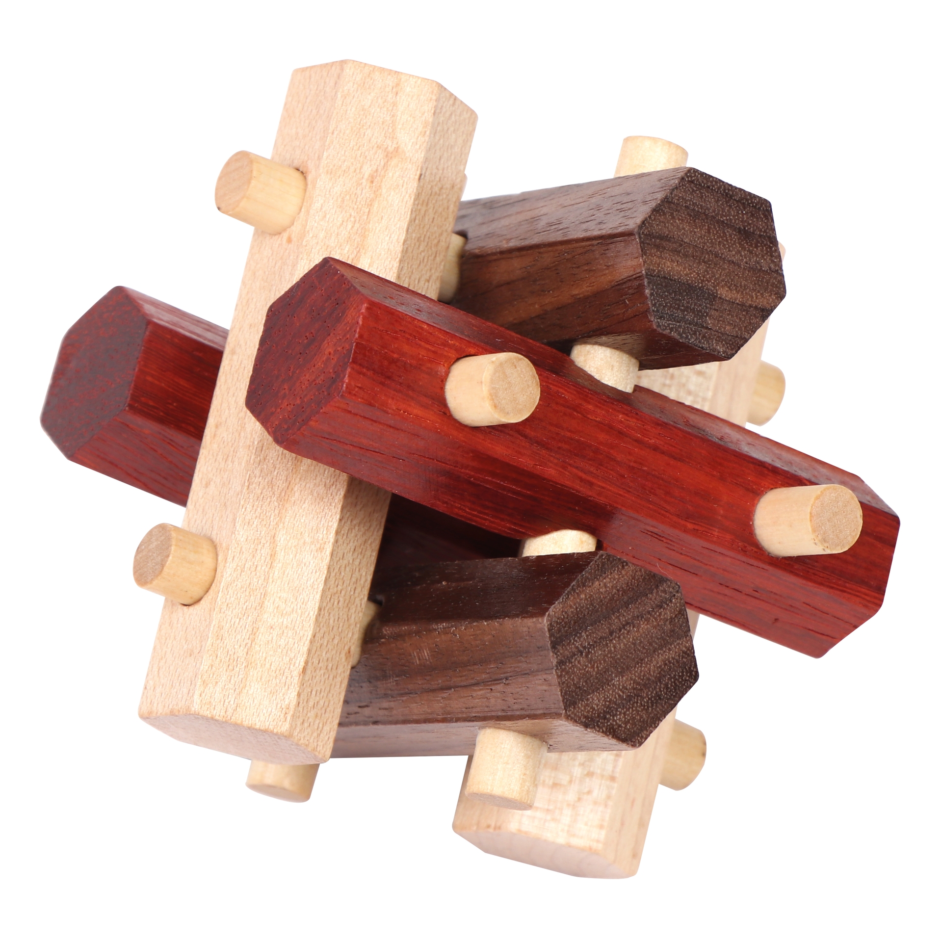 A combination of Stewart T. Coffin's'Nest' designs and his 'Pin-Hole' puzzle. Both created in 1976. This design is a light version of his Cuckoo's Nest and Locked Nest. Here the holes have been drilled at a 90° angle, while Stewart used a 70° angle. When assembling or disassembling this Nest-Pin puzzle, the relationship with his Pin-Hole design becomes clear. Stewart T. Coffin, born in 1930, is an American puzzle maker and is considered by many to be one of the best designers of polyhedral interlocking puzzles in the world.- 12 pieces made of padauk, walnut, and maple