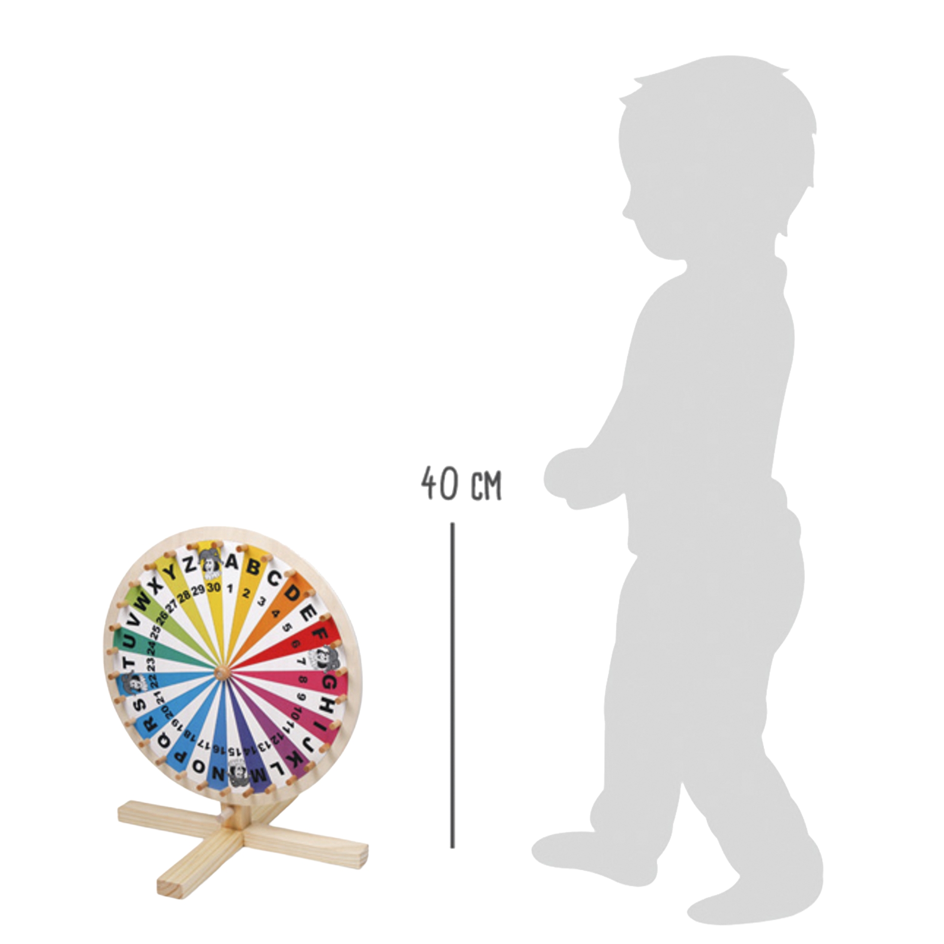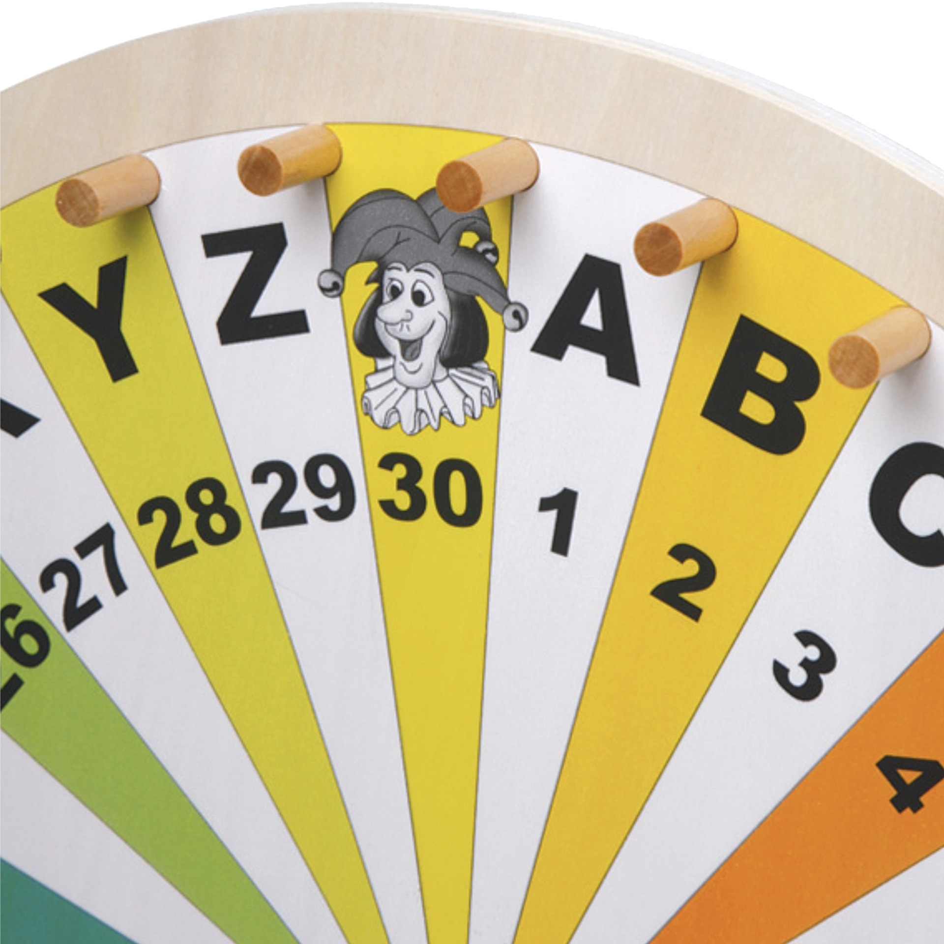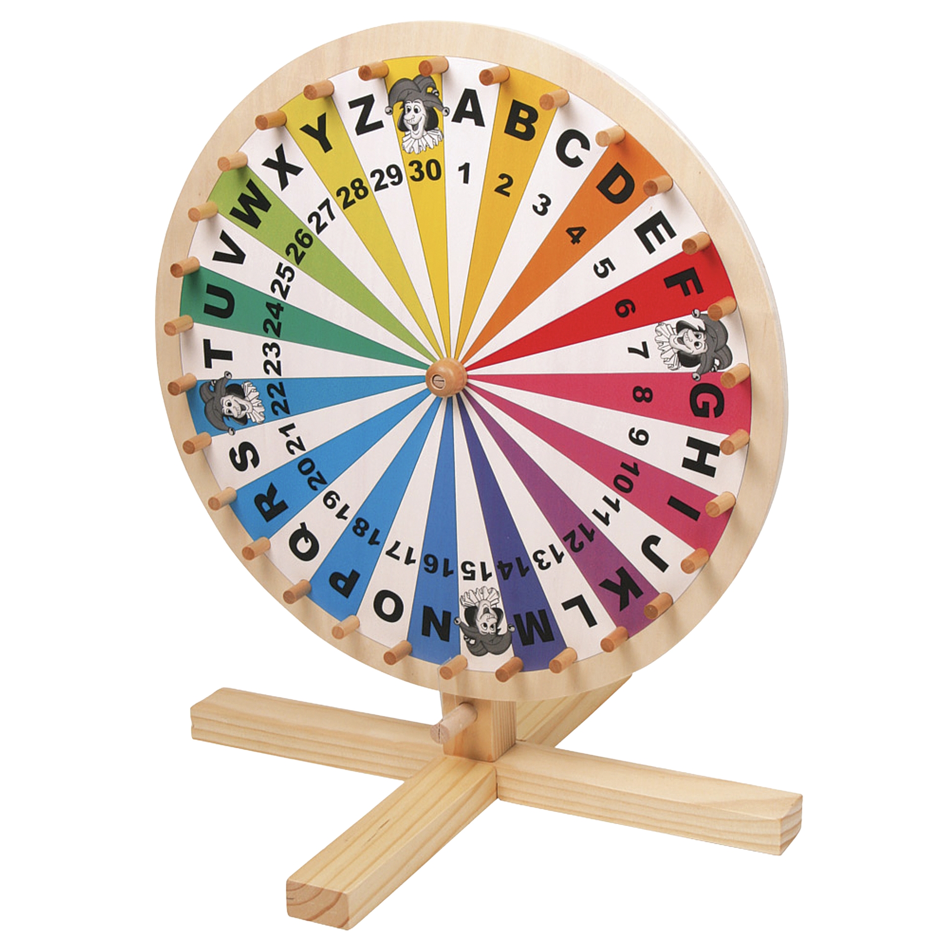 Small, classic wooden wheel of fortune, approximately 40 cm tall.Features an attractive, colorful design with the numbers 1 to 30, the letters A to Z, and four joker spaces.