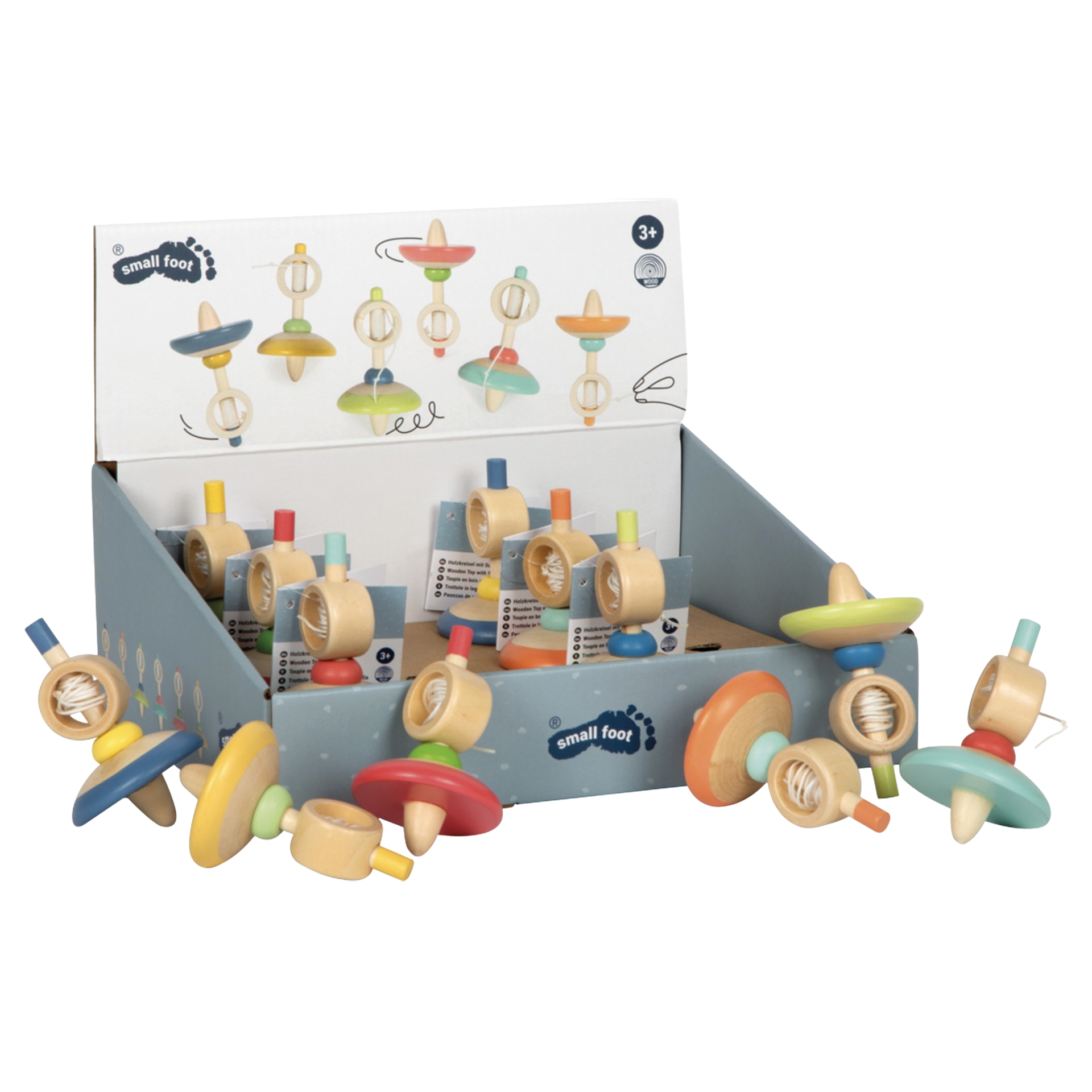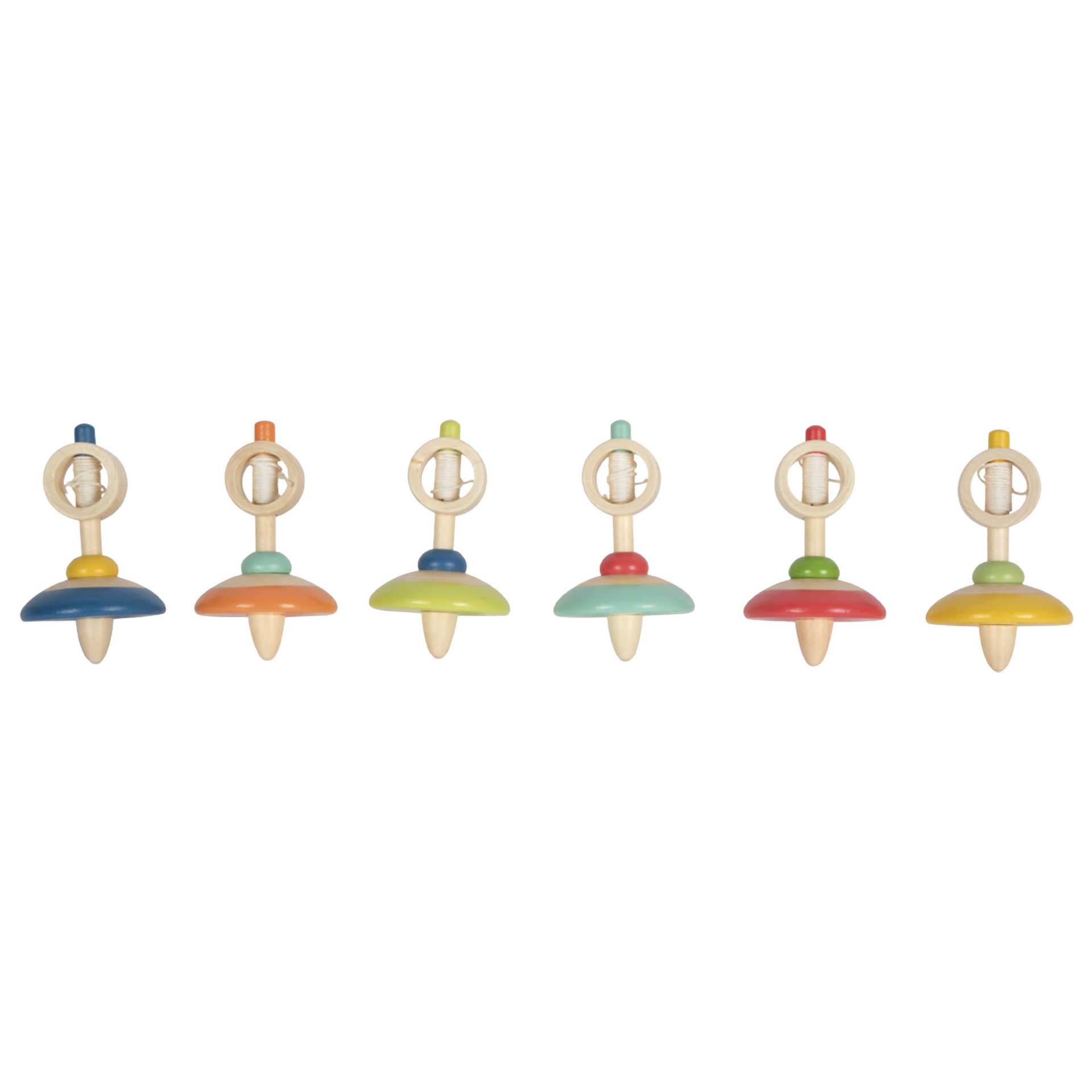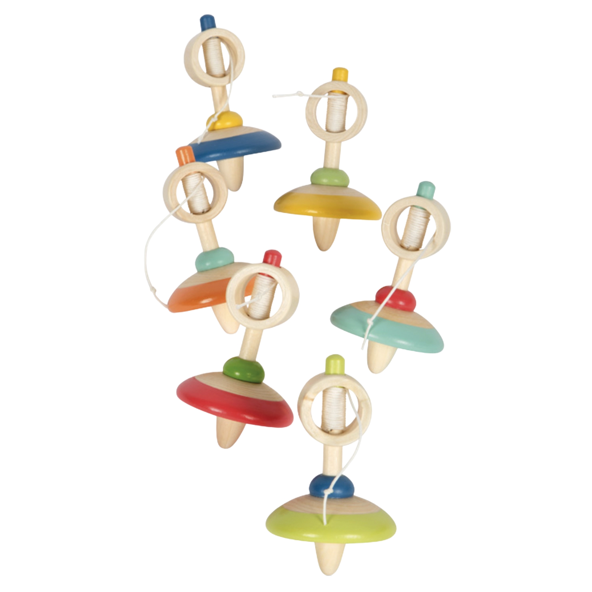 Holzkreisel mit Schnur, sortiert